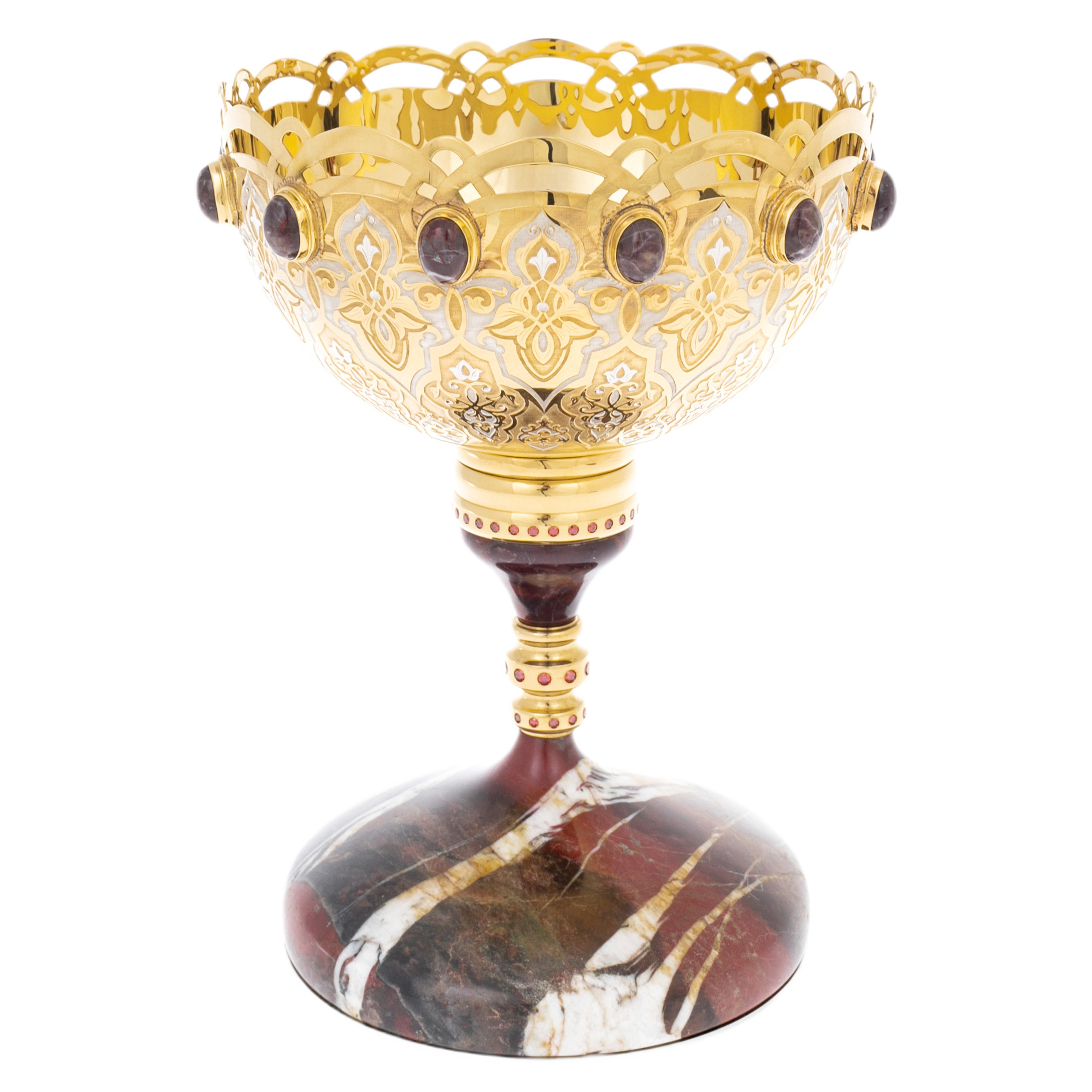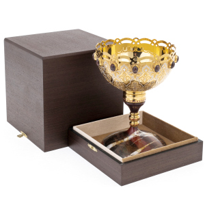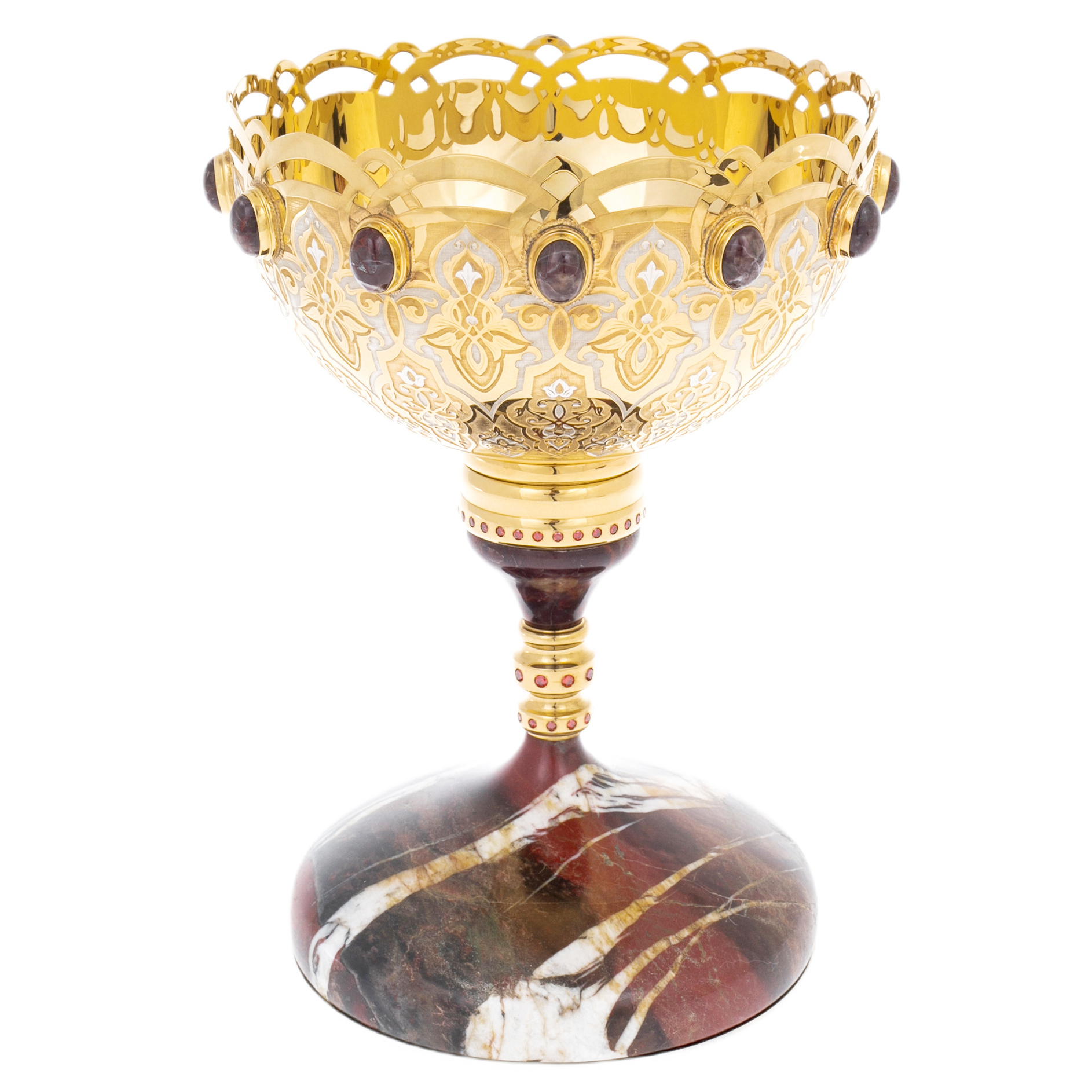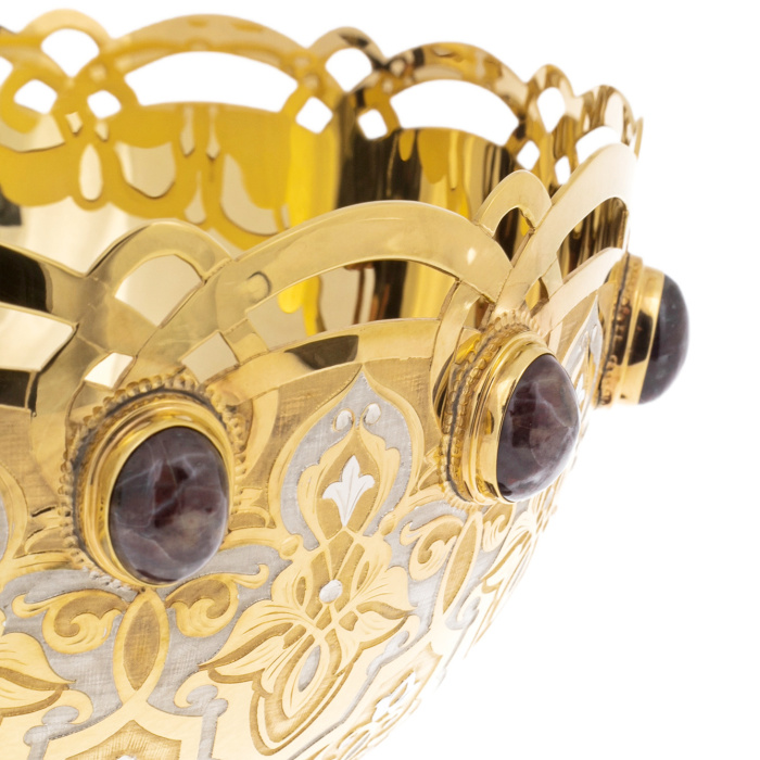 Златоустовская школа узнаётся в характере декора: тонкая гравировка, выстроенная в строгий орнамент, подчеркнута контрастами полированных и матовых плоскостей, а золочение ложится ровным, живым светом, усиливая глубину рисунка. Ажурный верхний пояс чаши напоминает корону, собранную из плавных арок и прорезей, — металл, будучи прочным, выглядит кружевным, сохраняя безупречную геометрию линий. Ритм повторяющихся мотивов поддержан декоративными ободками на ножке, где сияние золота перекликается с точечными акцентами красного тона, создавая ощущение законченной ювелирной композиции.