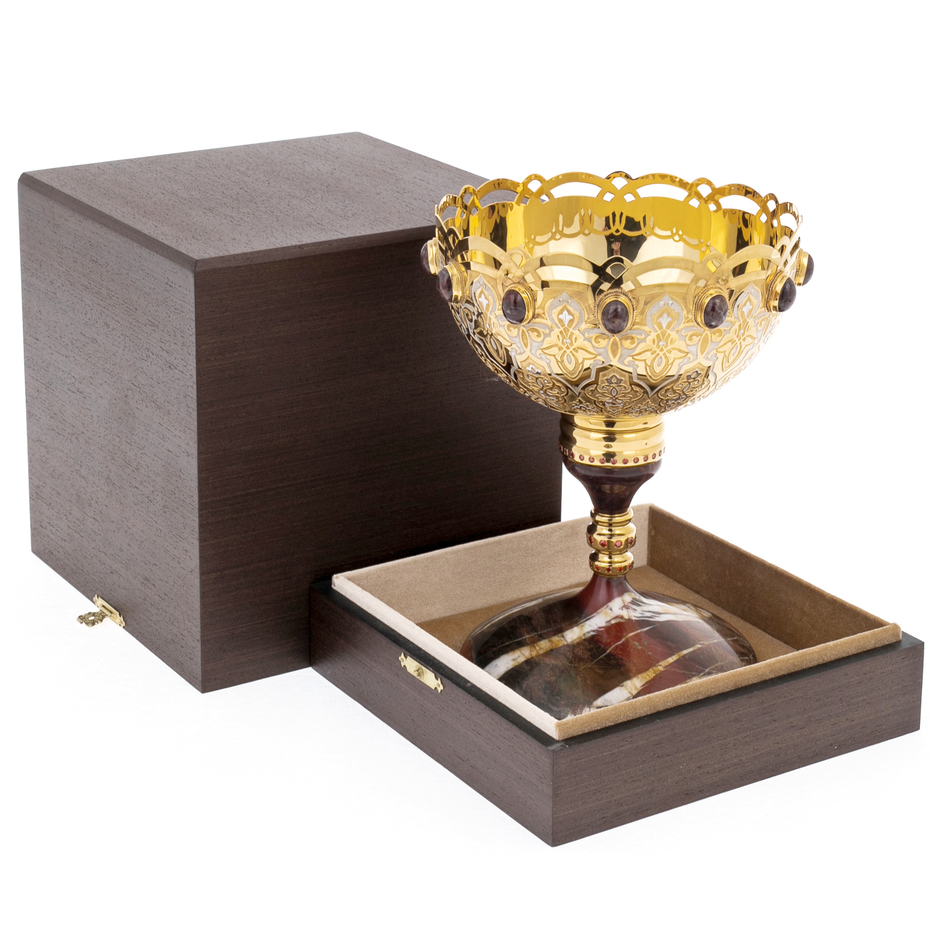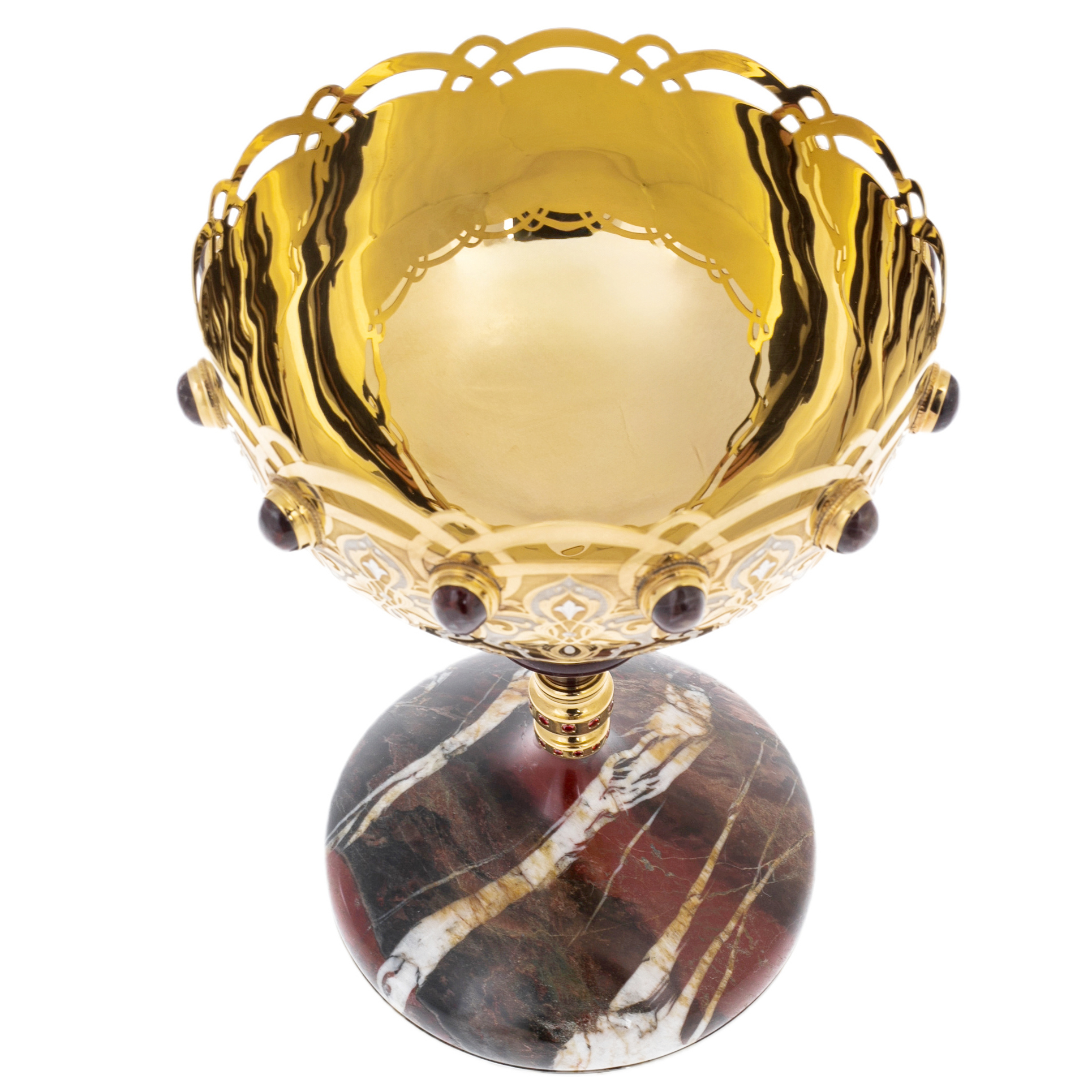 Ваза для фруктов и конфет "Царская" на ножке из яшмы — интерьерный акцент, созданный для домов, где ценится не утилитарность, а представительность каждой детали. Чаша, выполненная из металла с тёплым золочением, опоясана рядом выразительных вставок-кабошонов глубокого винного оттенка, придающих композиции драгоценную тяжесть и ощущение наследуемой вещи. Поднимаясь на стройной ножке, ваза опирается на широкое основание из яшмы: камень играет сложными переходами красно-коричневых тонов, прорезанных светлыми прожилками, словно природный мраморный рисунок, созданный без единого повторения. Предмет адресован коллекционерам, руководителям, дипломатам, тем, кто выбирает подарки как знак ранга и умеет читать язык материалов.