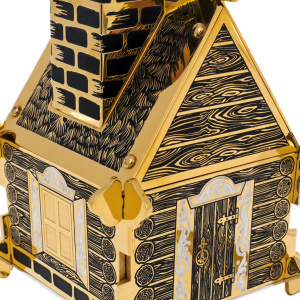 Корпус сахарницы стилизован под деревянный сруб с резными наличниками и дверью, а основание выполнено в виде куриных лап — того самого волшебного основания, на котором стояла избушка Бабы-Яги. Внутри помещается стеклянная вставка, дополняемая миниатюрной ложкой из металла с золотым покрытием.