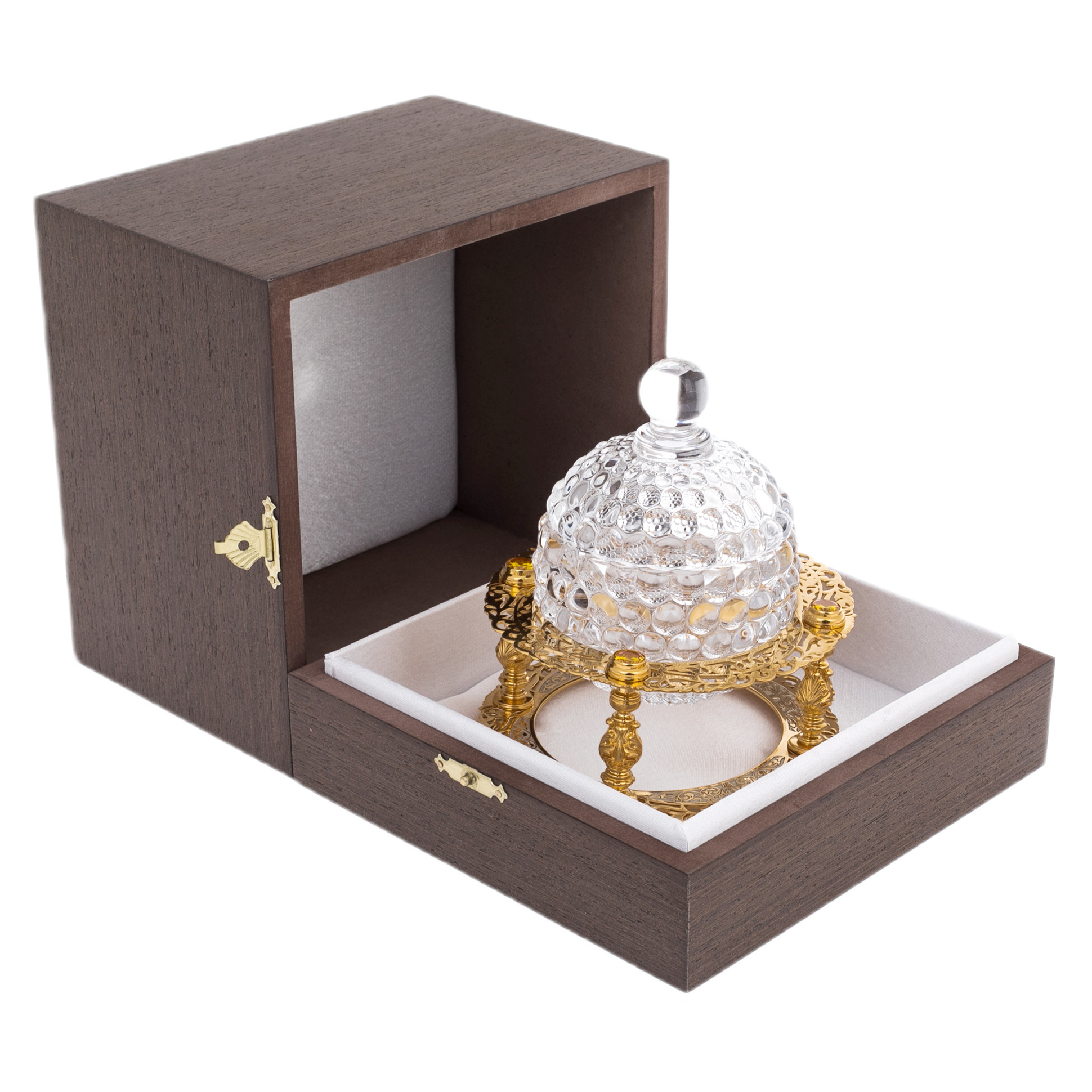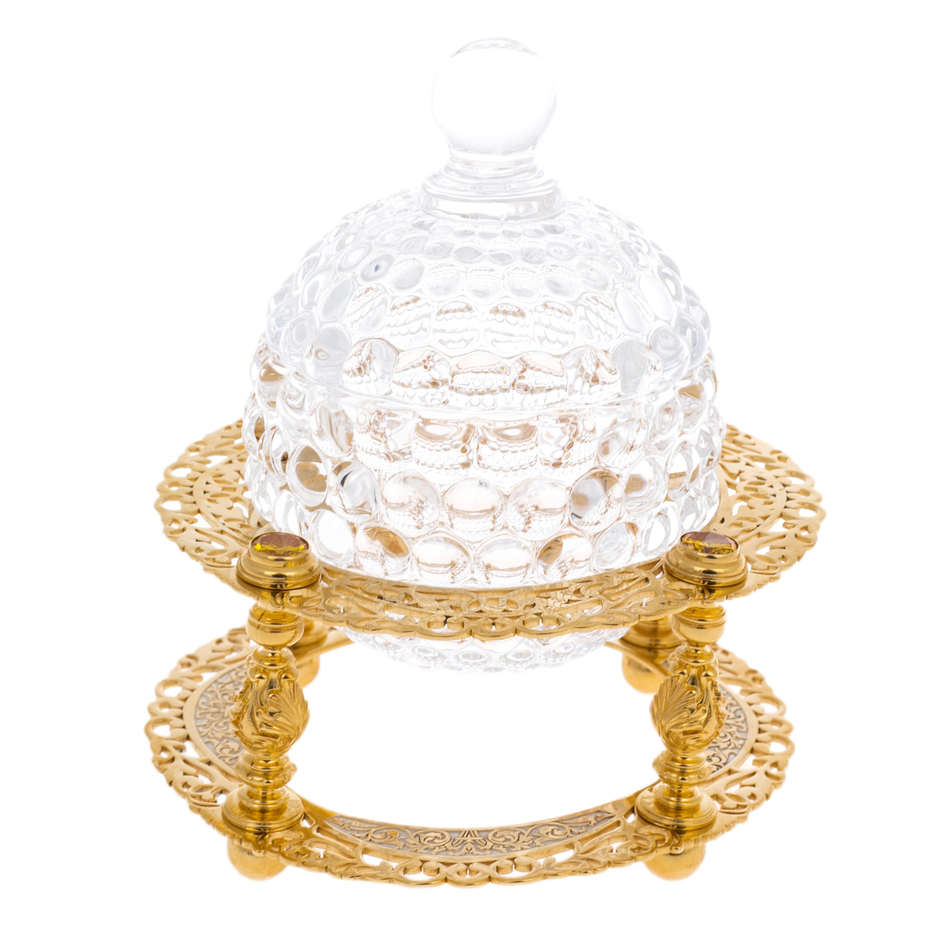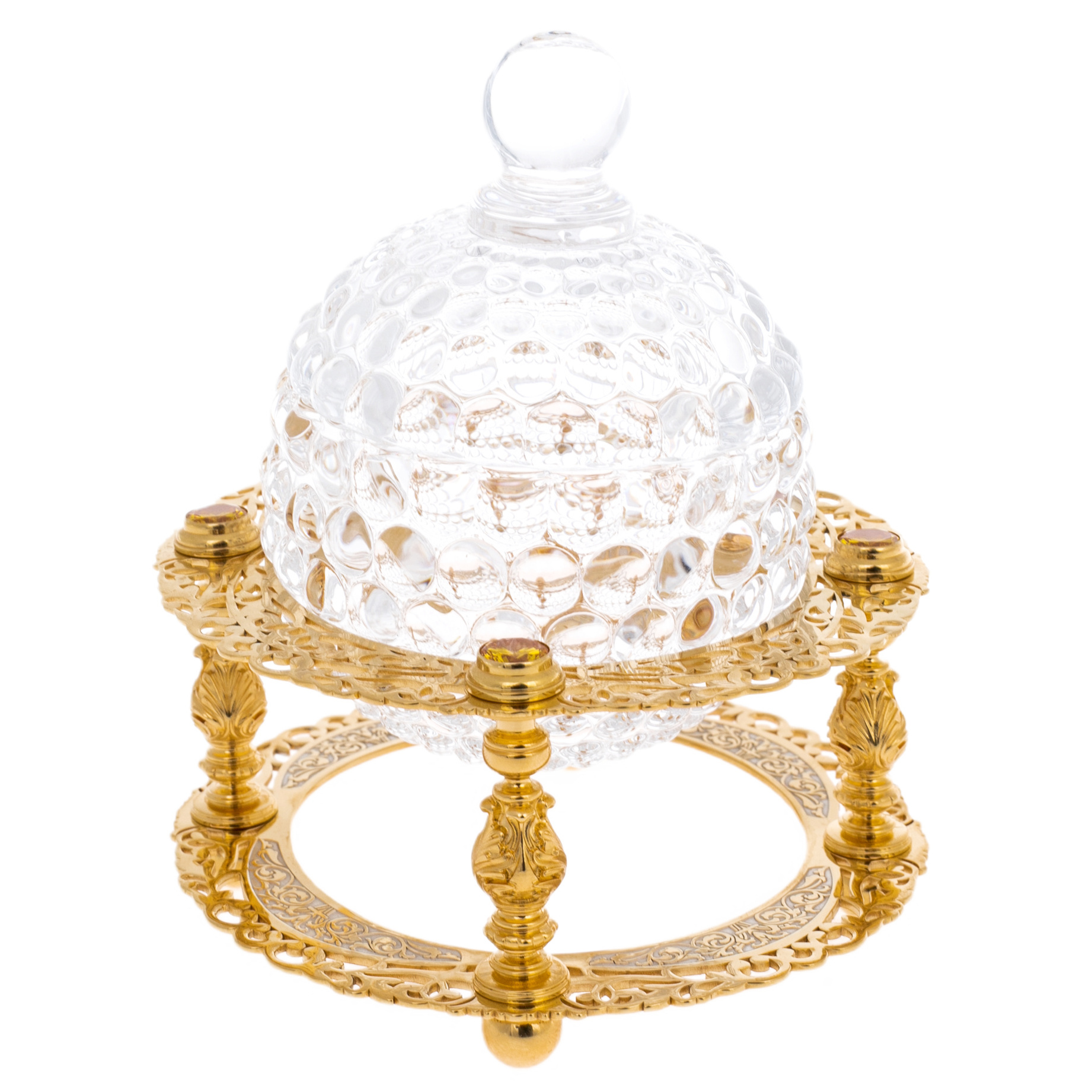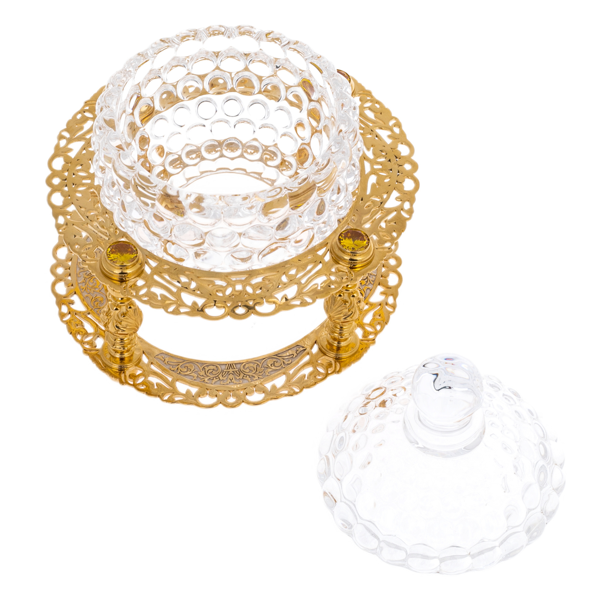 Конфетница из Златоуста — утончённый элемент сервировки, в котором прозрачность хрусталя сочетается с изяществом ажурного золочёного основания. Куполообразная чаша выполнена из фактурного стекла с выразительным рельефом в виде капель — каждая грань отражает свет, создавая игру бликов и ощущение лёгкости. Изящная крышка с округлой ручкой завершает форму, придавая ей архитектурную завершённость. Основание представляет собой тонко проработанный металлический каркас на шести фигурных колоннах, украшенных резьбой и поддерживающих два орнаментальных кольца с растительным узором. В конструкции чувствуется отсылка к дворцовым столовым эпохи русского ампира, где даже простейшие предметы были исполнены с королевским размахом.