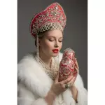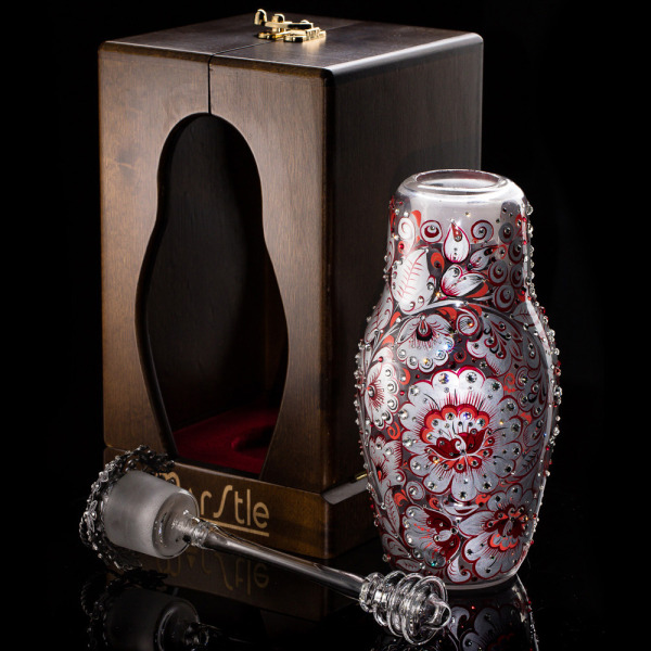 Медовница в форме матрёшки — изысканный арт-объект, соединяющий традиции русского народного промысла с актуальной эстетикой предметного дизайна. Основа выполнена из богемского стекла, вручную выдуваемого мастерами с точностью и вниманием к каждой линии силуэта. Тело изделия украшено художественной росписью в технике хохломы, дополненной сверкающими кристаллами Swarovski, тщательно закреплёнными по рисунку. Съёмная ажурная крышка, изготовленная в технике филиграни, венчает композицию, создавая ощущение праздничного великолепия и утончённости.