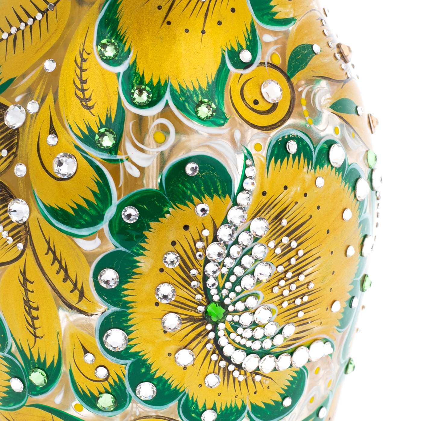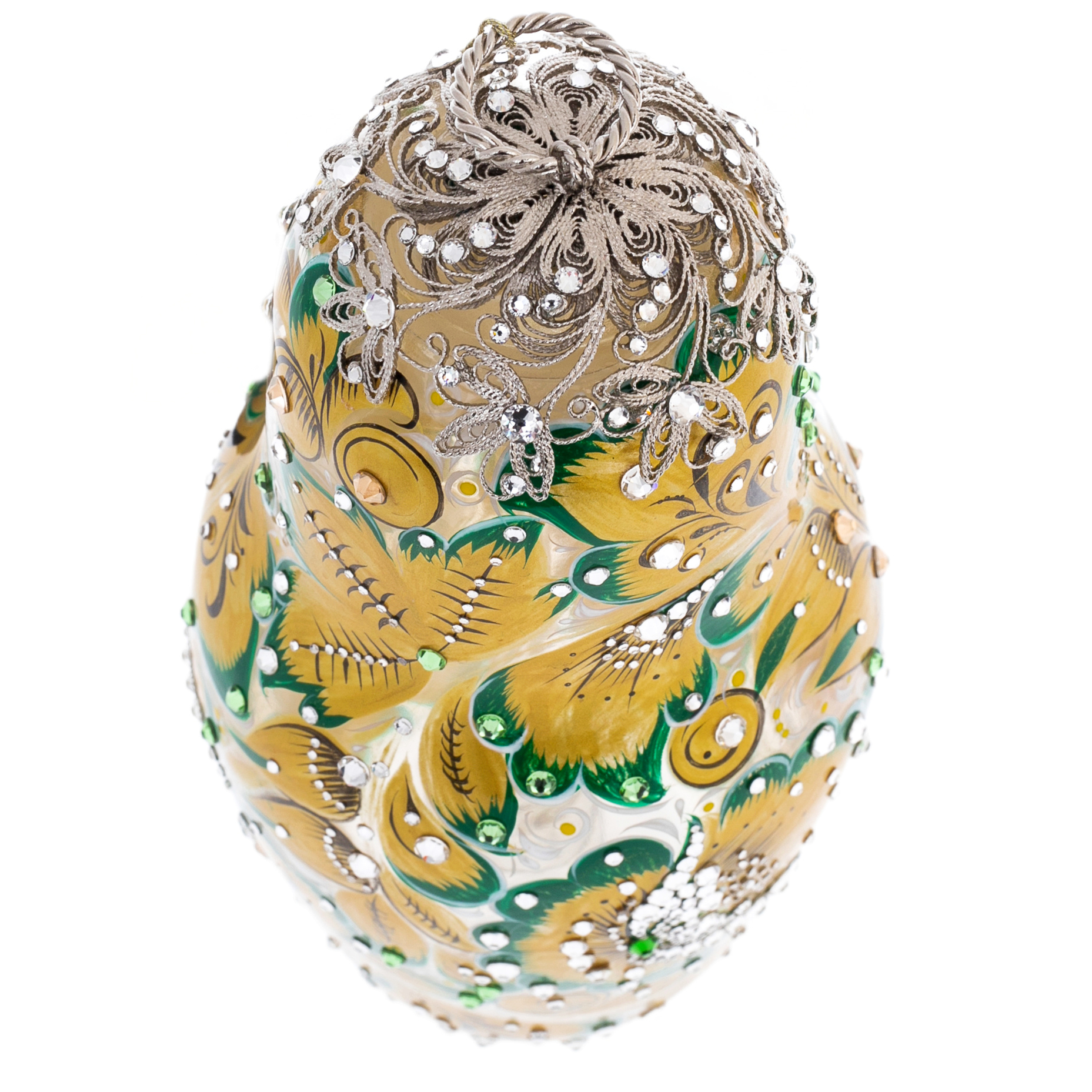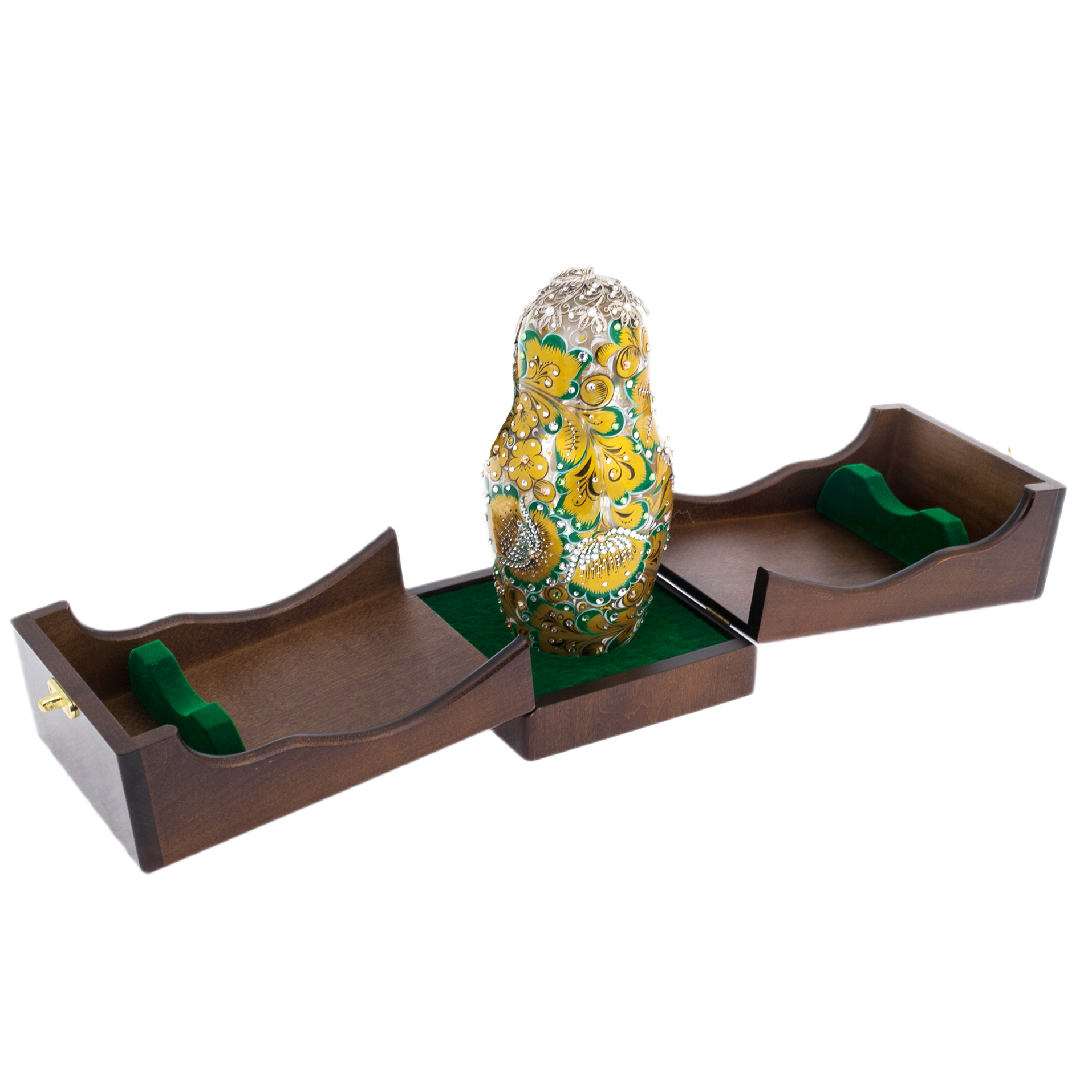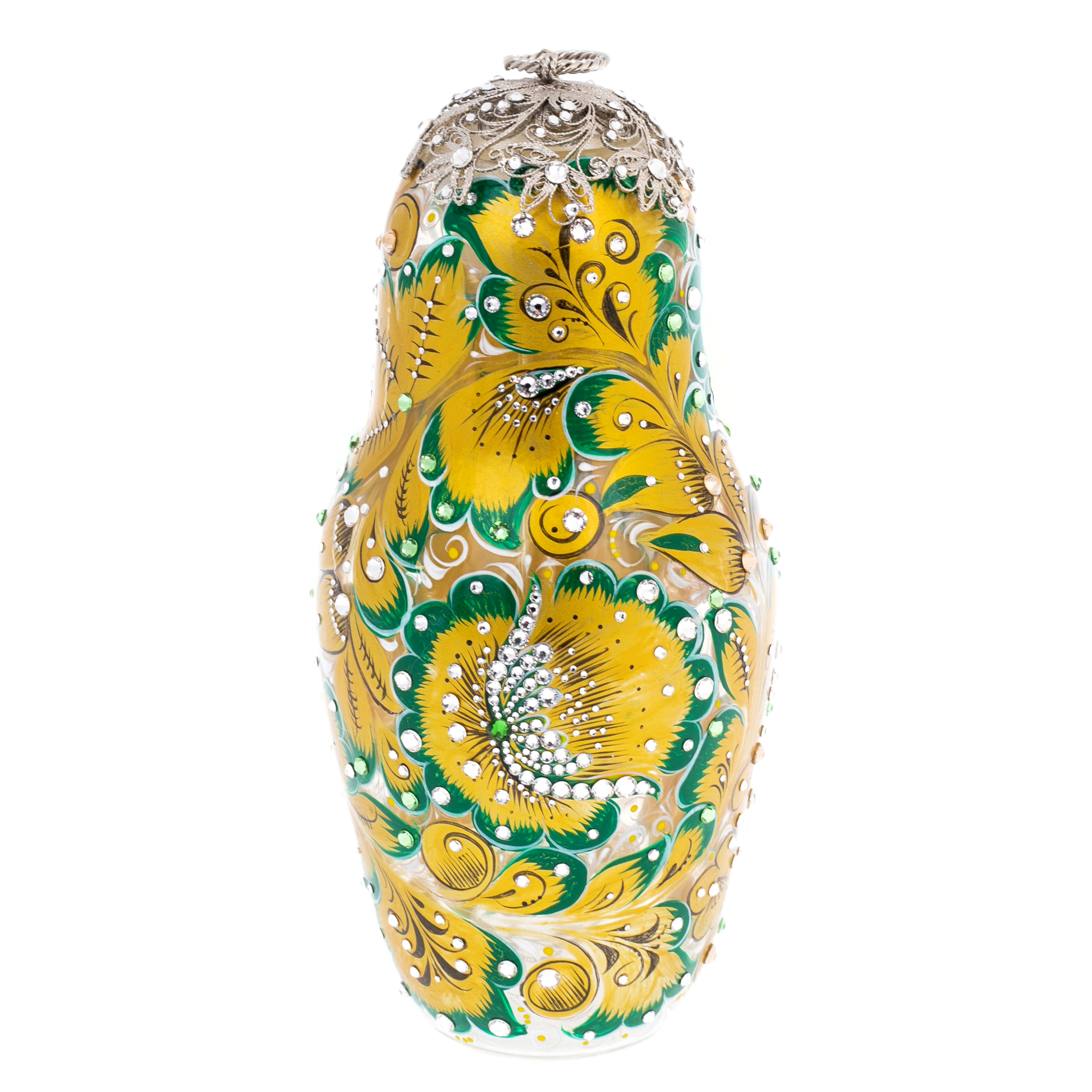 Матрешка-медовница из стекла "Золотой изумруд" со стразами Swarovski, Хохлома