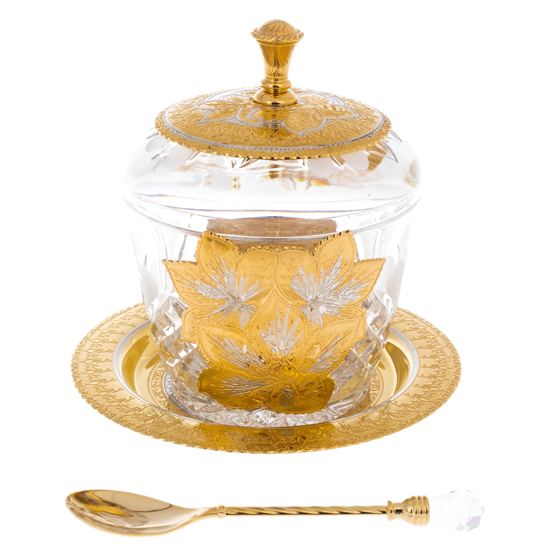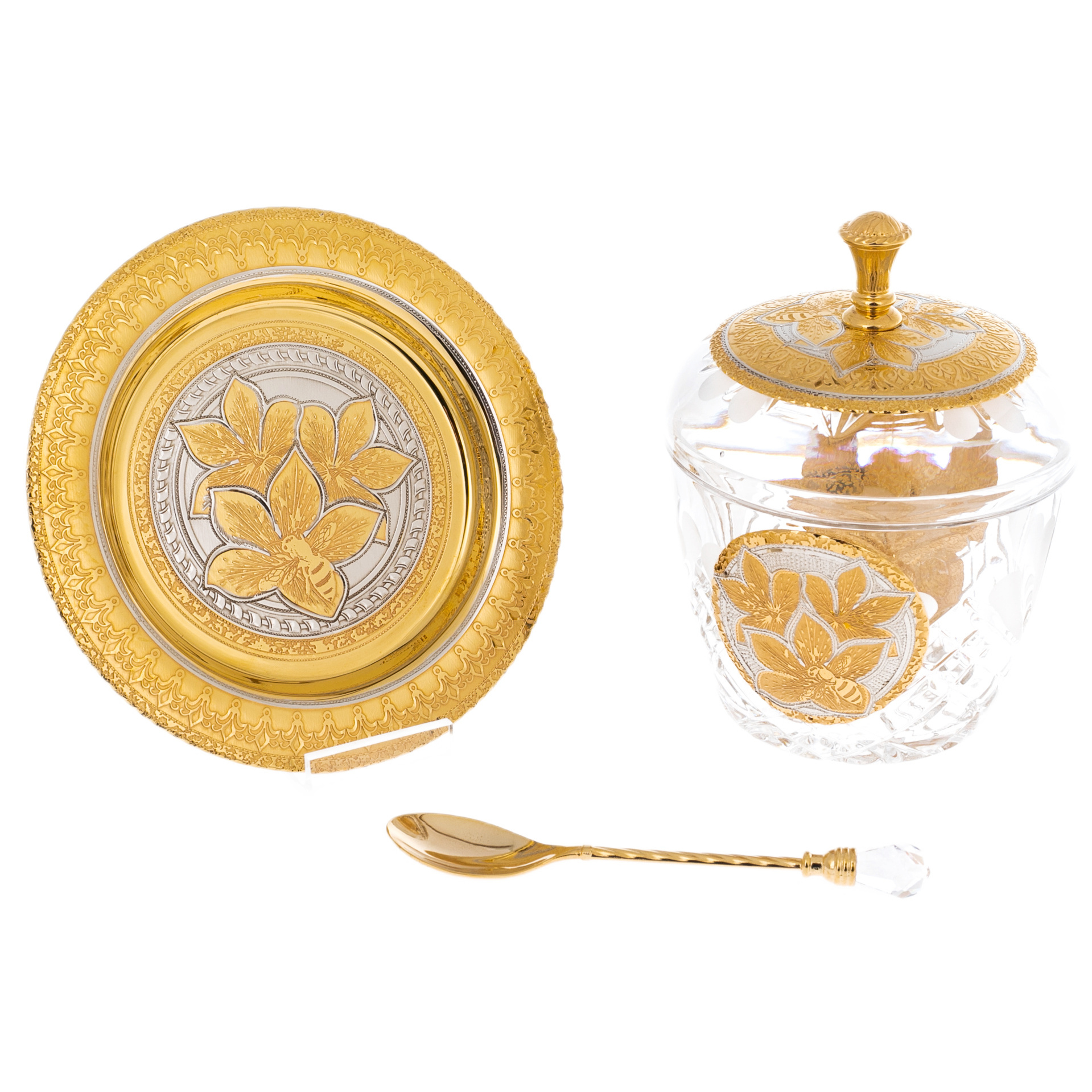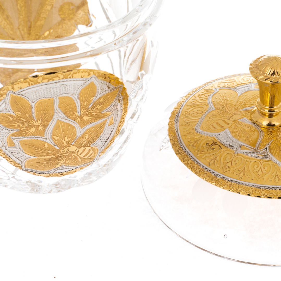 Прозрачные грани сосуда, словно хранящие в себе свет, перекликаются с рельефными цветочными мотивами, выполненными из золота. Цветы, словно вырезанные на поверхности, будто оживают под солнечными лучами, наполняя пространство теплом и богатством. В этом хрупком стекле застыла тишина спокойного утра, когда каждая капля меда становится символом золотого времени.