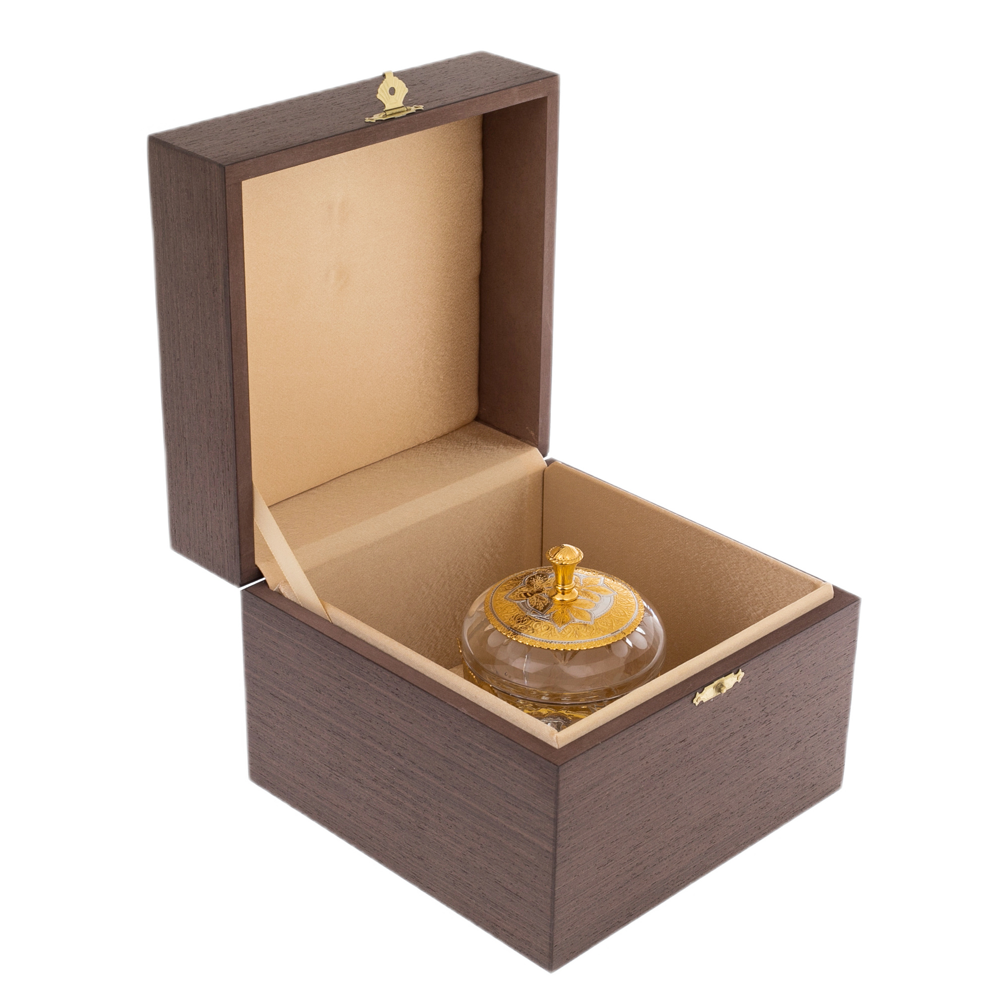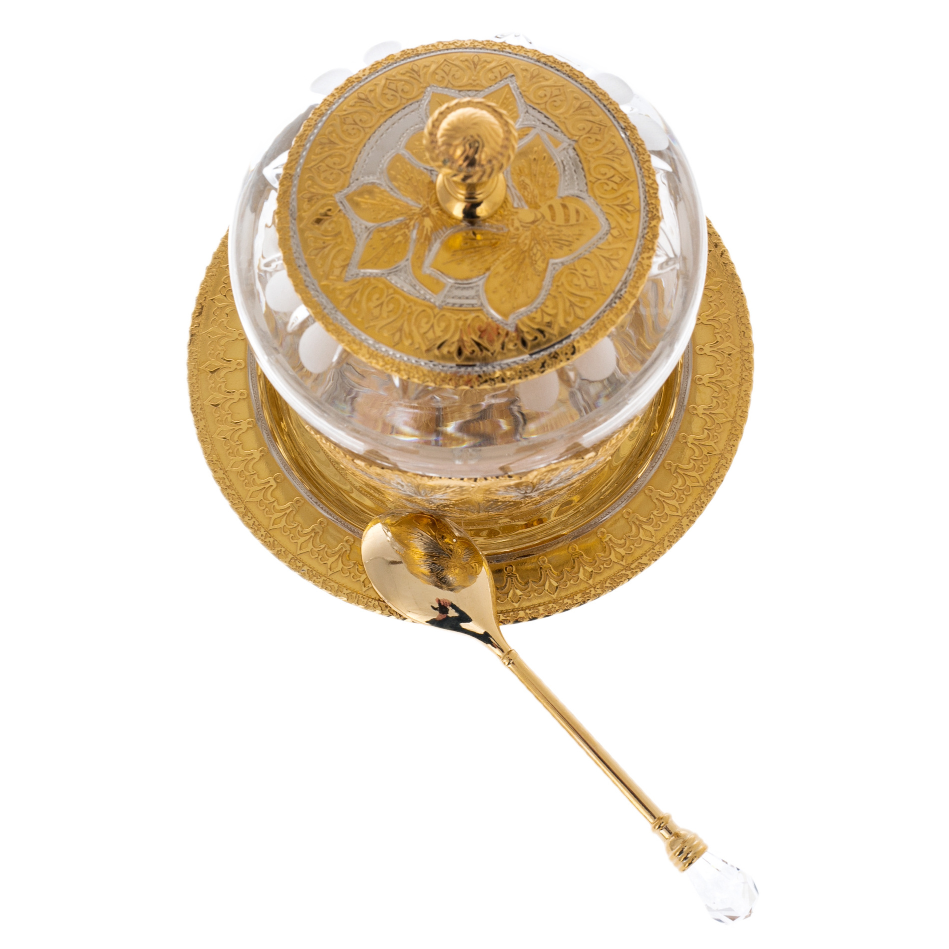 Золотая крышка, украшенная тончайшей гравировкой, возвышается над медовницей, подобно короне на голове величественного правителя. Мягкие и плавные очертания создают иллюзию движения, как будто она готова подняться, чтобы открыть тайну своего содержания. Каждая линия — это шаг к совершенству, каждая деталь — воплощение стремления к власти над временем.