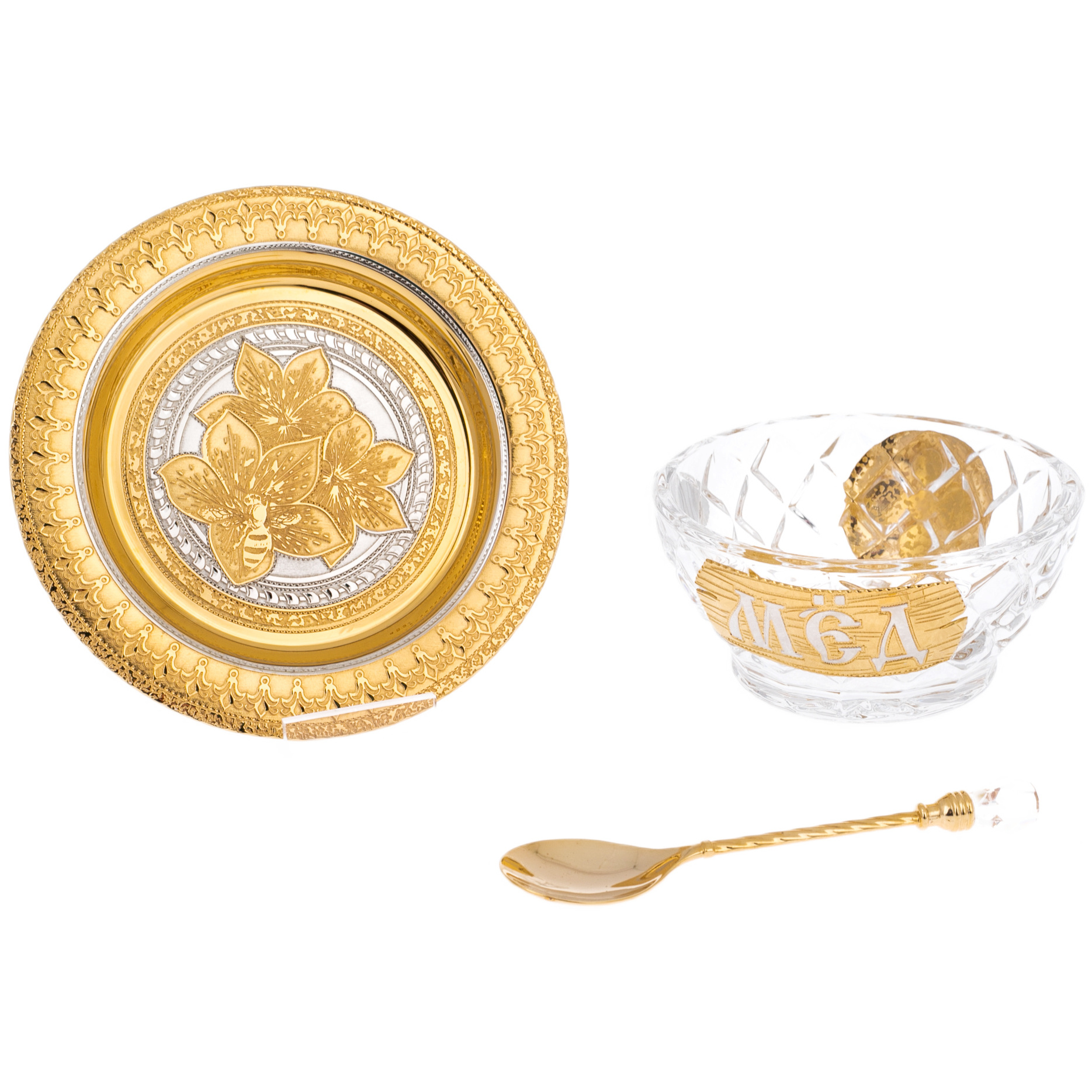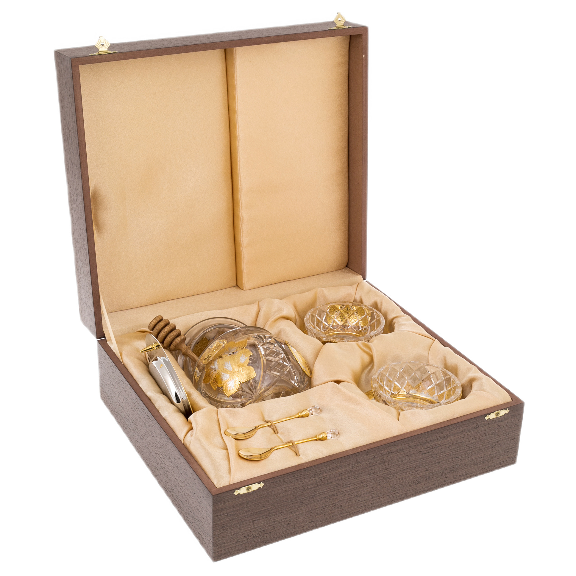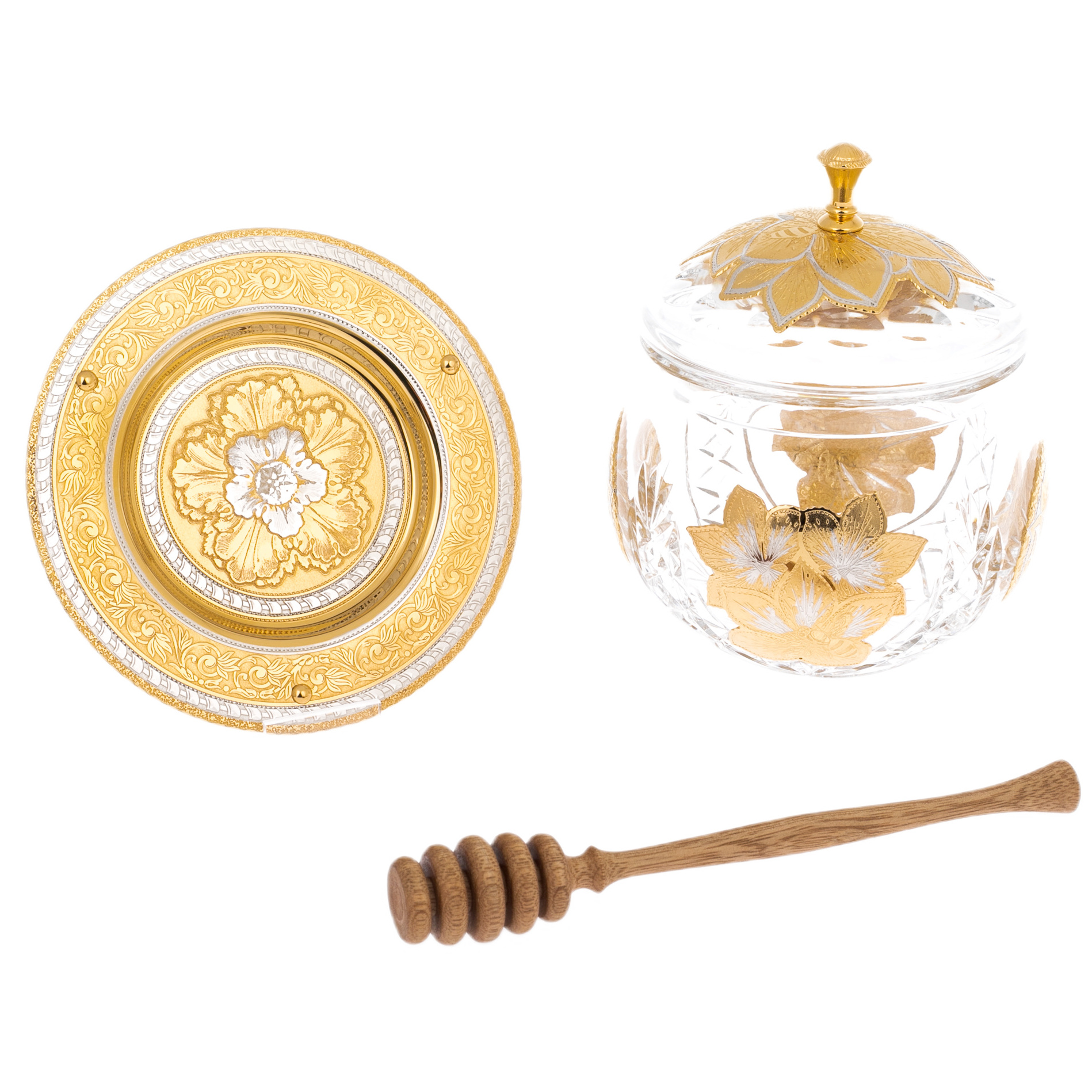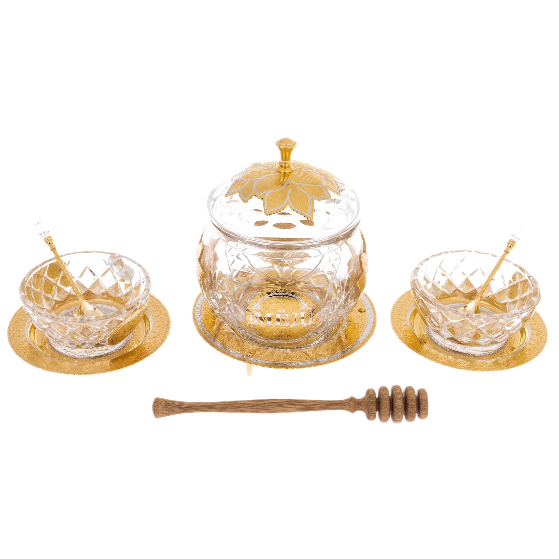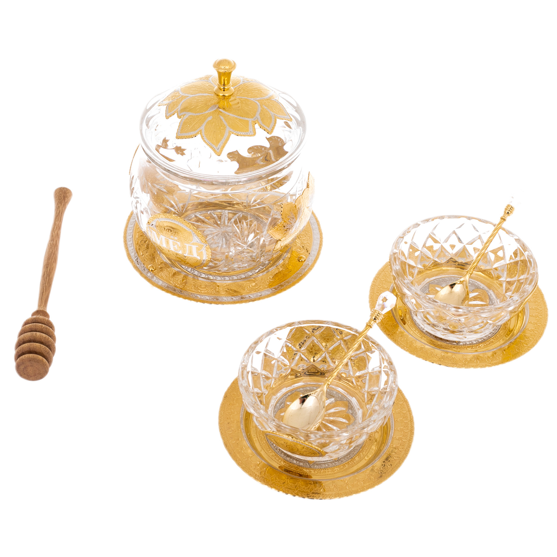 Пиалы, повторяющие узор основного сосуда, дополнены вставками с выгравированным словом "Мёд", выполненным в лучших традициях златоустовской техники. Блюдца, украшенные сложными орнаментами, служат идеальным фоном для этих изящных изделий, усиливая эффект блеска и тонкости исполнения. Позолоченные ложечки с кристальными вставками и деревянная палочка для мёда делают сервировку завершённой, добавляя штрихи старинного европейского ритуала подачи лакомства.