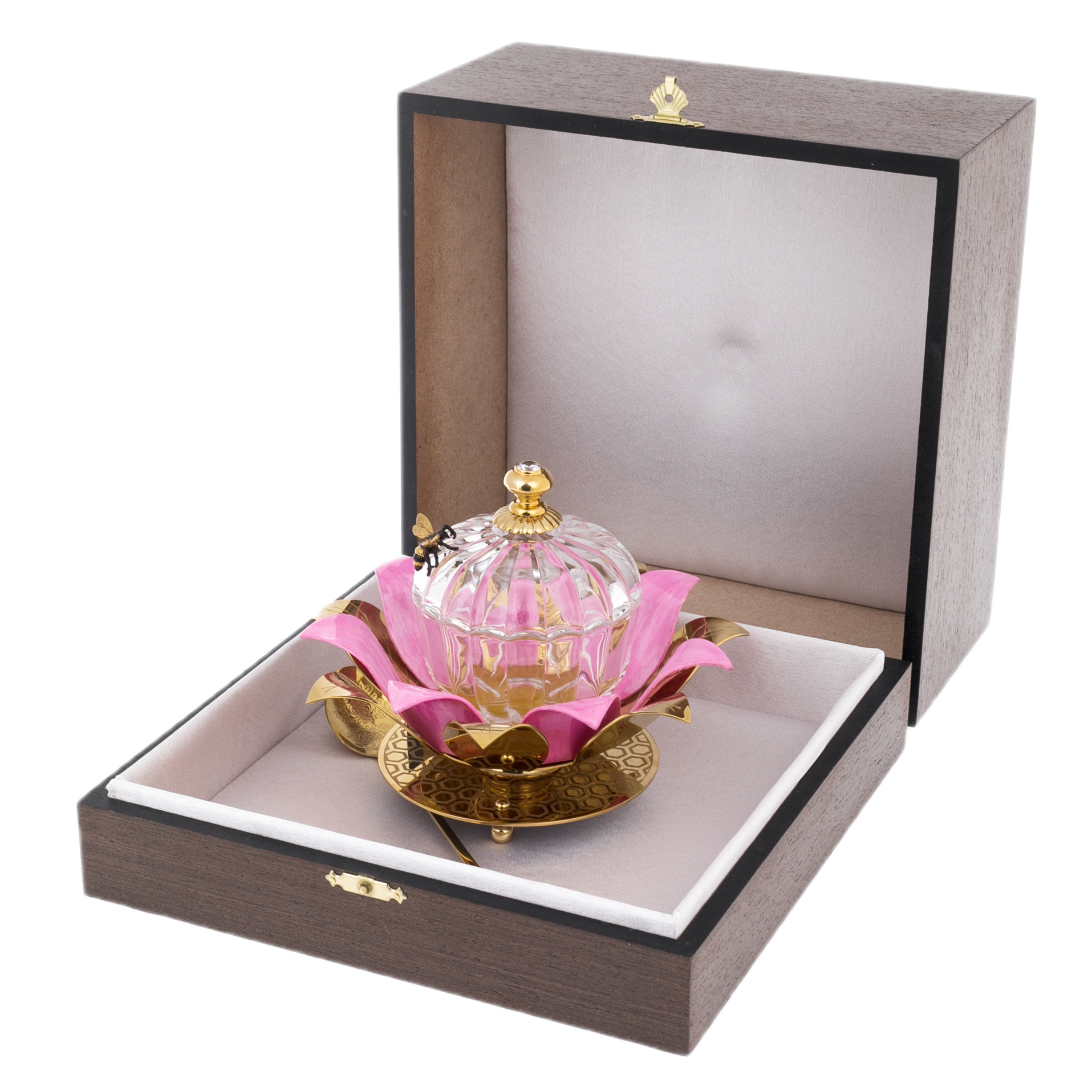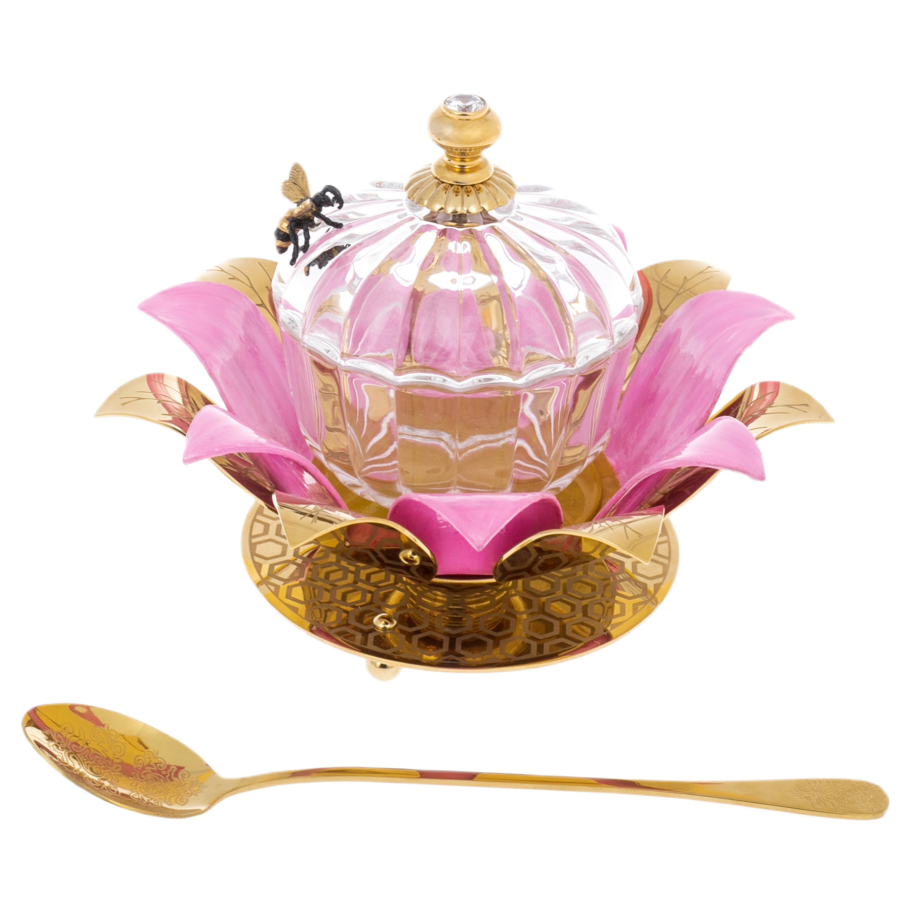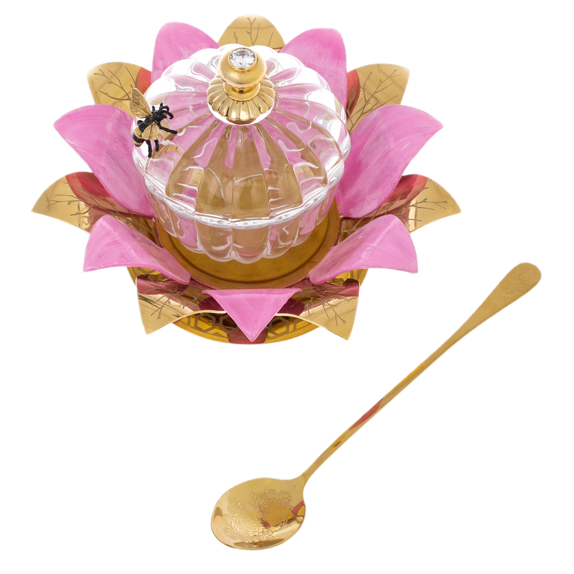 Эта медовница являет собой симбиоз художественного мастерства и функциональности, превращая подачу меда в эстетический ритуал. Прозрачная чаша из богемского стекла с рельефным орнаментом отражает свет, создавая игру бликов, подчеркивающих её изысканность. Лепестки лотоса, выполненные в златоустовской технике, расцветают вокруг чаши, словно пробуждаясь с первыми лучами солнца. Каждая грань позолоченного металла покрыта филигранными узорами, нанесенными вручную методом травления и гравировки, что придает изделию уникальную художественную ценность.