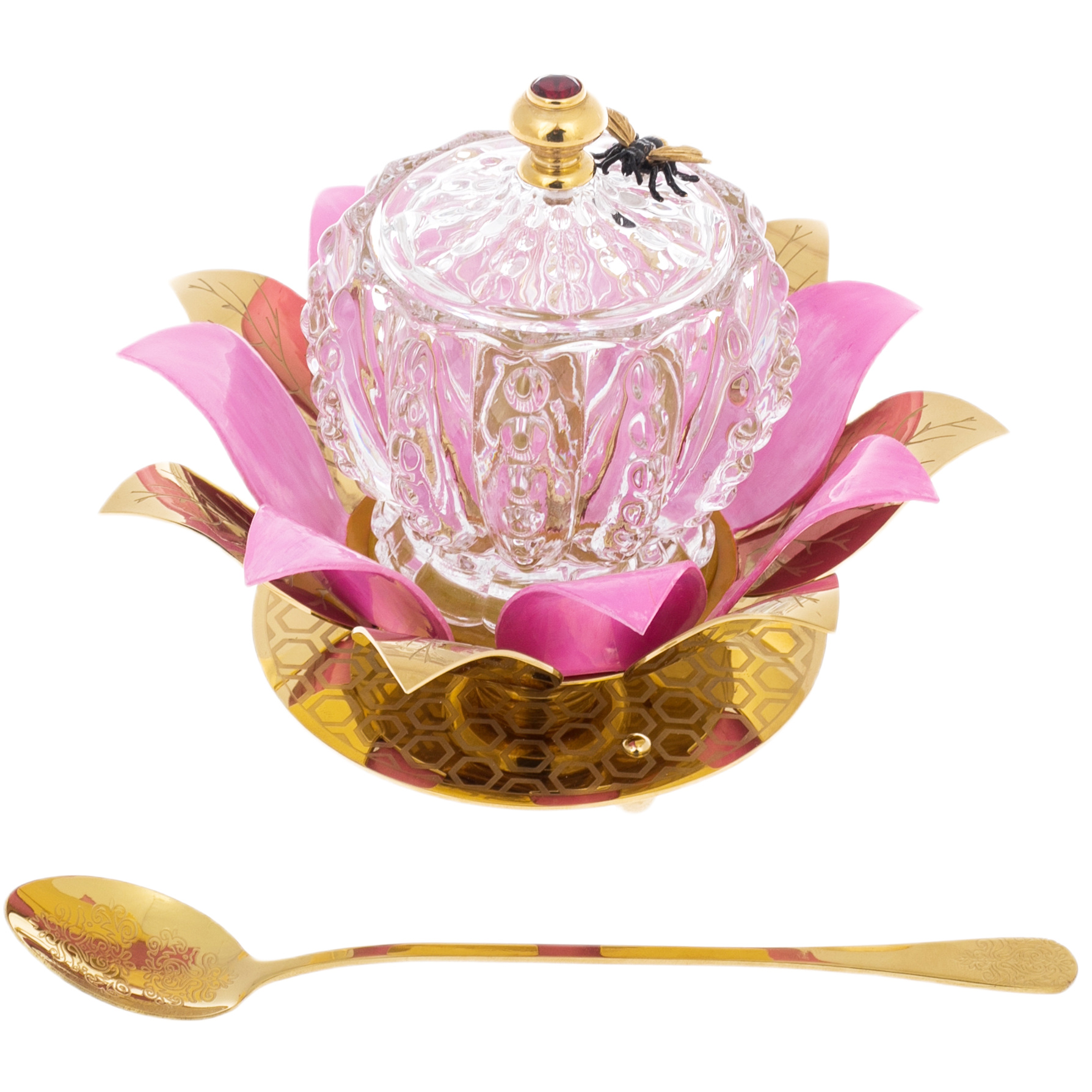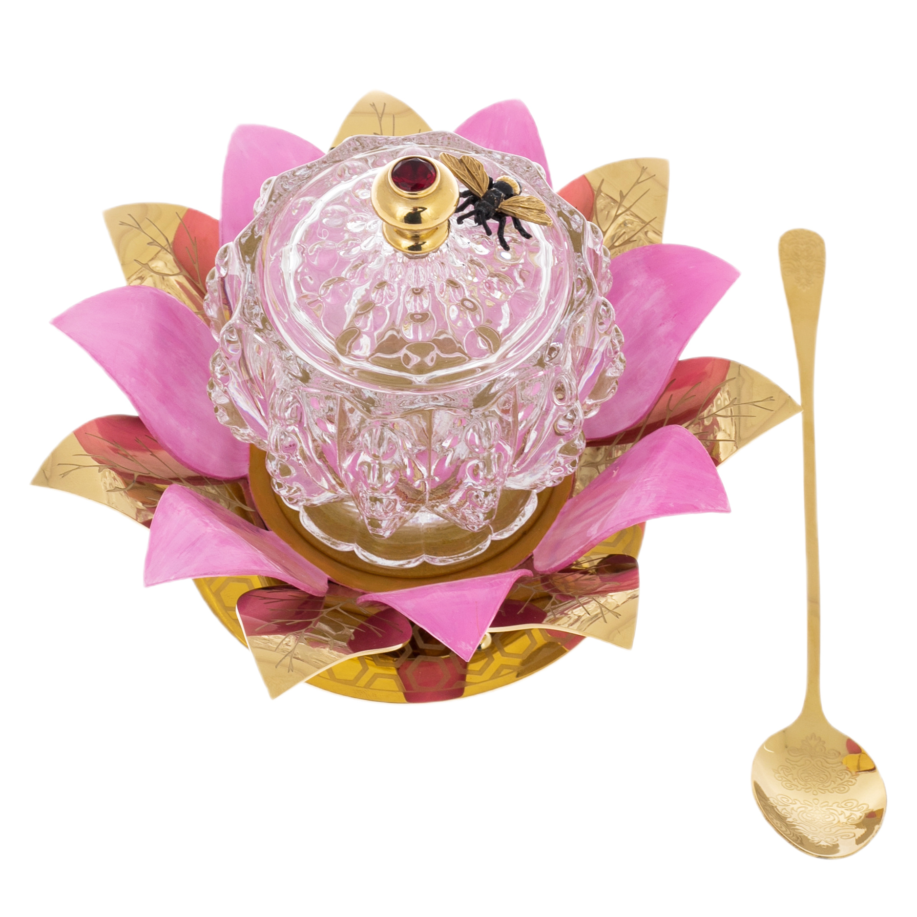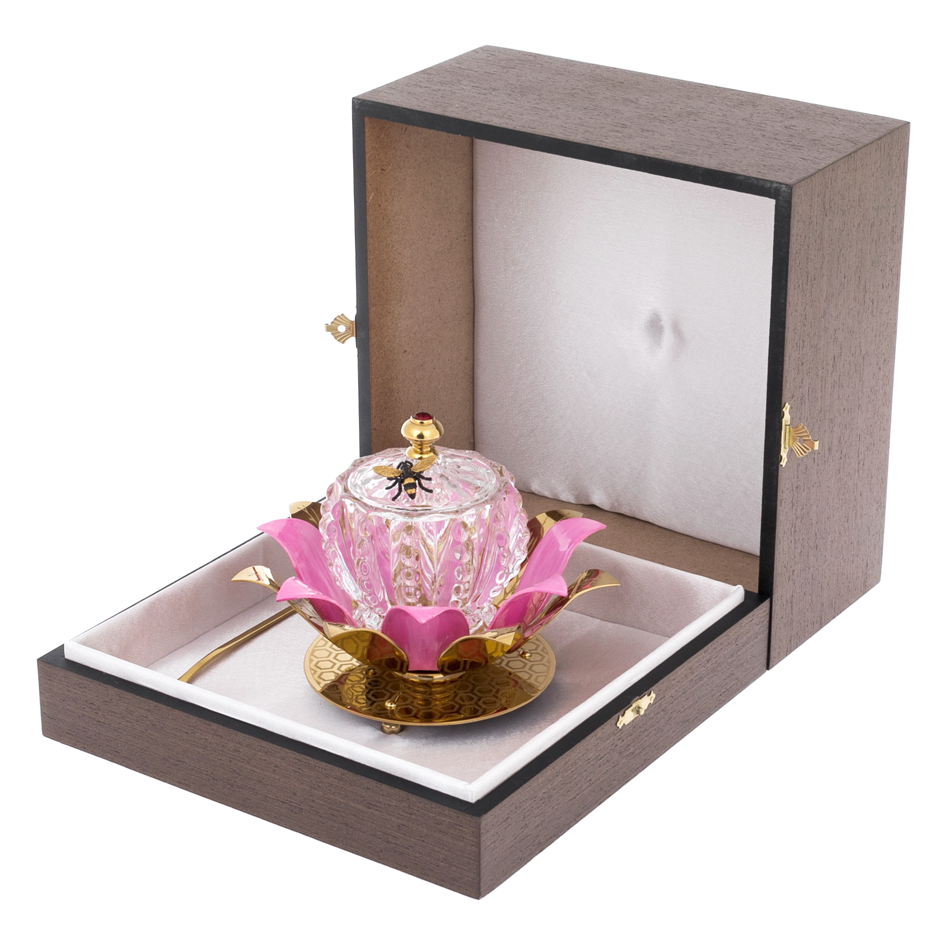 Эта медовница являет собой симбиоз художественного мастерства и функциональности, превращая подачу меда в эстетический ритуал. Прозрачная чаша из богемского стекла с рельефным орнаментом отражает свет, создавая игру бликов, подчеркивающих её изысканность. Лепестки лотоса, выполненные в златоустовской технике, расцветают вокруг чаши, словно пробуждаясь с первыми лучами солнца. Каждая грань позолоченного металла покрыта филигранными узорами, нанесенными вручную методом травления и гравировки, что придает изделию уникальную художественную ценность.
