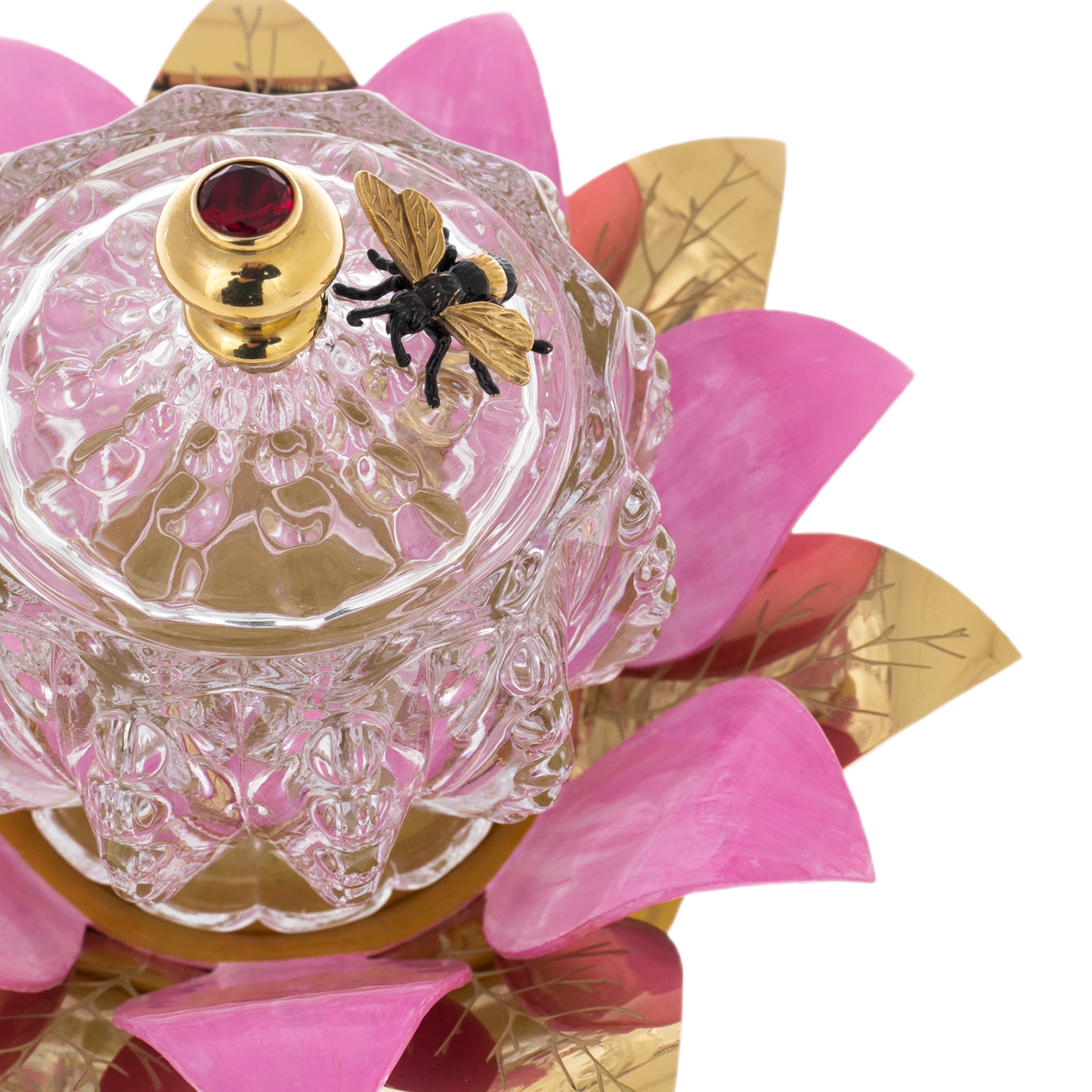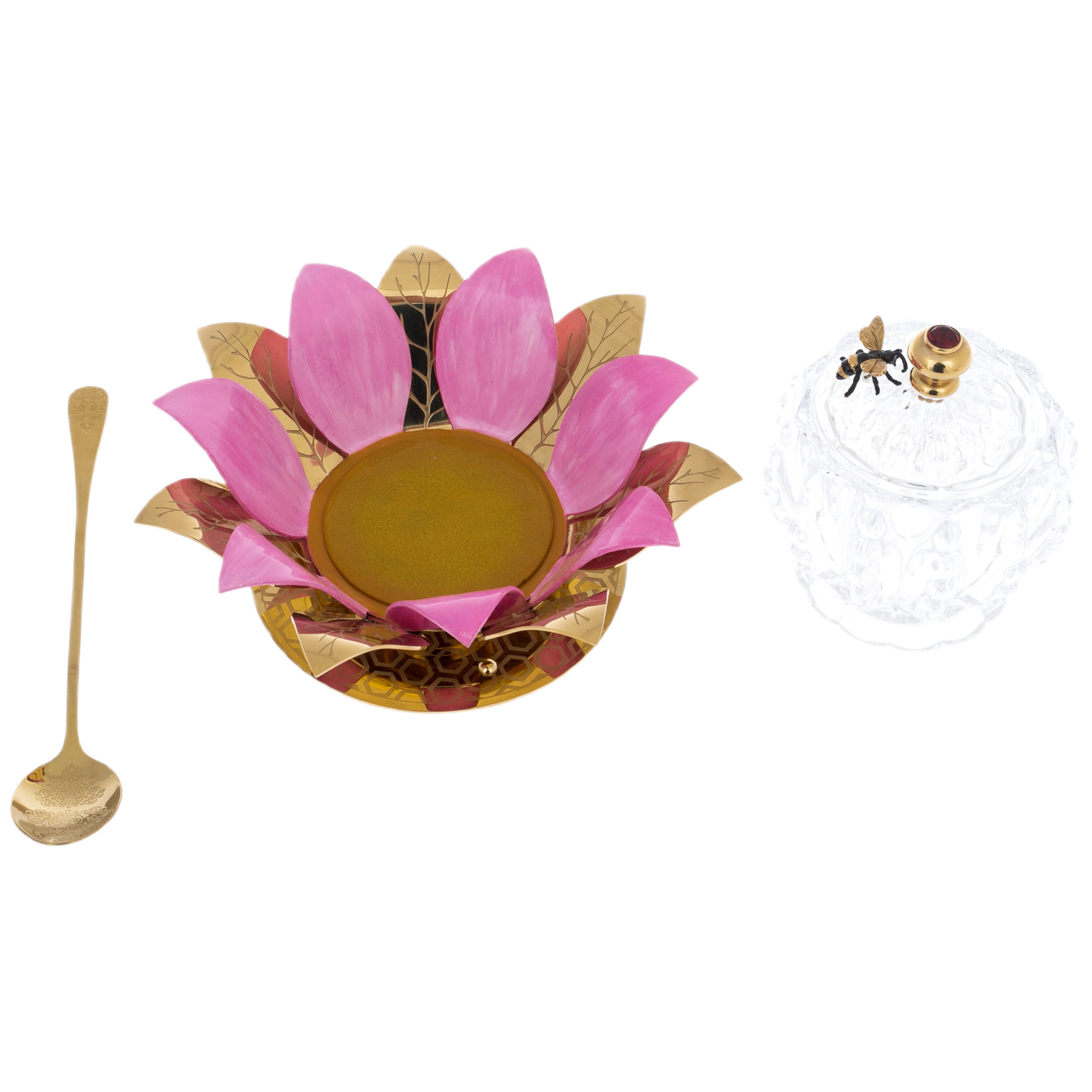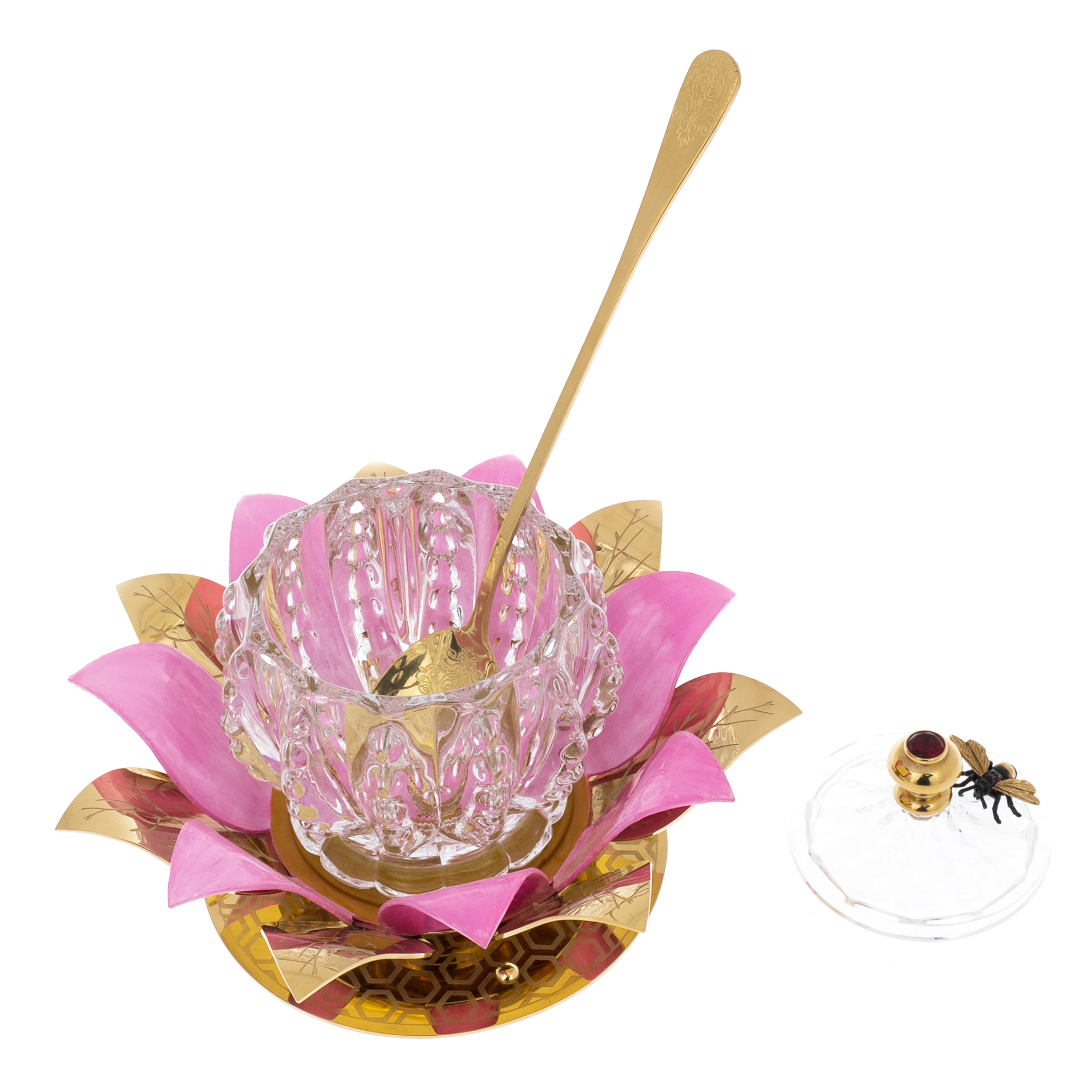 Эта медовница являет собой симбиоз художественного мастерства и функциональности, превращая подачу меда в эстетический ритуал. Прозрачная чаша из богемского стекла с рельефным орнаментом отражает свет, создавая игру бликов, подчеркивающих её изысканность. Лепестки лотоса, выполненные в златоустовской технике, расцветают вокруг чаши, словно пробуждаясь с первыми лучами солнца. Каждая грань позолоченного металла покрыта филигранными узорами, нанесенными вручную методом травления и гравировки, что придает изделию уникальную художественную ценность.