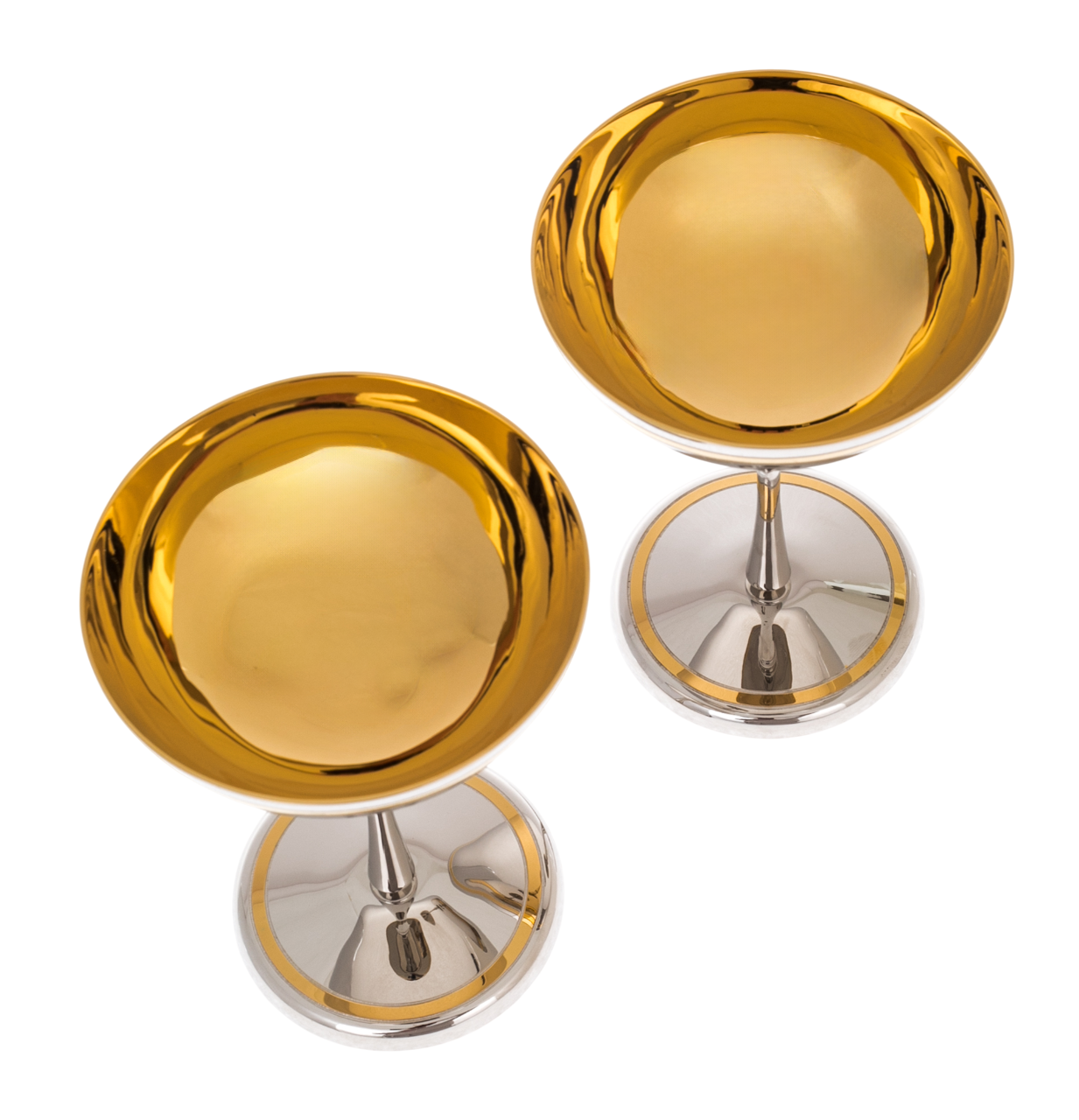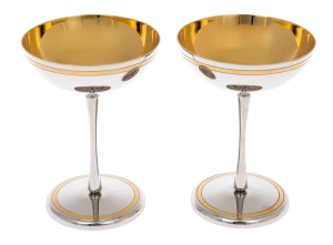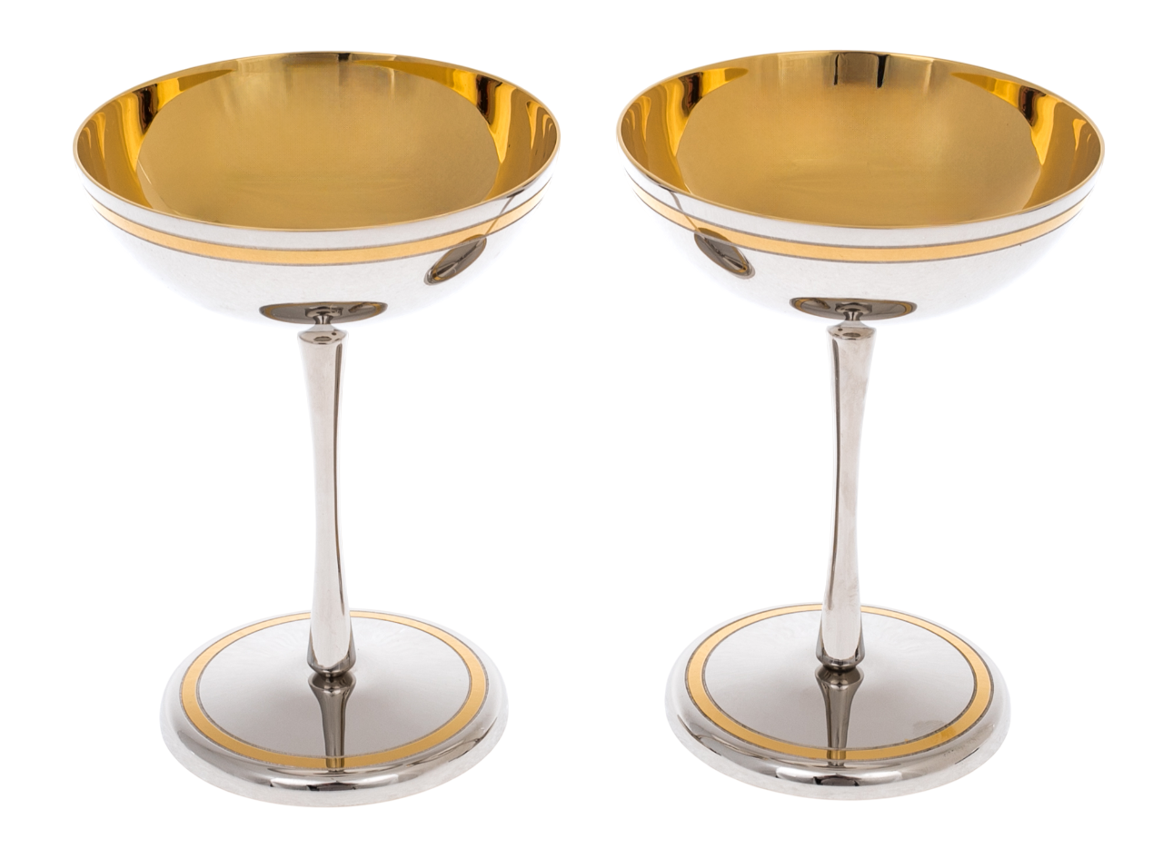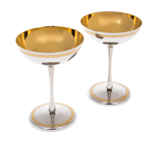 Конструкция креманок продумана до мельчайших нюансов: широкая чаша позволила придать десертам выразительный объём, а плавно сужающаяся ножка обеспечивает визуальную гармонию и удобство в использовании. Основание, оформленное тонким золотым кольцом, добавляет композиции завершённость и делает силуэт особенно утончённым. Контраст двух металлов работает как изящный художественный приём, создавая эффект двойной глубины и подчёркивая ручную работу мастеров, создающих предметы, ориентированные на взысканных коллекционеров и эстетов.
