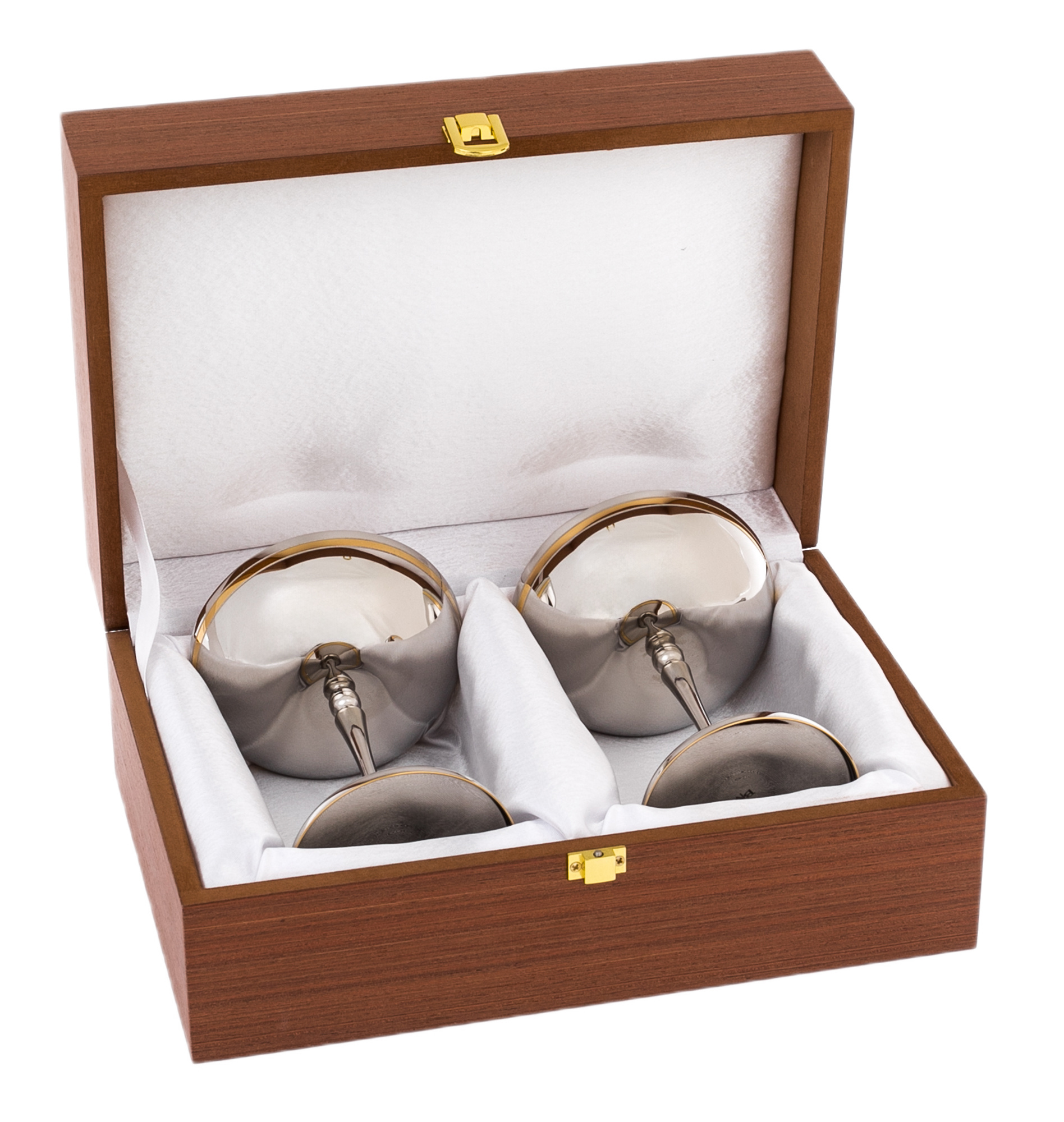 Набор креманок, выдержанный в строгой геометрии линий и в сиянии полированного металла, являет собой воплощение изысканной сдержанности, присущей лучшим образцам златоустовского искусства. Каждая креманка поднимается над столом на высокой изящной ножке, визуально удлиняя силуэт и создавая ощущение воздушности. Внутренняя поверхность чаши, покрытая тёплым золотым слоем, отражает свет мягкими всполохами и формирует игру бликов, подчёркивающую благородство формы. Внешняя сторона, отполированная до холодного серебристого сияния, заключает в себе идеальную гладкость, позволяющую почувствовать премиальный характер изделия.