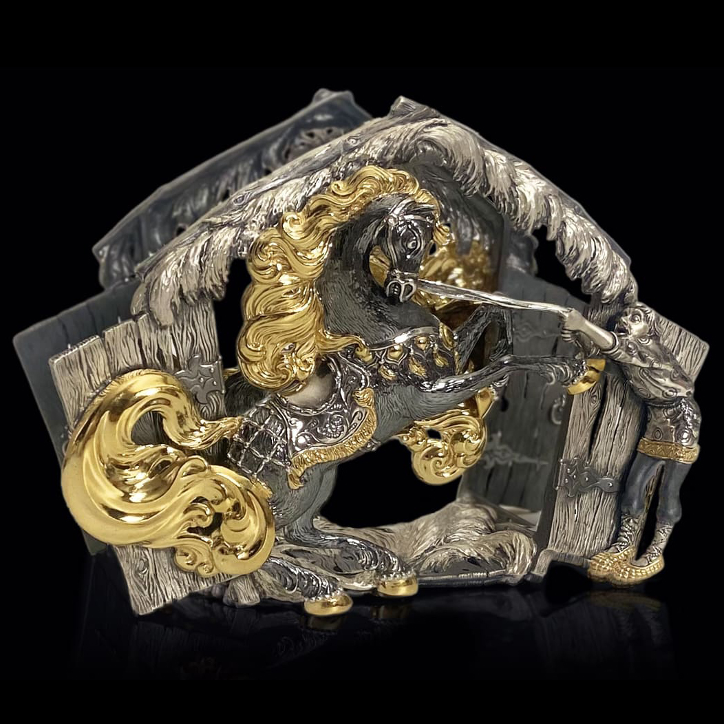 Салфетница очень удобна в использовании. Можно поставить целую пачку салфеток — они послужат фоном для каждой стороны, и станет комфортнее рассматривать детали композиции. А их действительно очень много: распахнутые деревянные двери, где видны и структура старого обветшалого дерева, и кованные засовы; низкая крыша, покрытая соломой, остатки которой можно найти на полу балагана (так в старые времена называли сарай для хранения сена). Гаврила, тянущий коня, от усилия даже привстал на цыпочки. На нем рубаха-косоворотка в горох, а на ногах — лапти. Настоящий деревенский житель! А вот кони совсем не деревенские, самые настоящие царские! Грива — что золото, на спине - вышитая попона и во всем облике - благородная стать.