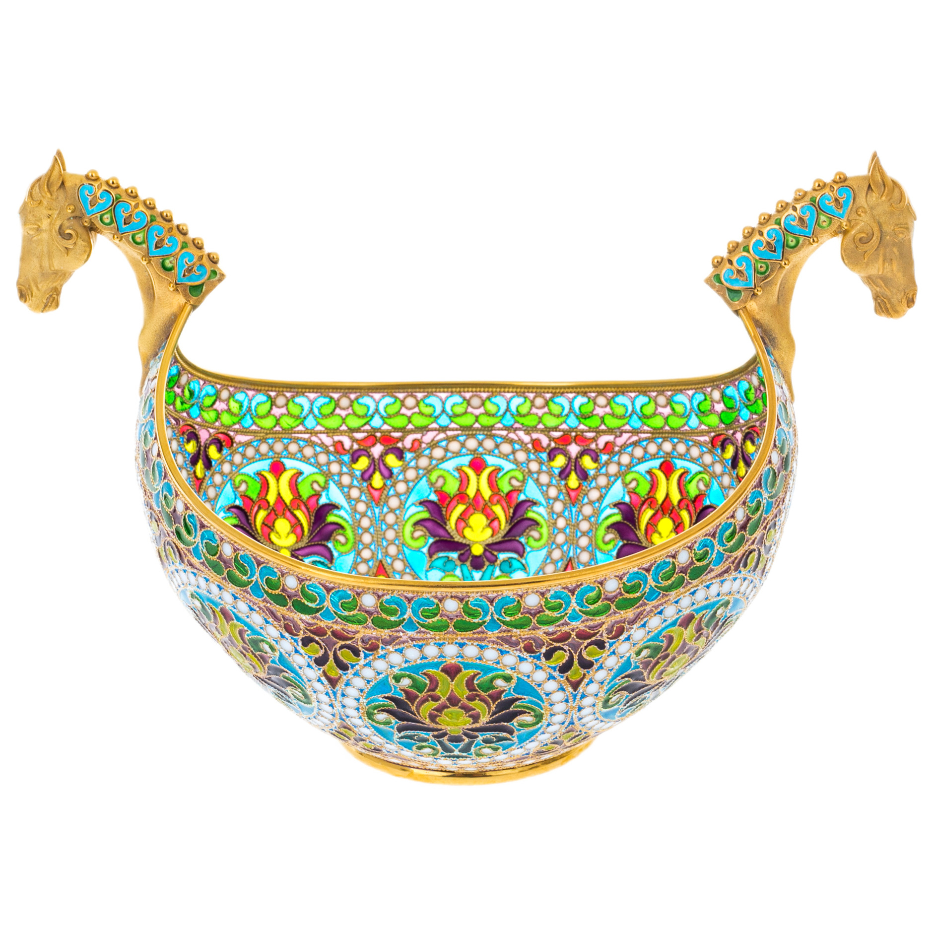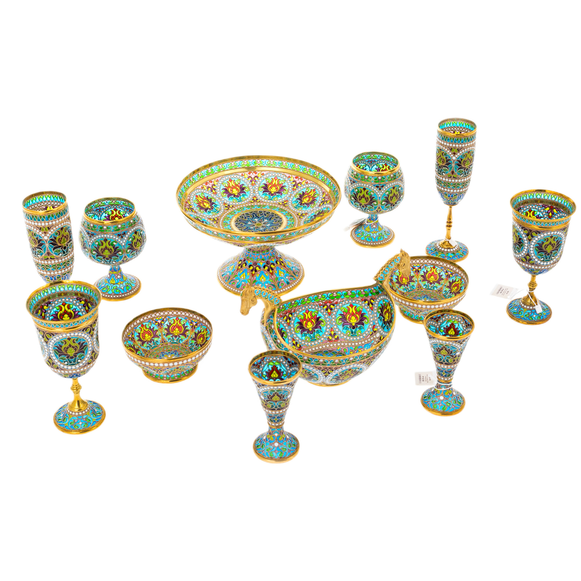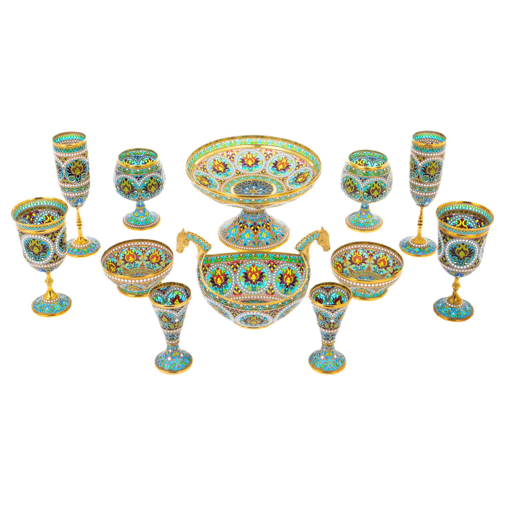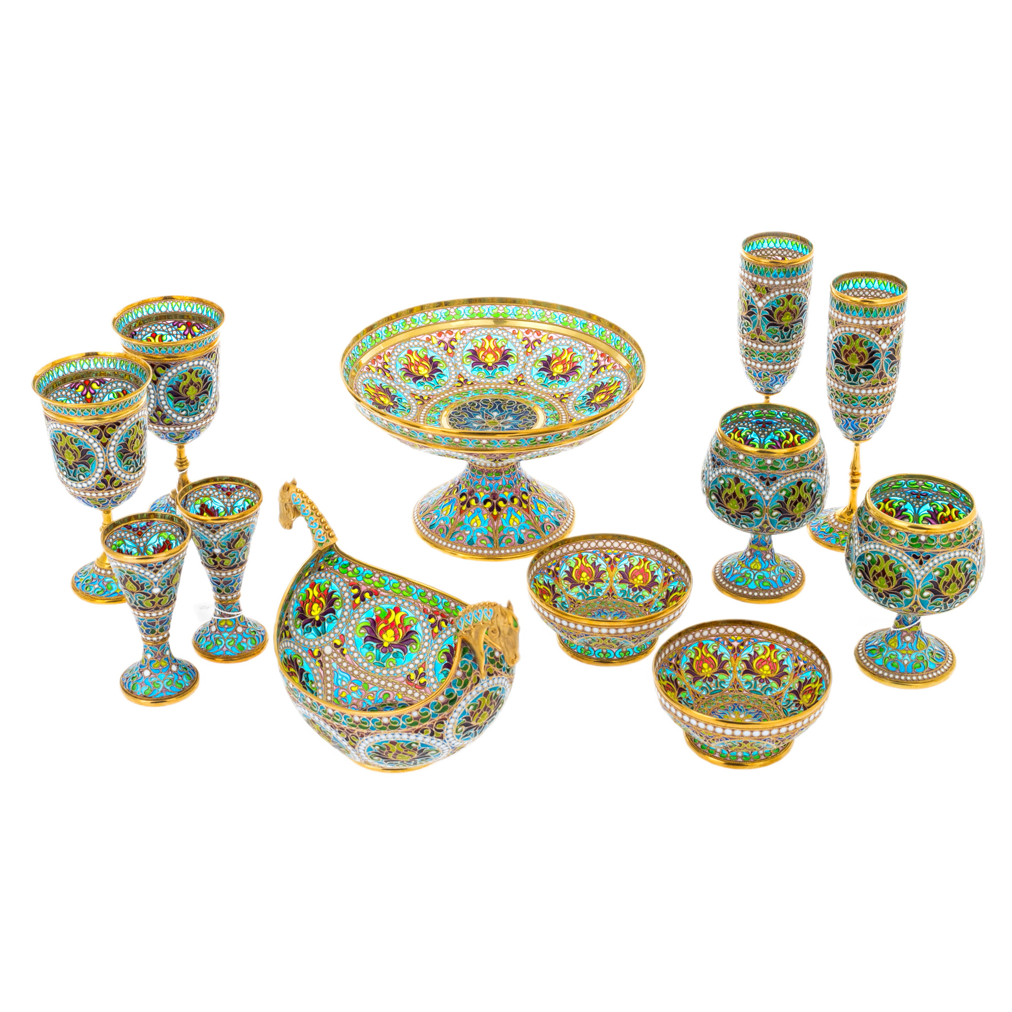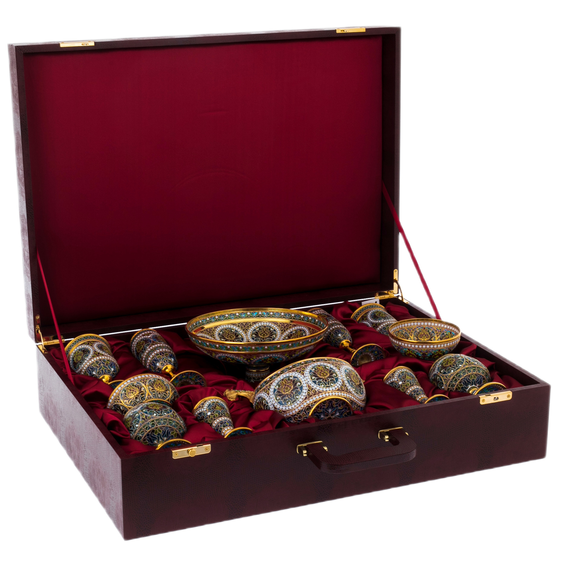 Ювелирная техника исполнения этого набора требует исключительного мастерства. Прозрачная эмаль, нанесённая в сотни микроскопических ячеек, проходит многоступенчатый обжиг, что делает каждый предмет не только удивительно прочным, но и наделяет его неповторимой глубиной цвета. Золотая филигрань обрамляет композиции, придавая сервизу статус художественного объекта.
