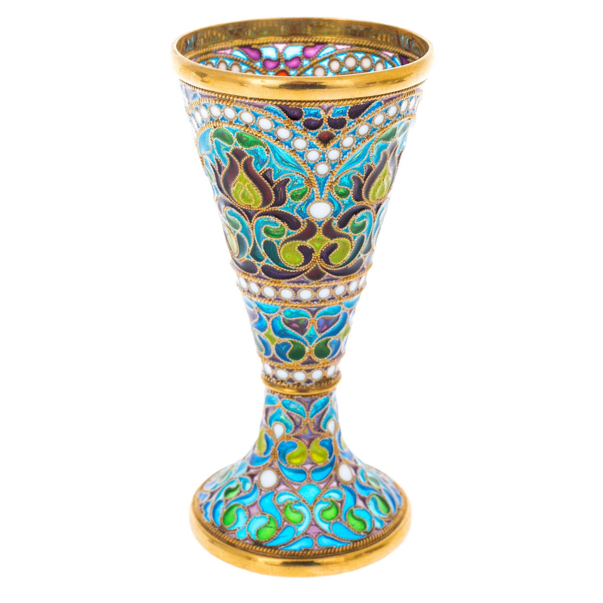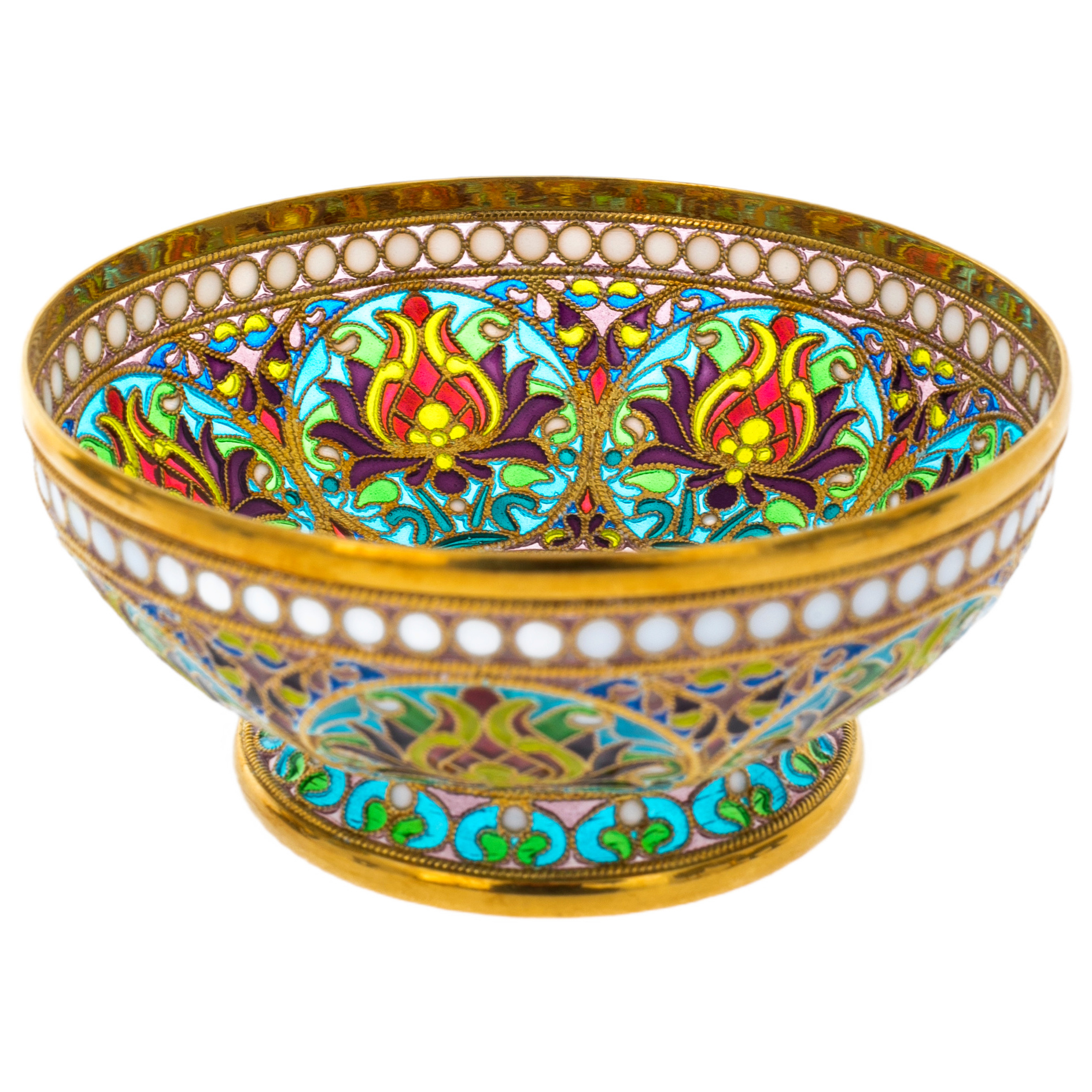 Витражная эмаль, украшающая каждый предмет, напоминает драгоценные окна средневековых соборов — свет преломляется в тончайших перегородках, заполняя пространство игрой глубоких оттенков и сиянием сложных узоров. Цветочные мотивы, вплетённые в канву тончайших металлических переплетений, словно живут своей собственной жизнью — вспыхивают яркими красками при каждом изменении угла зрения, превращая сервировку стола в подлинную галерею искусства.