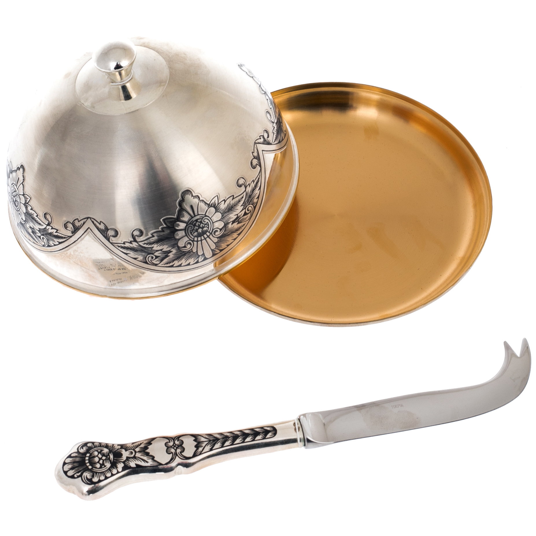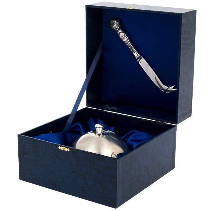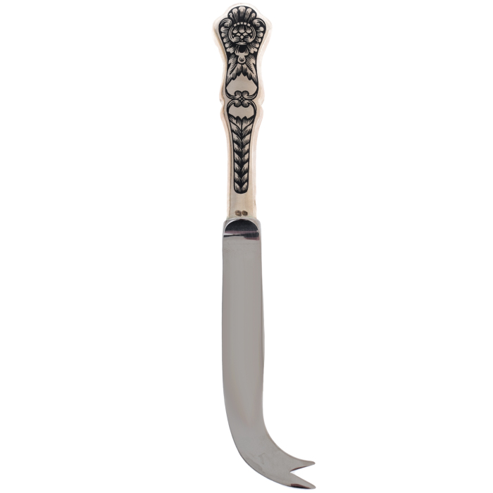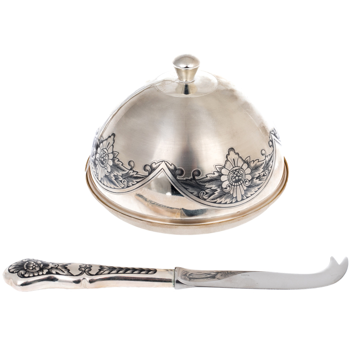 Каждая деталь сырного ножа выполнена с той же тщательностью: изогнутое лезвие отражает функциональность, а серебряная рукоять, украшенная чернением и рельефным рисунком, перекликается с оформлением купола. Орнамент, проходящий по всей длине рукояти, формирует гармоничную композицию, подчёркивая единство стиля. Благородные оттенки серебра и золочения, соединяясь в одном ансамбле, создают впечатление музейного предмета, созданного для самых утончённых столов.