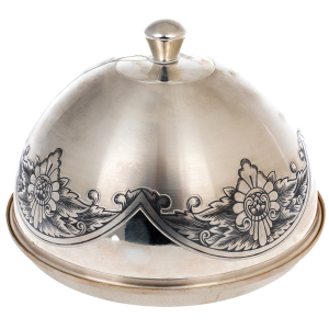 Серебряная сырница с ножом под названием «Черновой рисунок» представляет собой изысканный предмет для сервировки, созданный как истинный объект эстетического наслаждения. Купол из серебра с мягким матовым блеском украшен тончайшим чернением, образующим орнамент, напоминающий старинную гравюру. Рельефный цветочный мотив, обрамляющий нижний край купола, придаёт изделию благородный характер, а внутренняя часть блюда, покрытая тёплым золотистым оттенком, создаёт выразительный контраст, усиливающий ощущение роскоши.