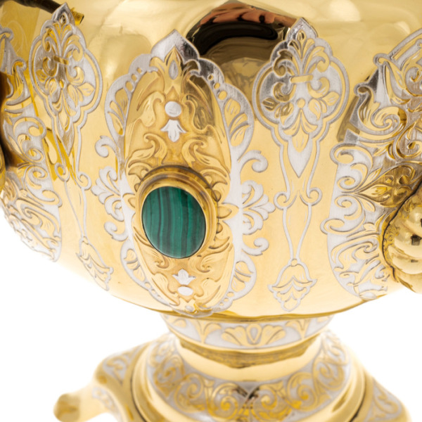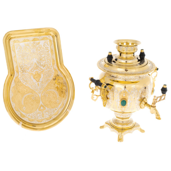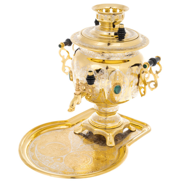 Данный чайный набор – это воплощение роскоши и традиций русского чаепития. Изготовленный из латуни и покрытый никелем и позолотой, самовар украшен вставками из малахита, придающими ему особый шарм. Латунь обеспечивает долговечность и прочность изделия, а никель и позолота создают роскошный внешний вид, защищая поверхность от окисления и придавая блеск. Малахит символизирует здоровье и благополучие, добавляя самовару изысканности.