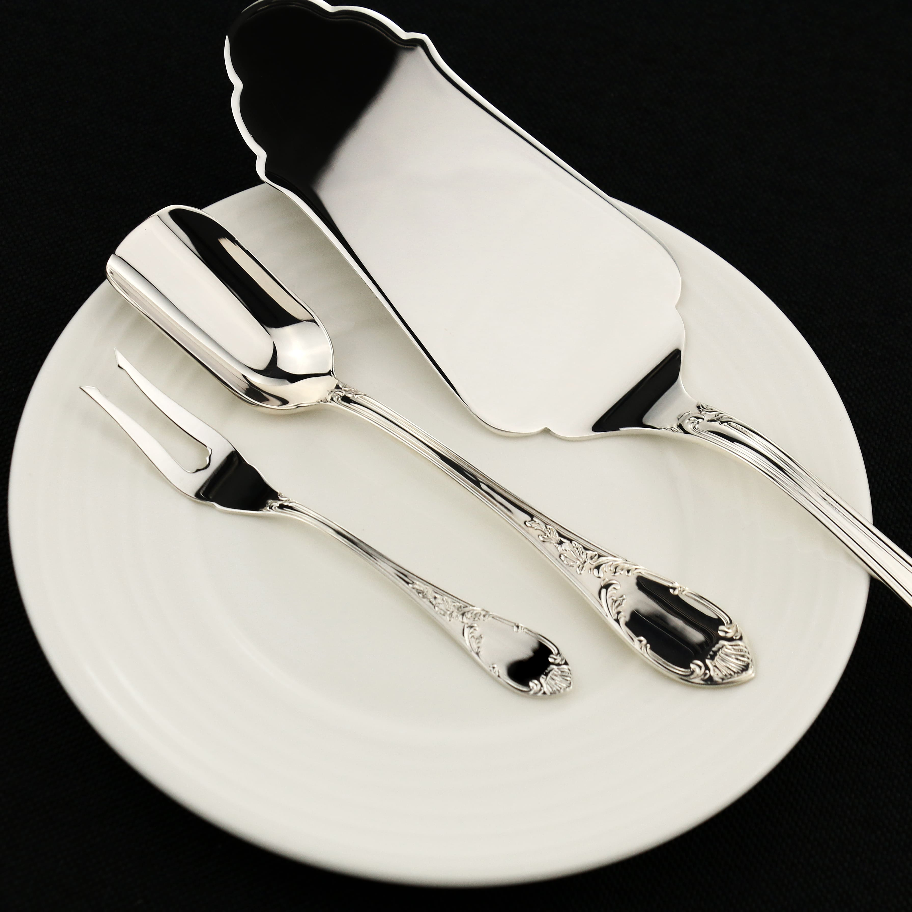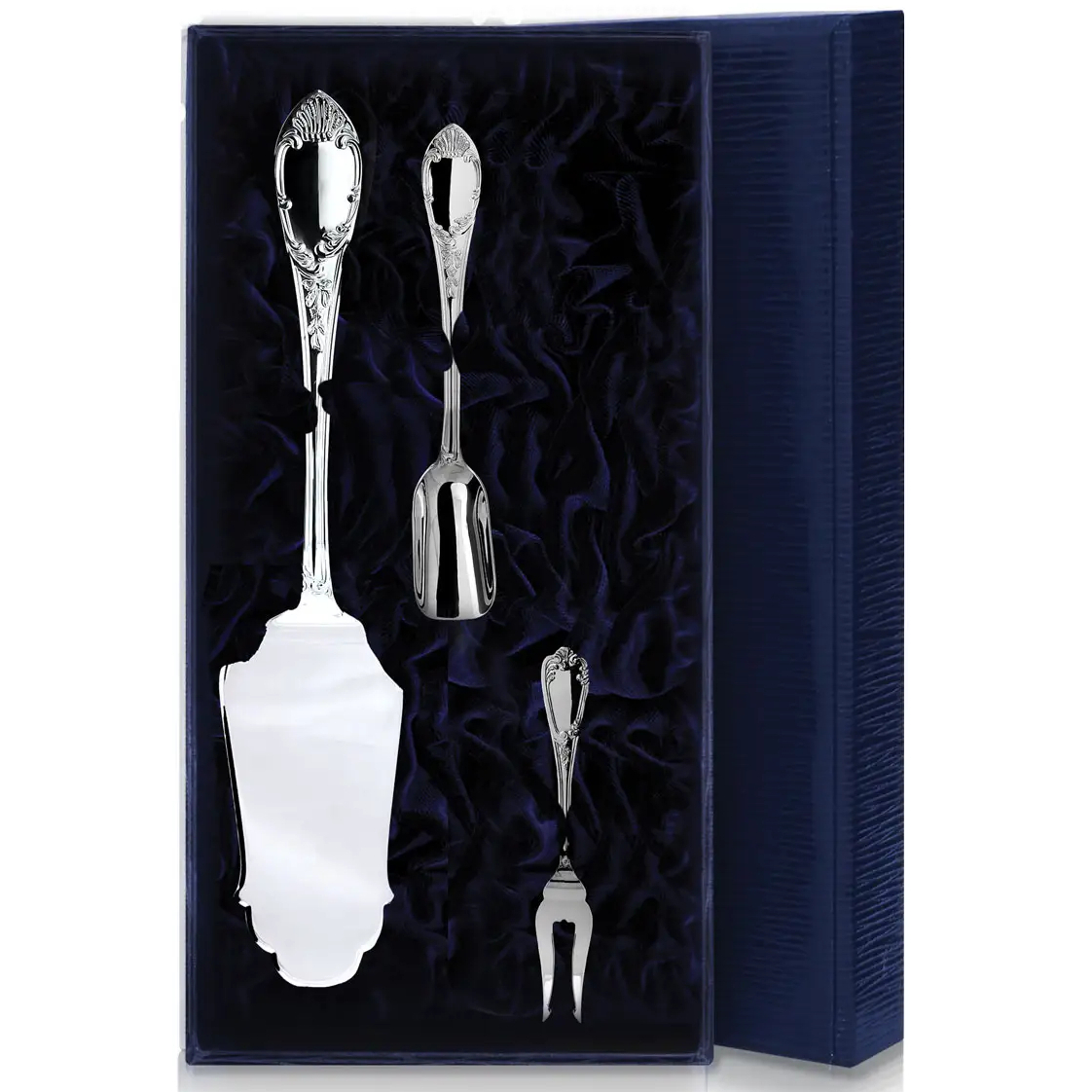 Комплектация:лопатка для пирожного, вилка для лимона, совок для сахара, футляр.
