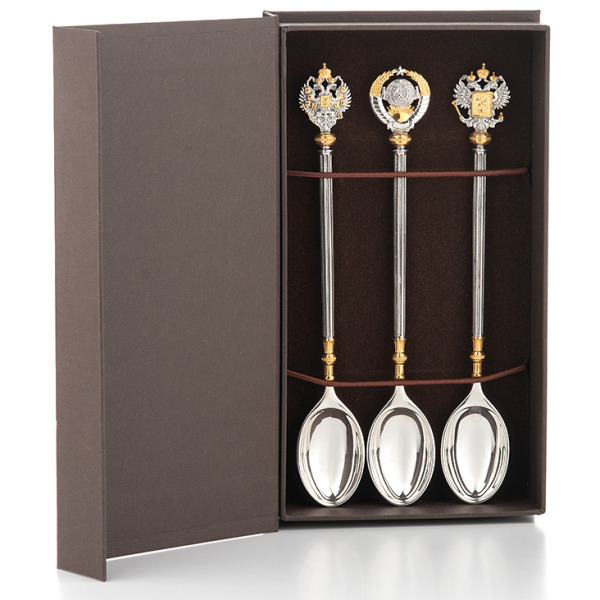 Три позолоченных чайных ложки в подарочном футляре выполнены полностью из серебра. Набор отражает ключевые этапы российской геральдики за последние 167 лет.