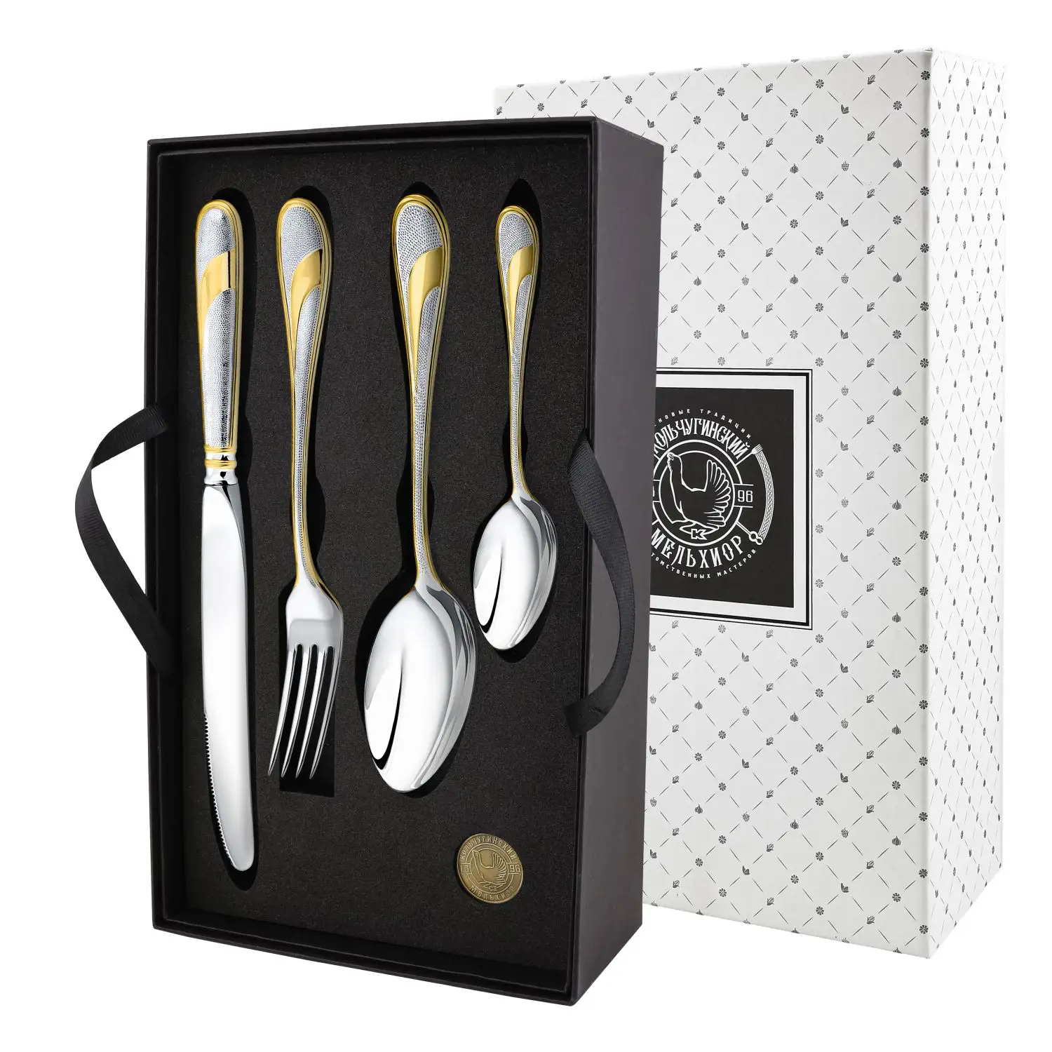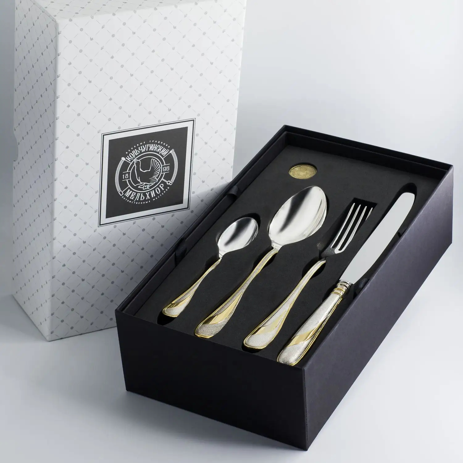 Посеребренный набор столовых приборов "Праздничная" с позолотой, на 6 персон в футлярей