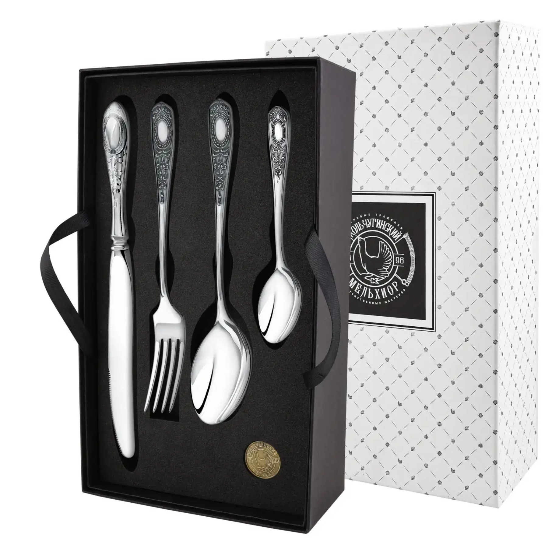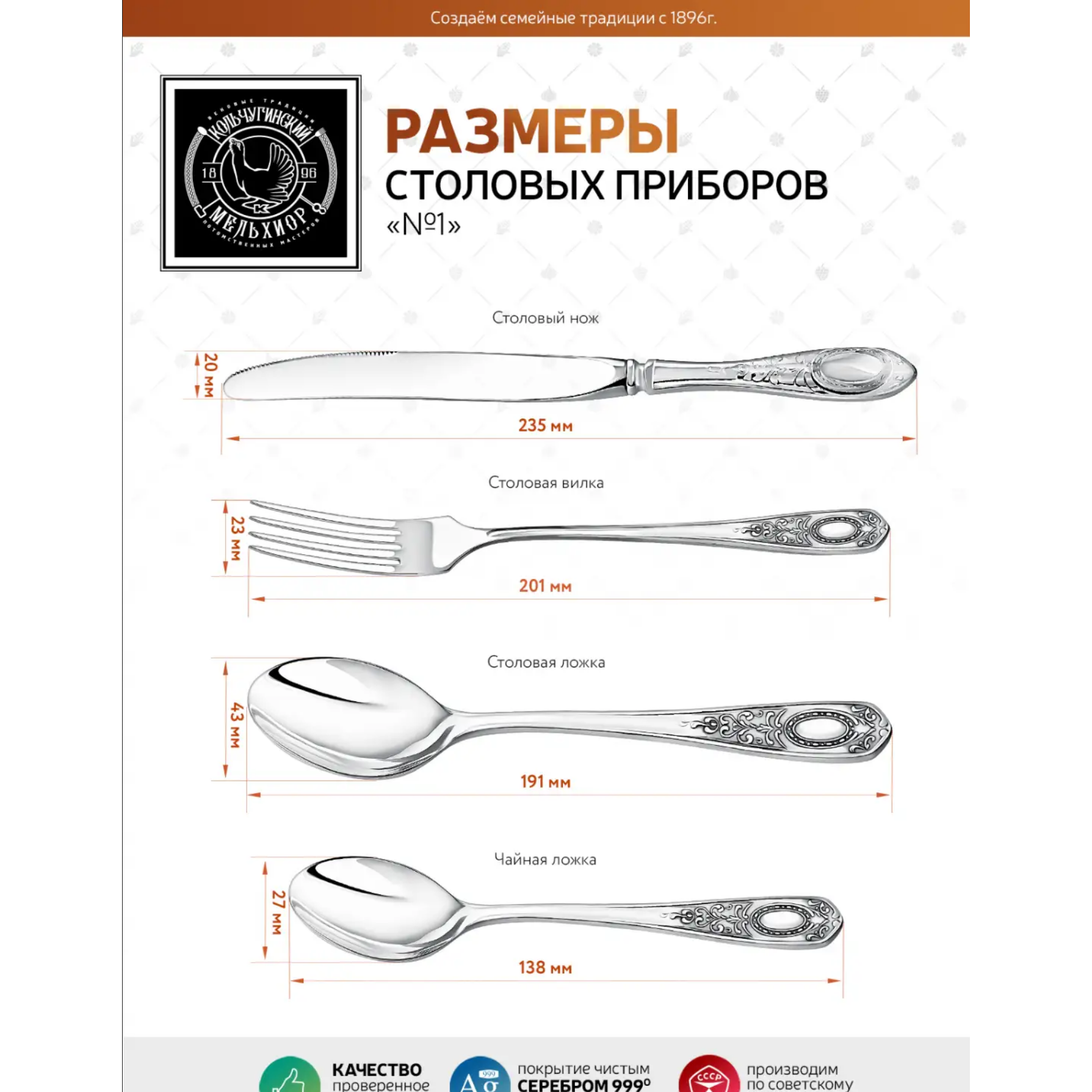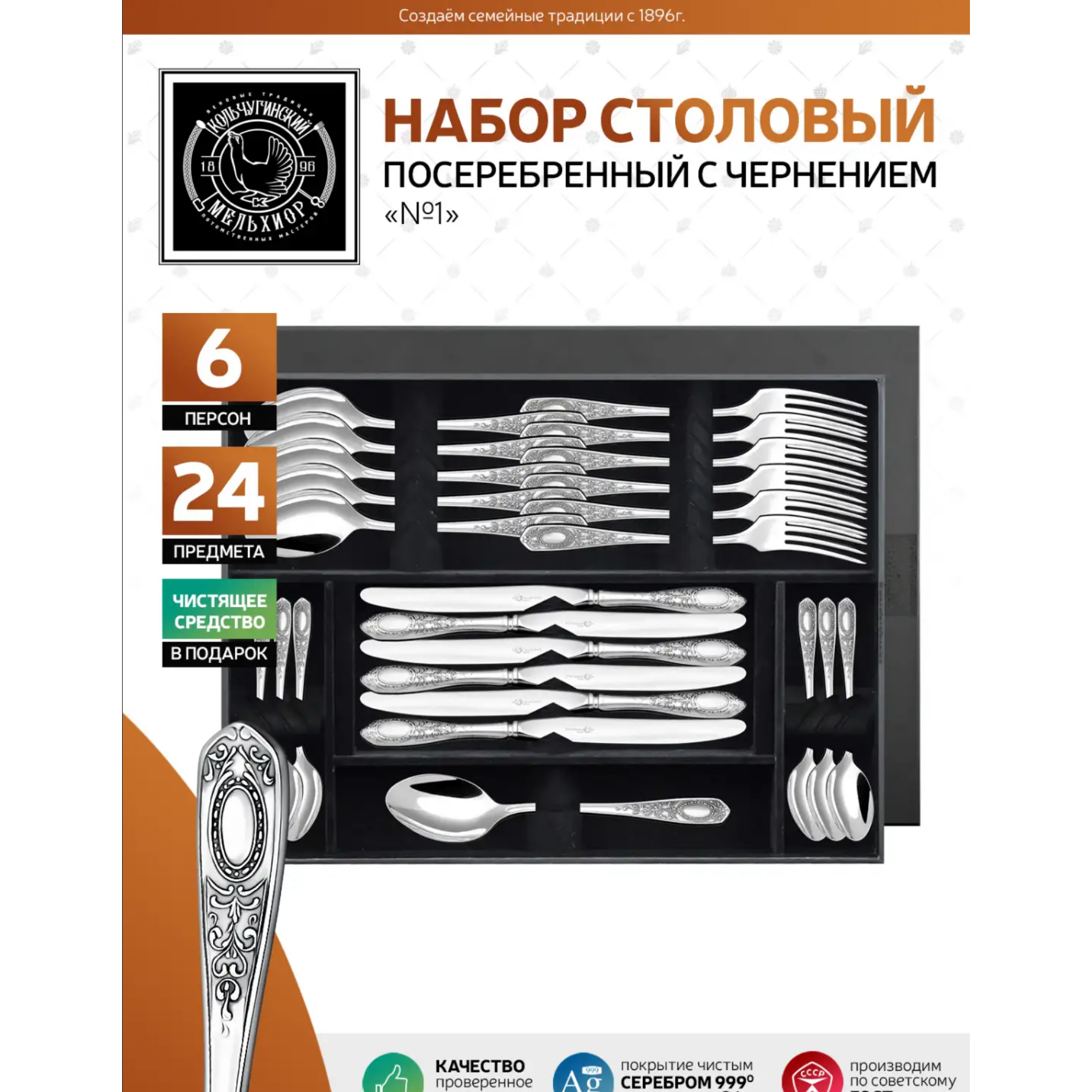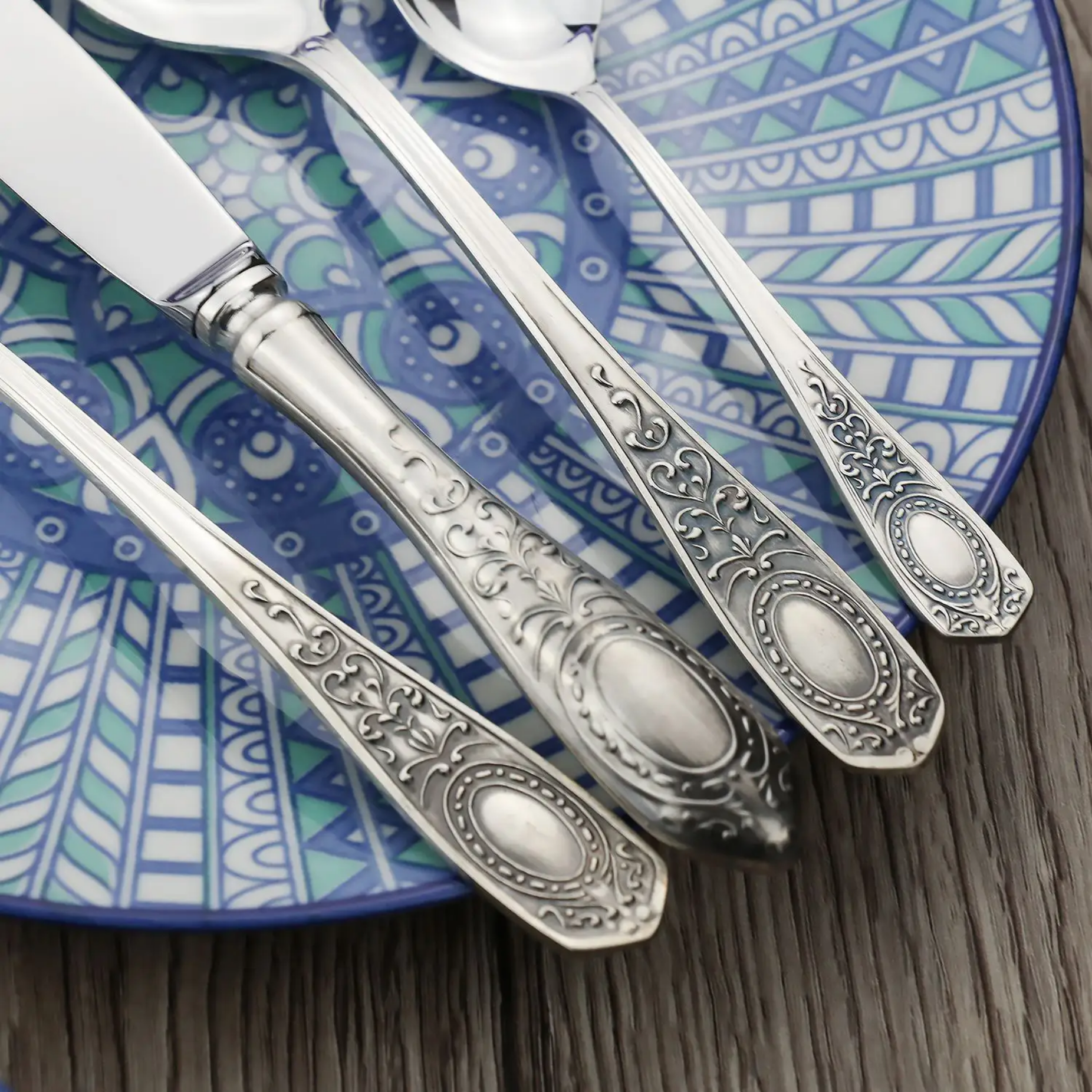 Посеребренный столовый набор "Рисунок №1": вилка, ложка, нож, чайная ложка, с чернением, на 6 персон