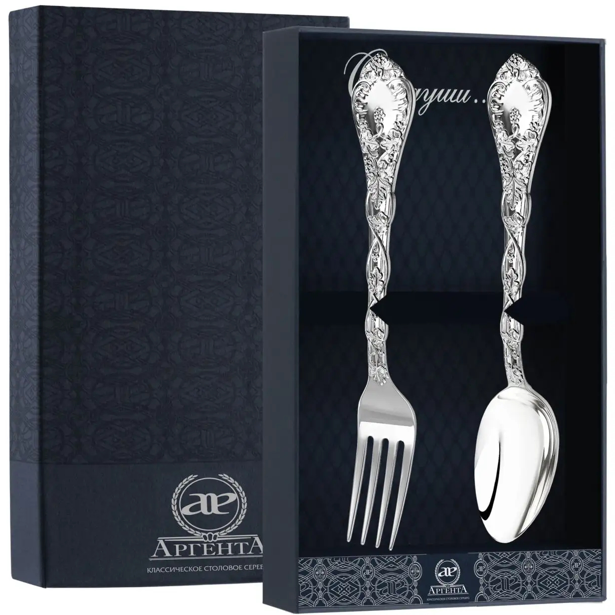 Серебряный набор столовый "Виноградная лоза": вилка и ложка, на 1 персону, в футляре