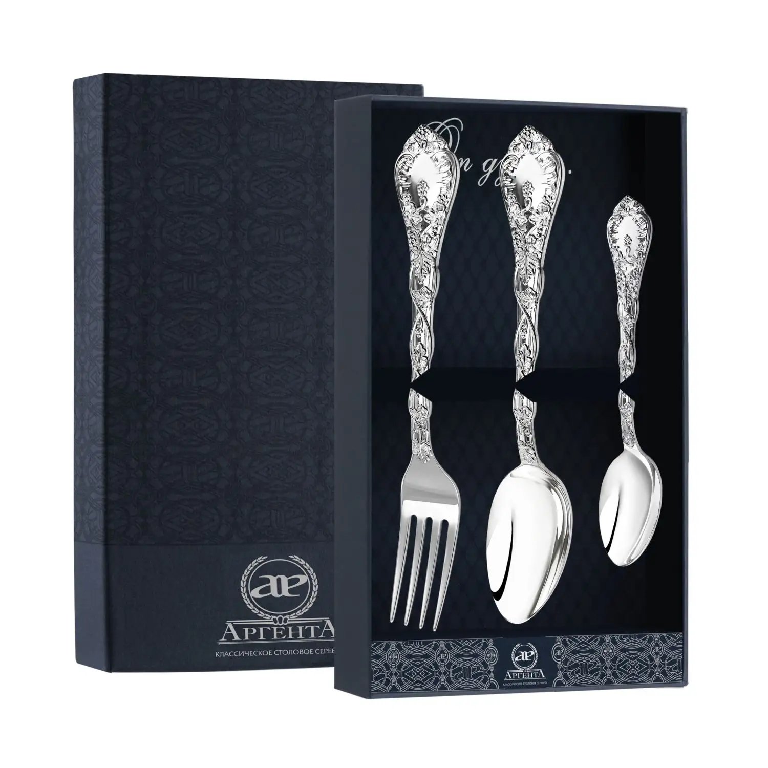 Серебряный набор столовый "Виноградная лоза": вилка, ложка, чайная ложка, на 1 персону, в футляре