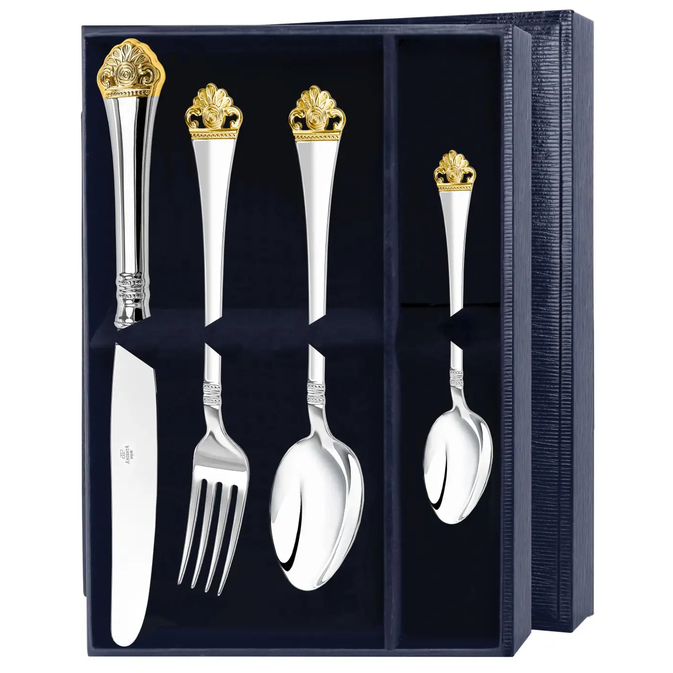 Серебряный столовый набор "Афина - Эгоист": вилка, ложка, нож, чайная ложка, с позолотой, на 1 персону