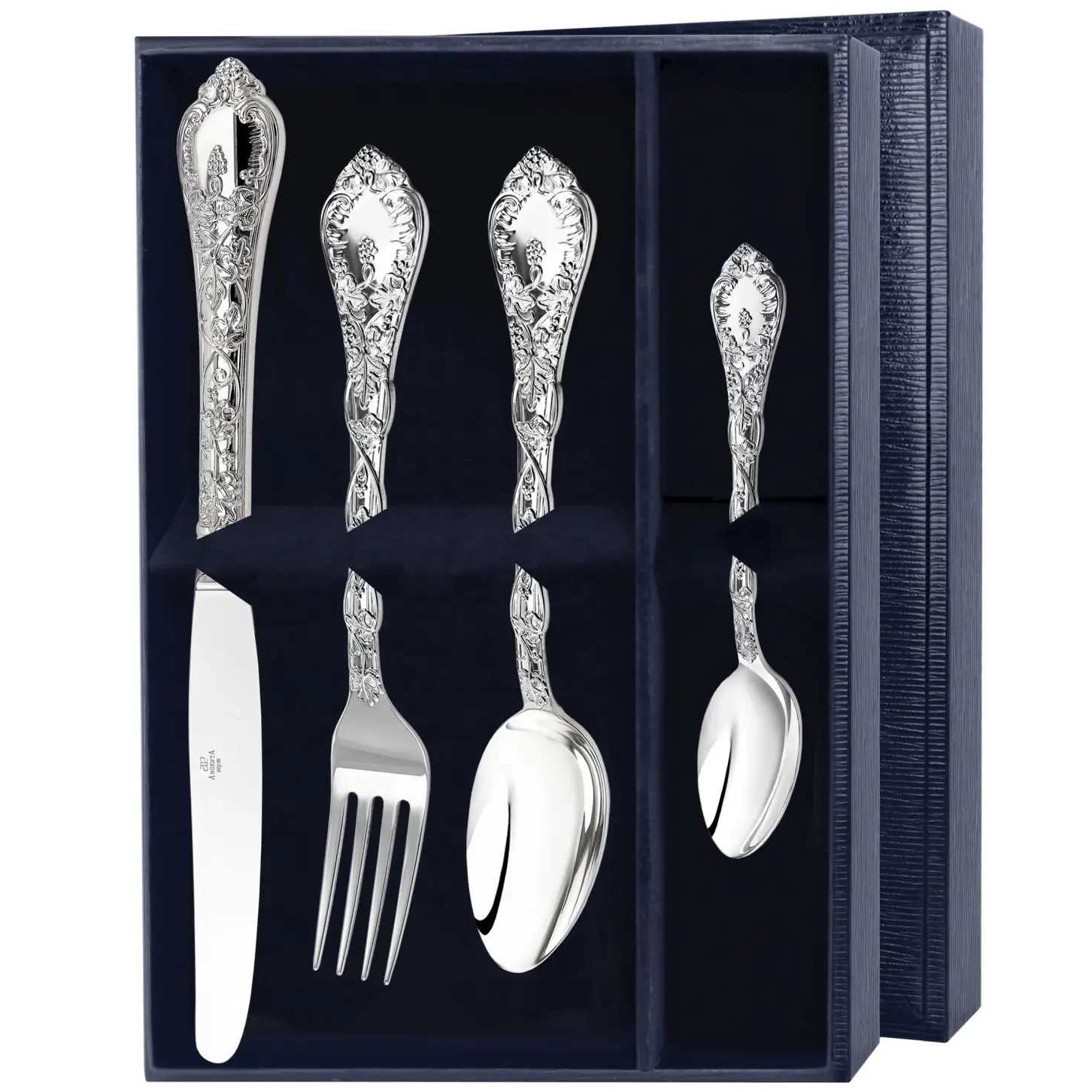 Серебряный столовый набор "Виноградная лоза": вилка, ложка, нож, чайная ложка, на 1 персону