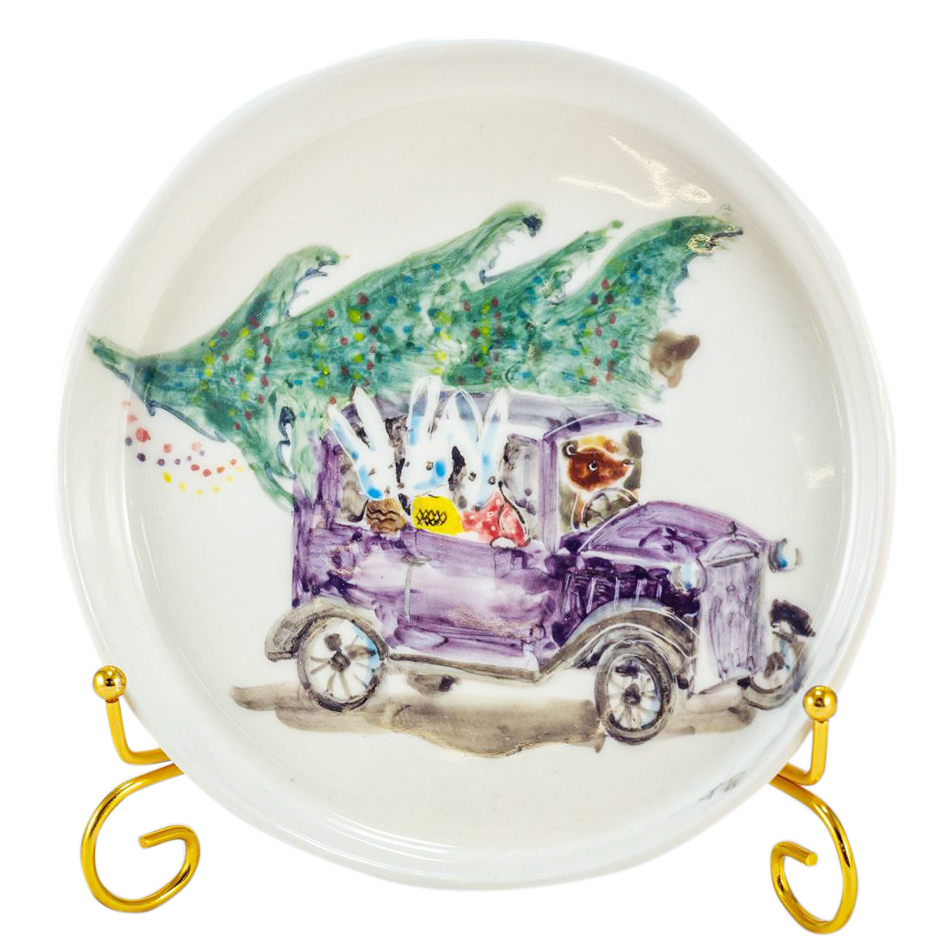 Тарелка фарфоровая "Медведь с зайцами" с ручной росписью
