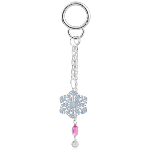 Серебряный брелок в форме снежинки — это изящный ювелирный аксессуар, превращающий повседневную деталь в акт эстетического выбора. Выполненный из стерлингового серебра, он украшен филигранной шестилучевой снежинкой с безупречно выверенной симметрией. Холодный блеск металла перекликается с лёгким сиянием голубой гильошированной поверхности, а внизу к подвесу прикреплён каплевидный корунд насыщенного розового оттенка, играющий на свету подобно застывшей капле зимнего заката. Завершающий акцент — фирменная медаль с инициалами мастера — подчеркивает исключительное происхождение предмета.