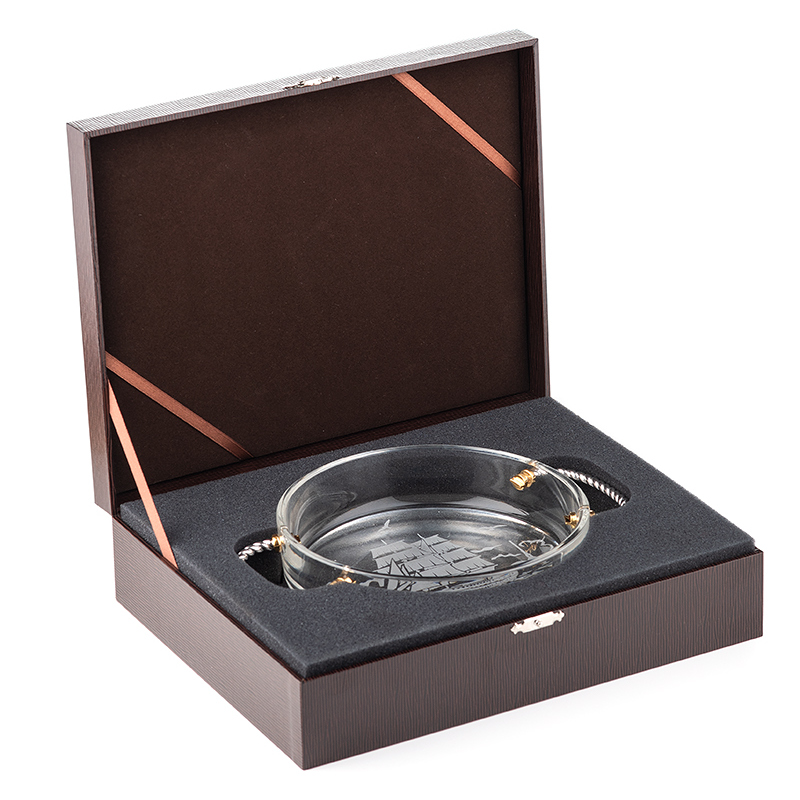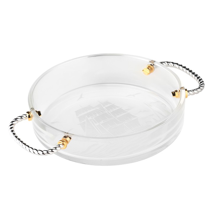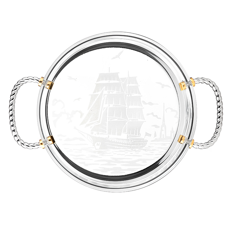 Постановочная, коллекционная тарелка, выполнена из хрусталя вручную. Круглая ёмкость, по форме иллюминатора, снабжена литыми серебряными ручками в морском стиле, в виде канатов. По дну тарелки нанесен рисунок с бригантиной «Россия». Фирменный подарочный футляр в комплекте.