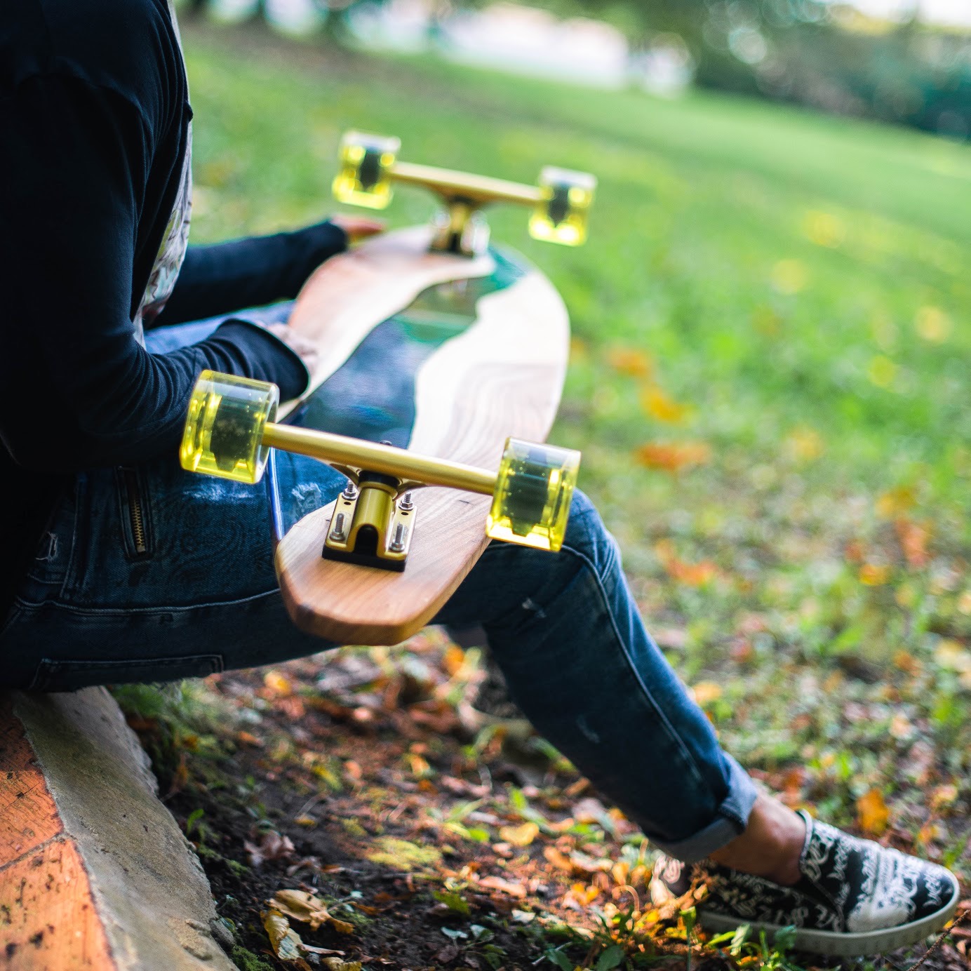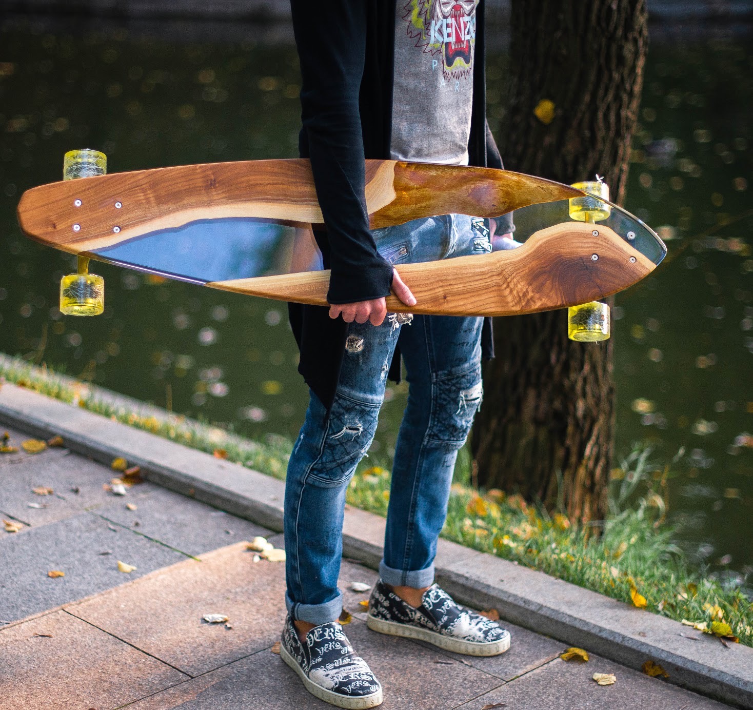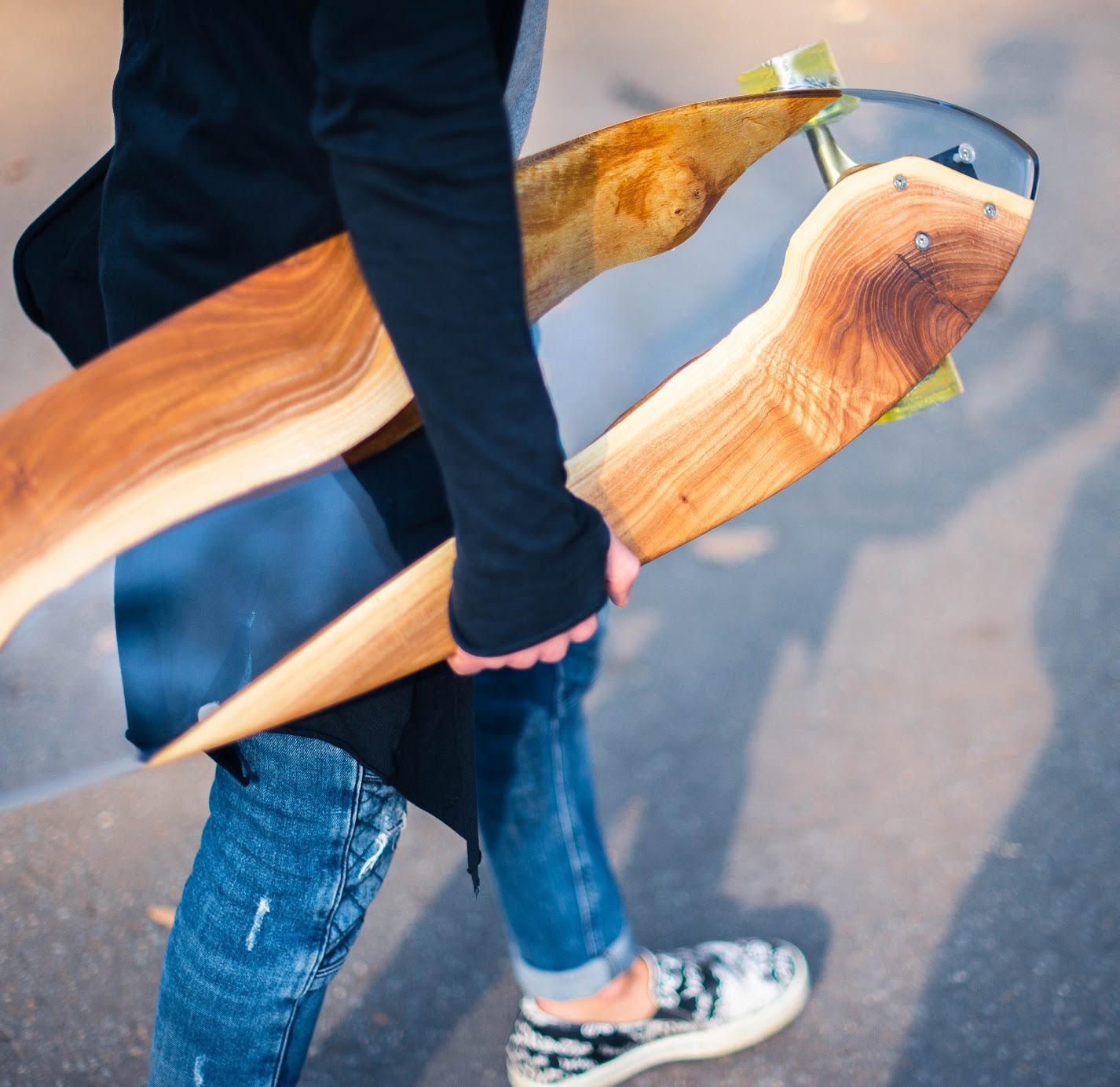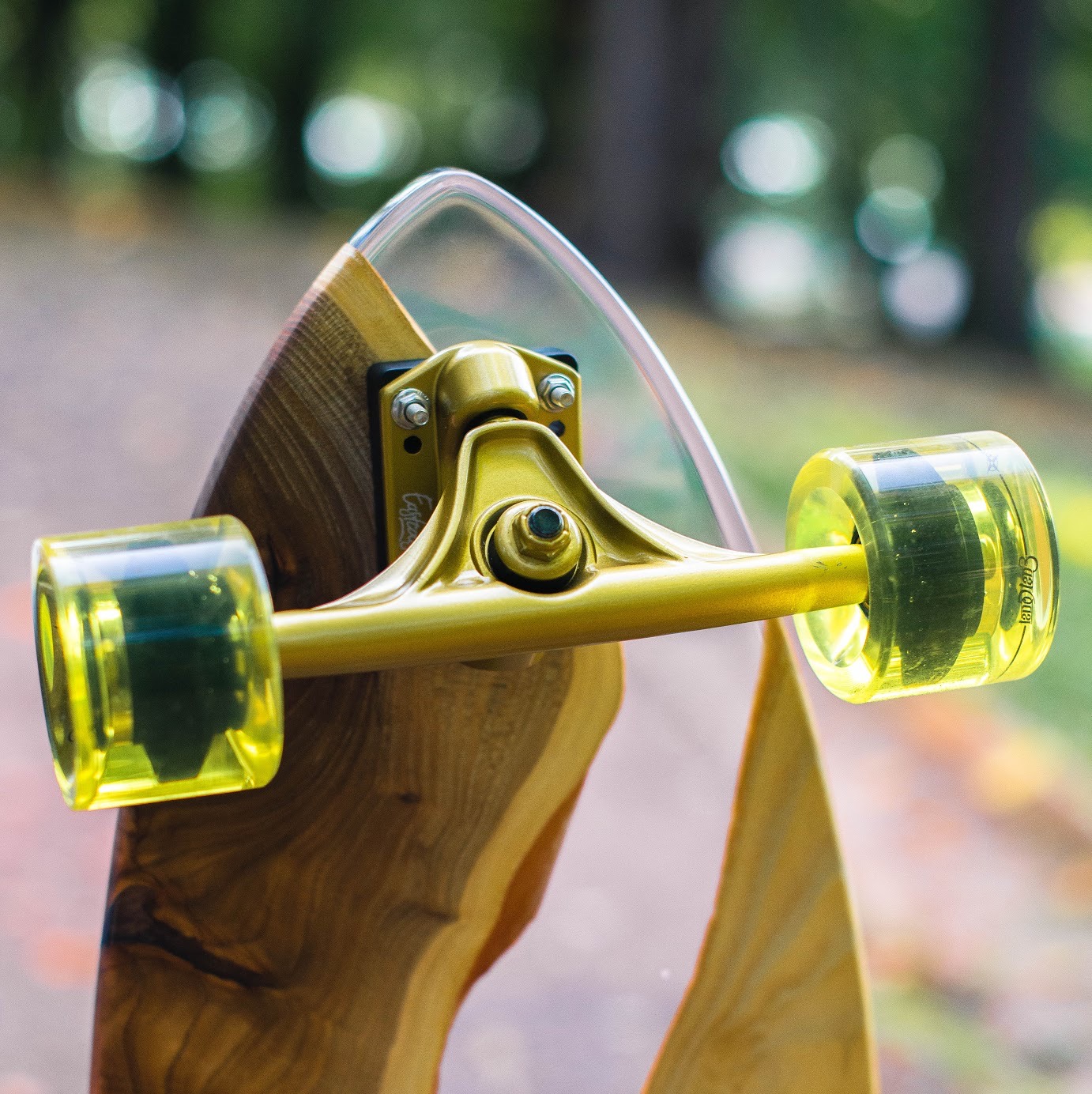 Линии формы отточены до совершенства: изгибы платформы повторяют анатомию движения, создавая комфортную и уверенную посадку под ноги. Жёлтые полупрозрачные колёса дополняют общее впечатление — лёгкость, драйв, прозрачность, стиль. Каждый винт и крепление продуман до мелочей, а шлифовка поверхности доведена до идеального глянца. Лонгборд выглядит так, будто выточен из цельного куска света и дерева, сливаясь с дорогой и при этом выделяясь на фоне всего остального.