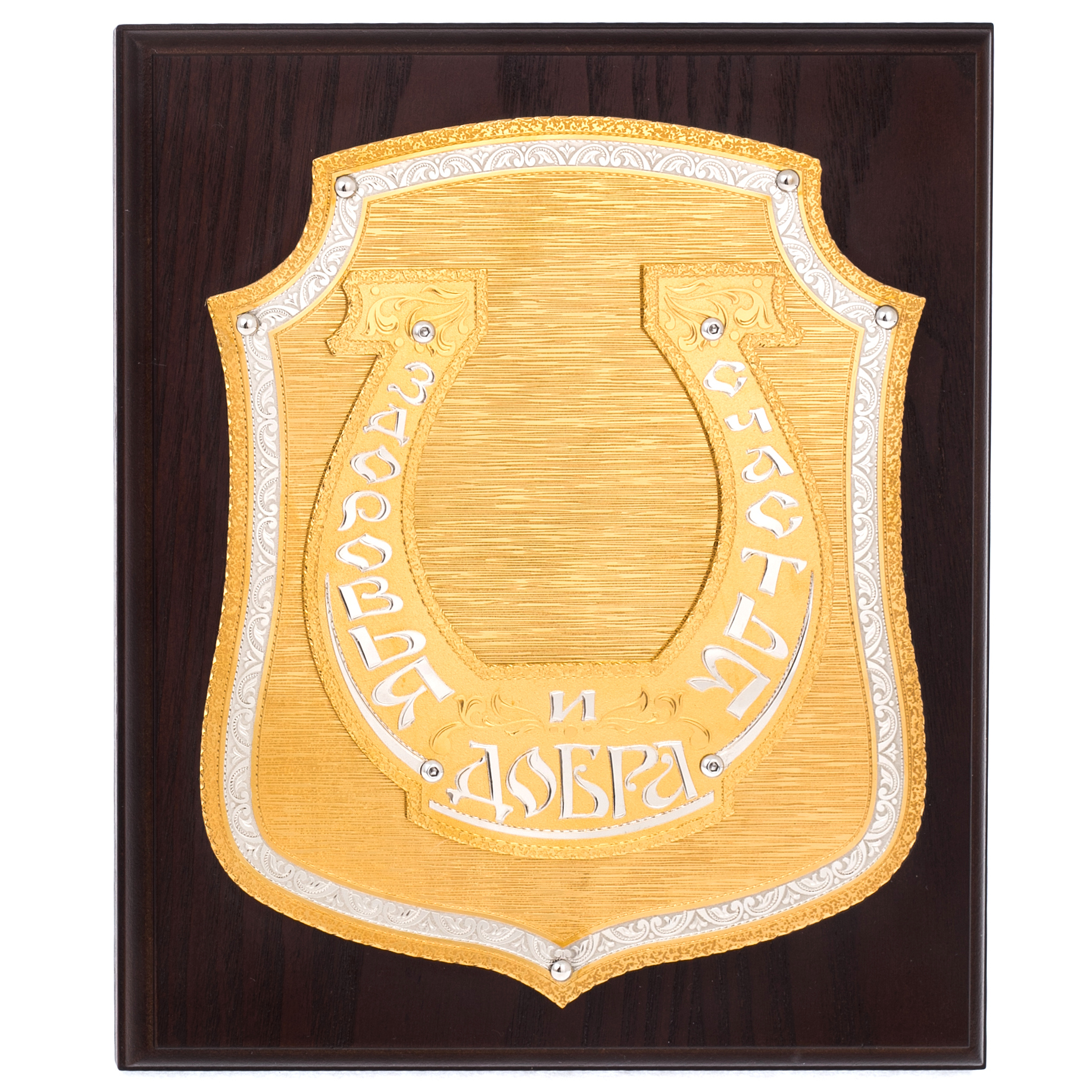 Плакетка на подставке с символом подковы являет собой изысканный декоративный объект, созданный для тех, кто ценит знаки благополучия, исполненные в роскошной, торжественной манере. Основу изделия формирует темное благородное дерево, обладающее ровной текстурой и глубоким матовым блеском. Его поверхность послужила фоном для массивной золочёной пластины, выполненной в технике златоустовского травления. Подкова, помещённая в центр щита, выделена рельефом, сложным орнаментальным полем и серебристой гравировкой, формирующей надпись «Здоровья, счастья и добра». Каждый завиток и каждая линия выгравированы предельно чётко, подчеркивая статусный характер подарка.