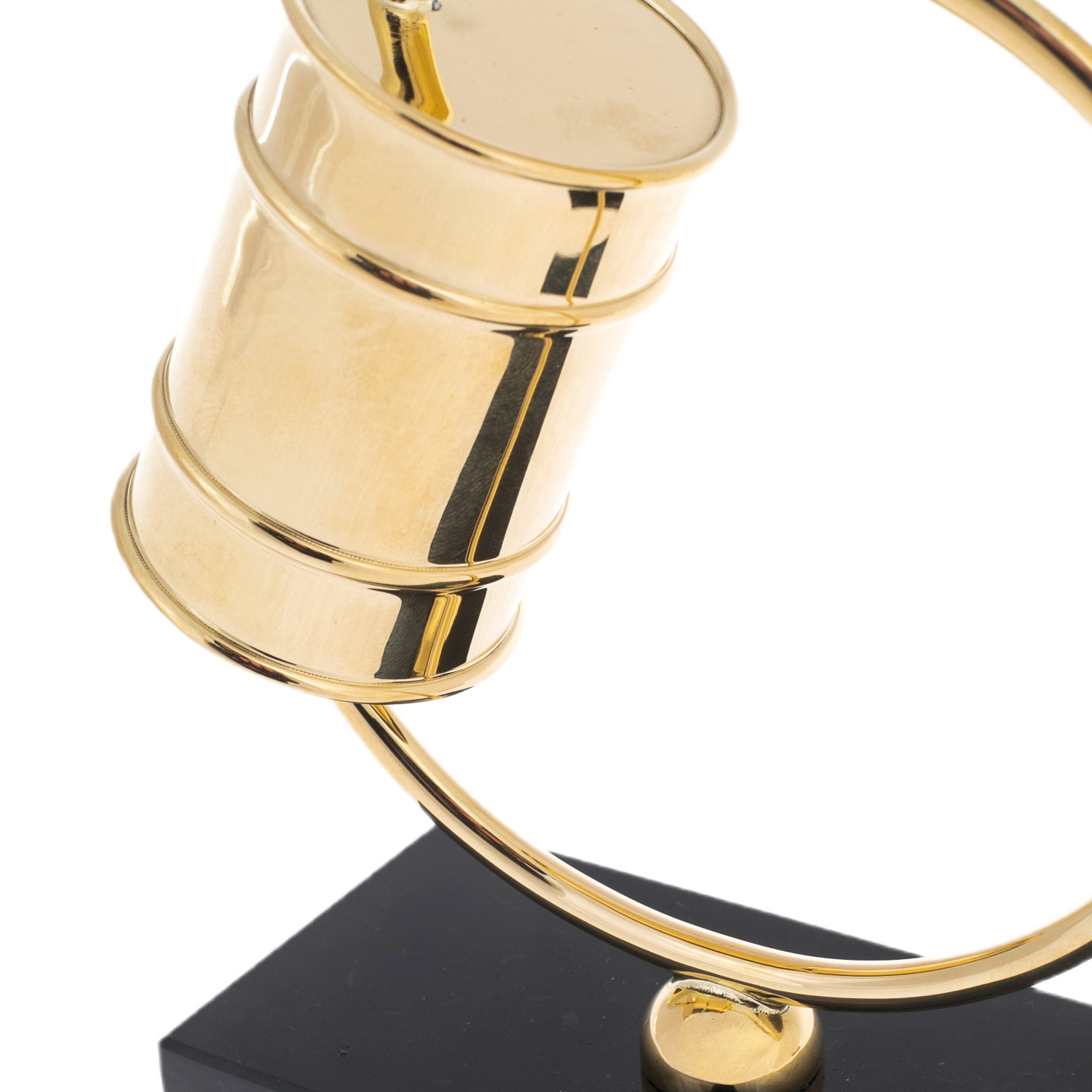 Гладкое основание из черного мрамора, напоминающее ночное небо, насыщенное тайной и глубиной, создает гармоничный контраст с сиянием латуни. Этот камень веками символизировал вечность и силу, и здесь он становится прочной основой, удерживающей символ мирового господства. Как будто сама природа протянула руку, чтобы поддержать эту золотую сущность.