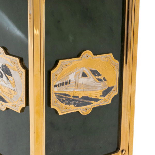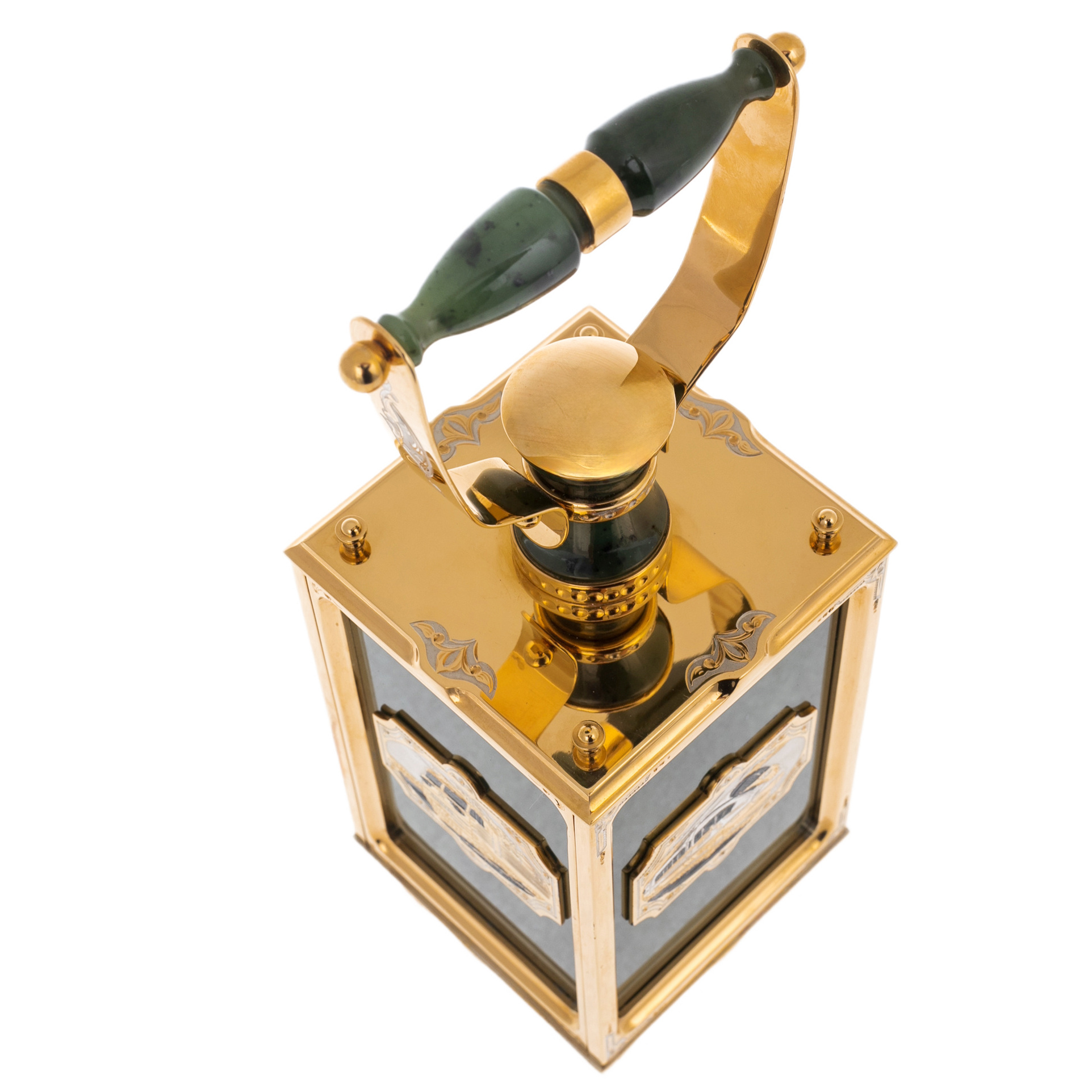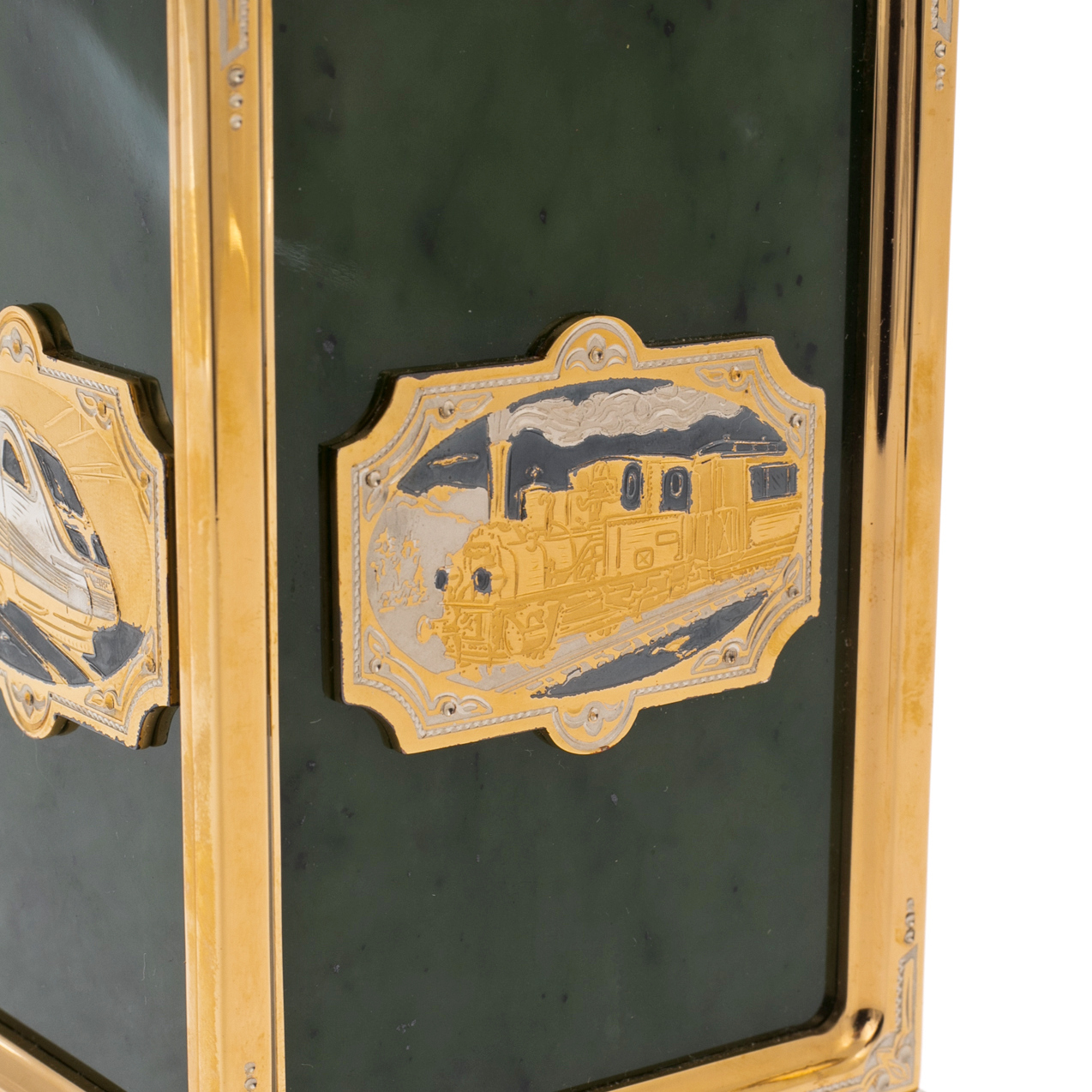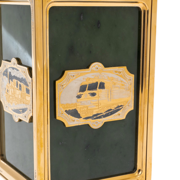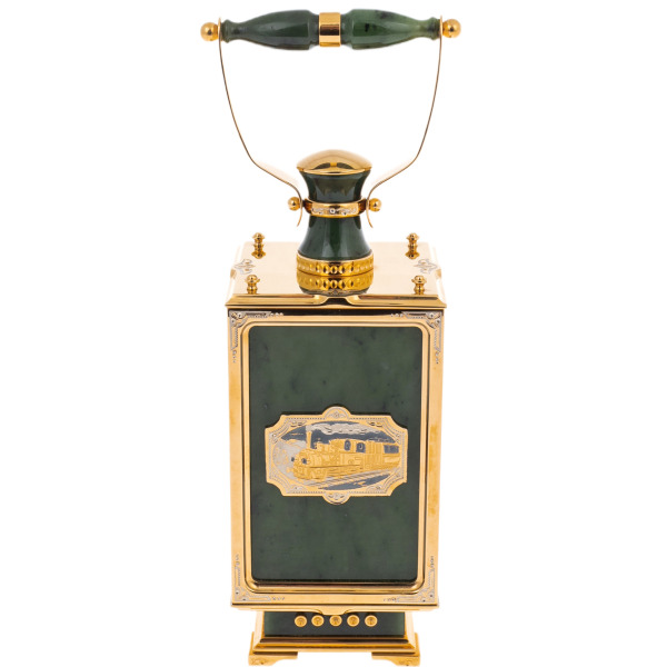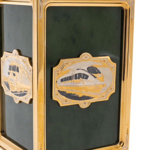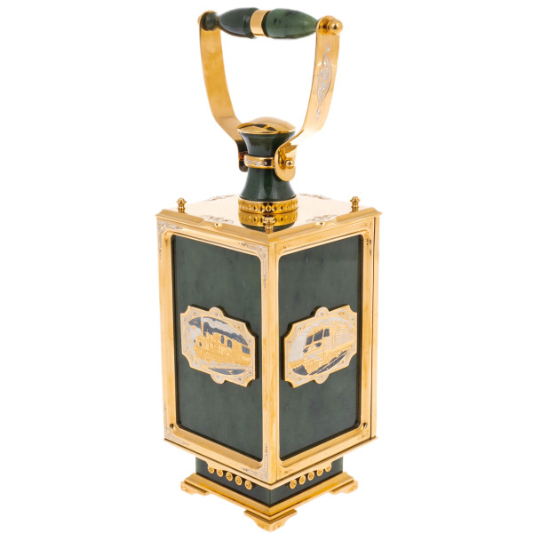 Сувенирный фонарь, выполненный из натурального нефрита и украшенный позолоченным металлом, представляет собой не просто декоративный предмет, а символ вечного пути, света и силы. Его форма навеяна мотивами старинных железнодорожных фонарей — тех самых, что сопровождали составы в дальние путешествия и встречали на перронах людей, изменённых временем и дорогой. Каждая грань облицована благородным зелёным нефритом, создающим впечатление глубины и спокойствия, а по центру размещены миниатюрные барельефы с изображениями паровоза и локомотива — золотые силуэты прошлого и настоящего, заключённые в изящные рамки с гравировкой.