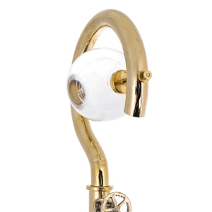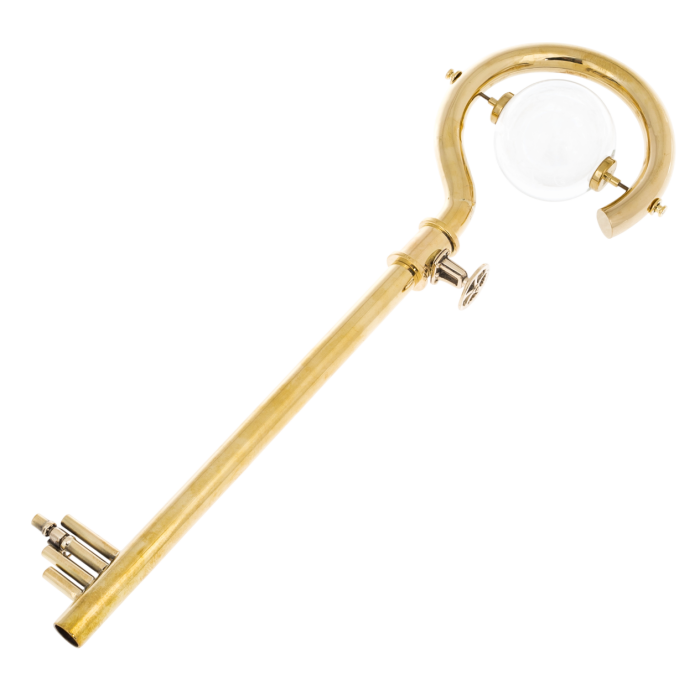 Изделие выполнено из латуни — металла, олицетворяющего надёжность и устойчивость. В его изогнутой форме угадываются очертания буровой арматуры, а в центре помещён хрустальный шар — словно капля нефти, заключённая в свете. Он символизирует планету, чьи богатства человек сумел постичь и подчинить благодаря знаниям и смелости. Каждая деталь отшлифована до зеркального блеска, создавая игру бликов, напоминающих отблески пламени на поверхности металла.