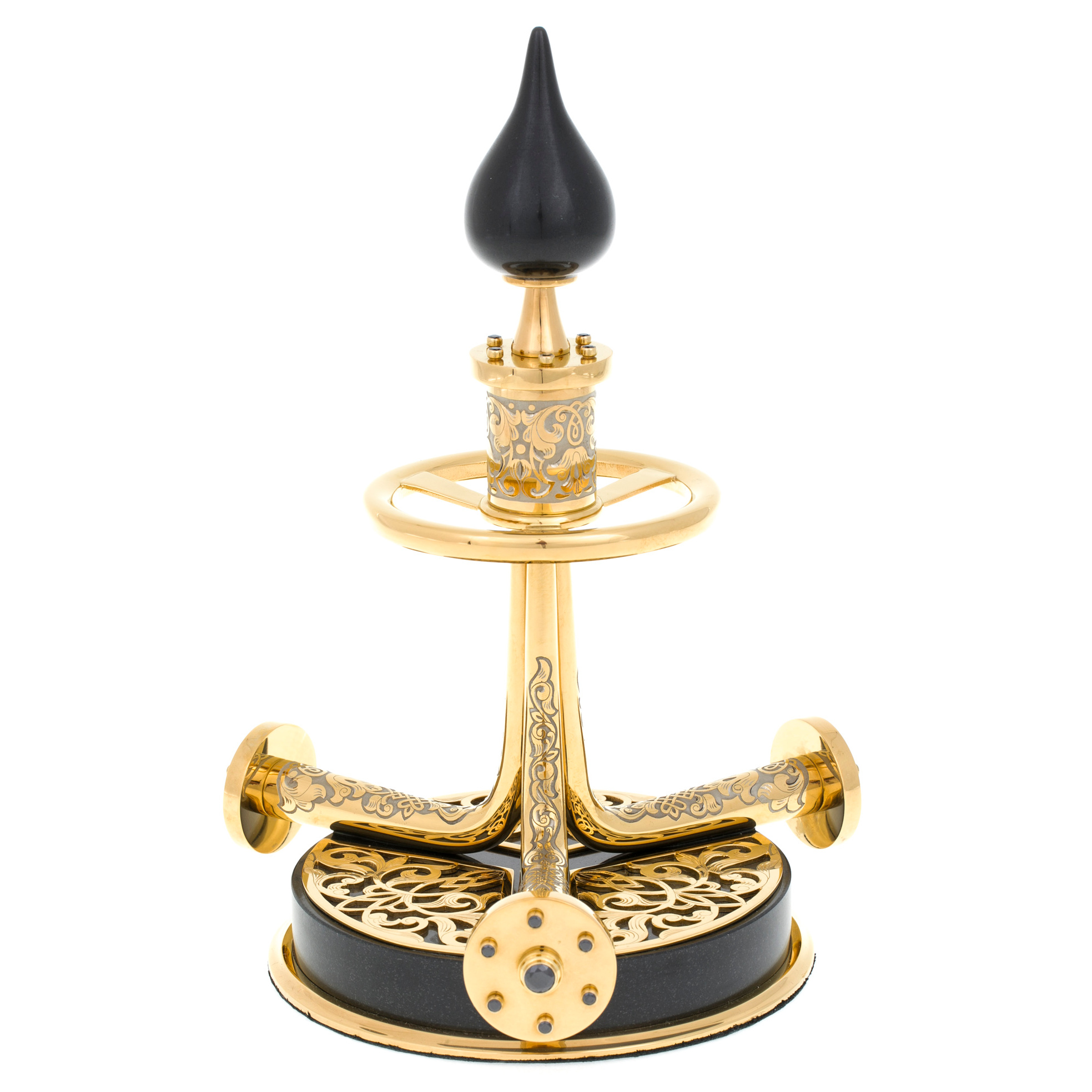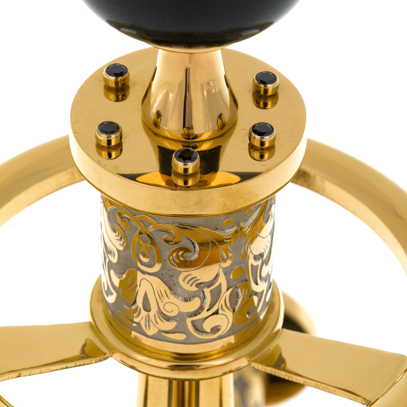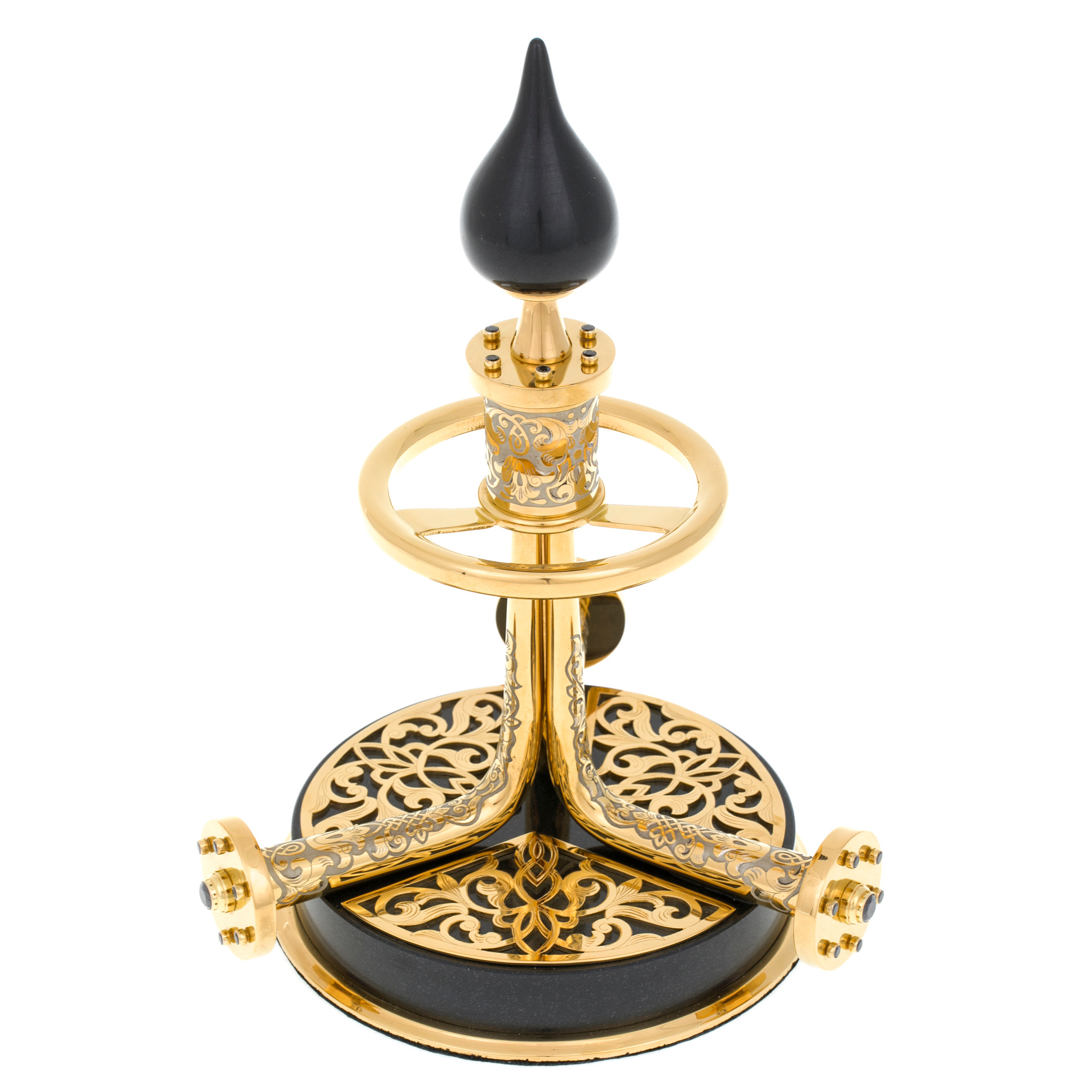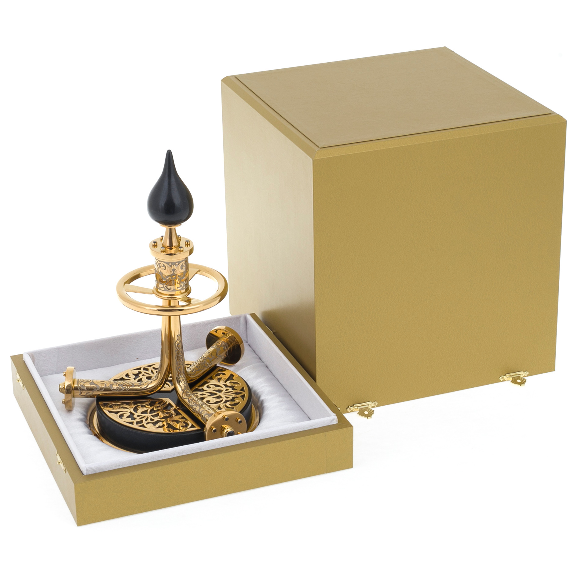 Основание и нефтяная капля выточены из прочного натурального долерита и отполированы вручную. Основа композиции, трубы и запорная арматура покрыты вуалью из золота 999 пробы, нанесённой на сплав стали и латуни. Золочение декорировано филигранной гравировкой. После травления узоры выглядят объёмными. На деталях сувенира использовано и чернение по серебру. Это очень трудоёмкая процедура, после которой поверхность металла напоминает чёрный бархат. На его фоне золочёные участки сияют выразительнее и ярче. Инкрустация австрийскими фианитами на трубах и арматуре (всего 24 камня) дополняет концепцию: нефть - символ достатка, чёрное "золото".