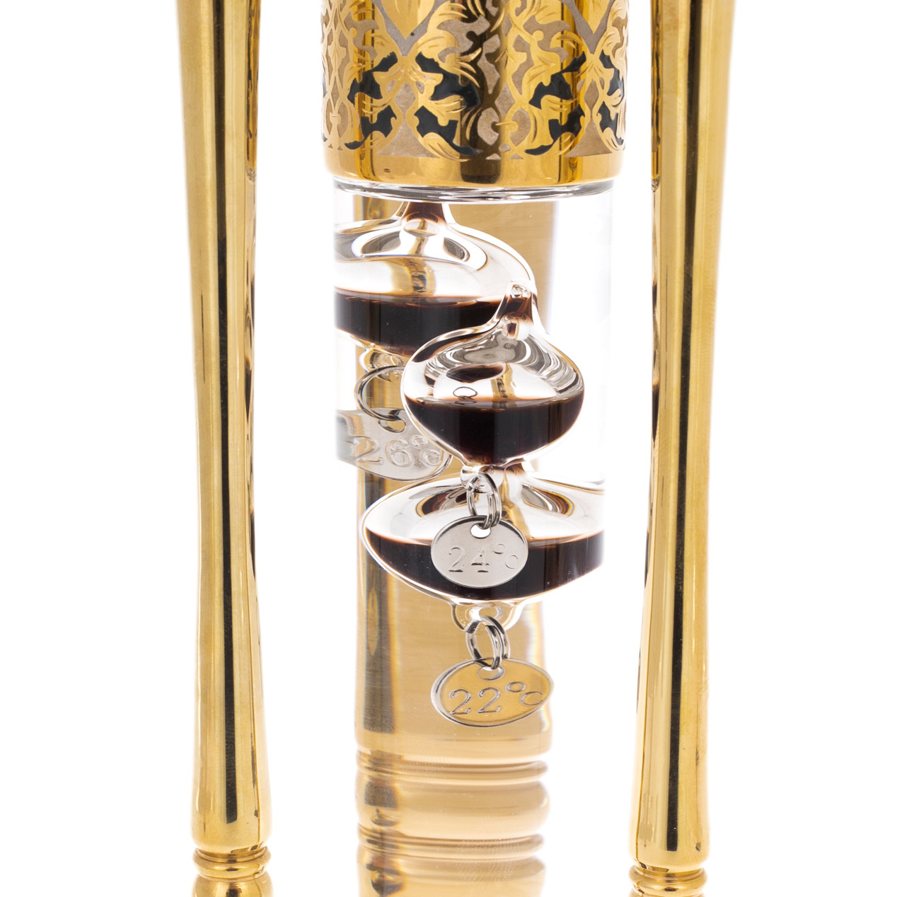 В основе функционального настольного сувенира заложены стеклянная колба и сферы, заполненные жидкостью, каждая из которых имеет определенное значение температуры.