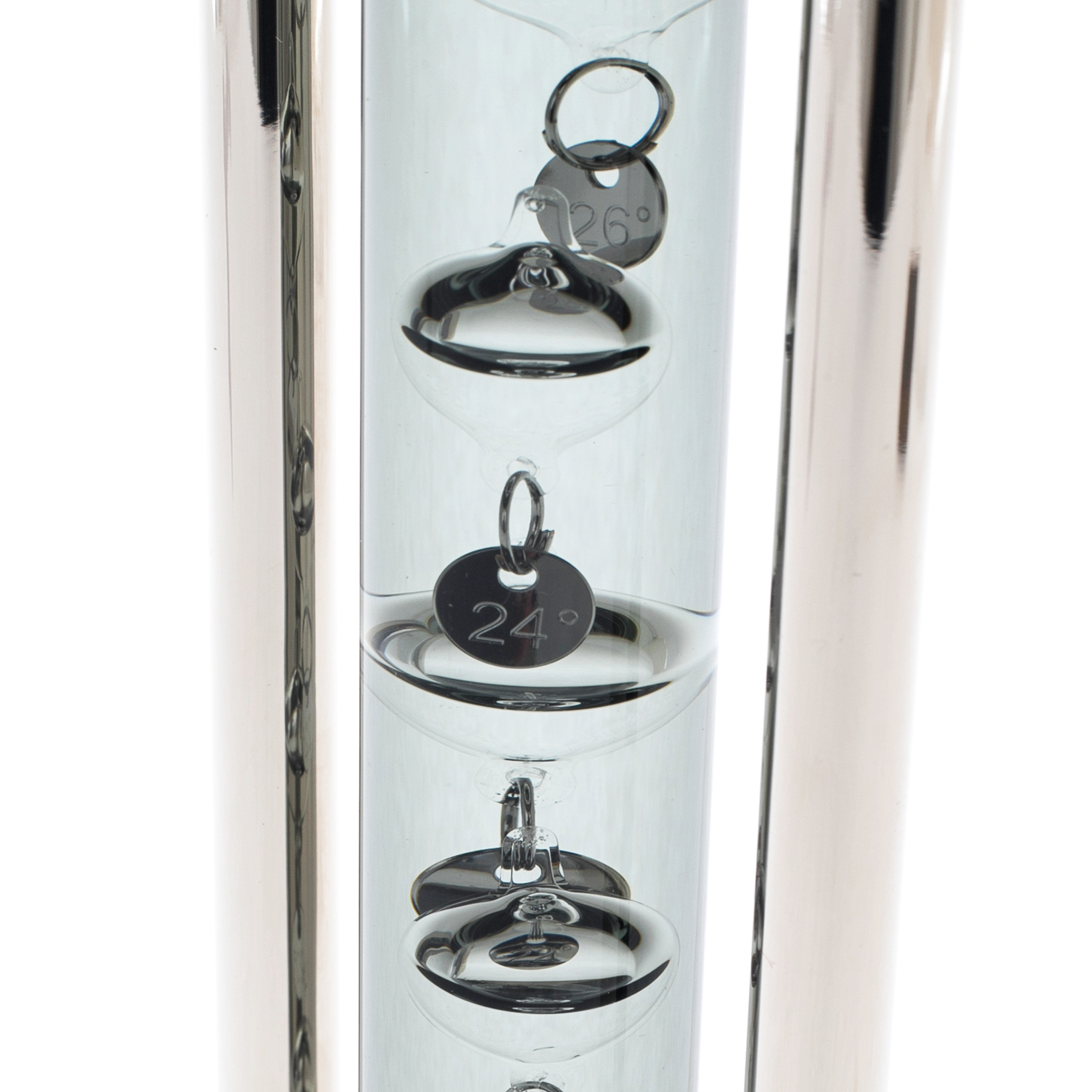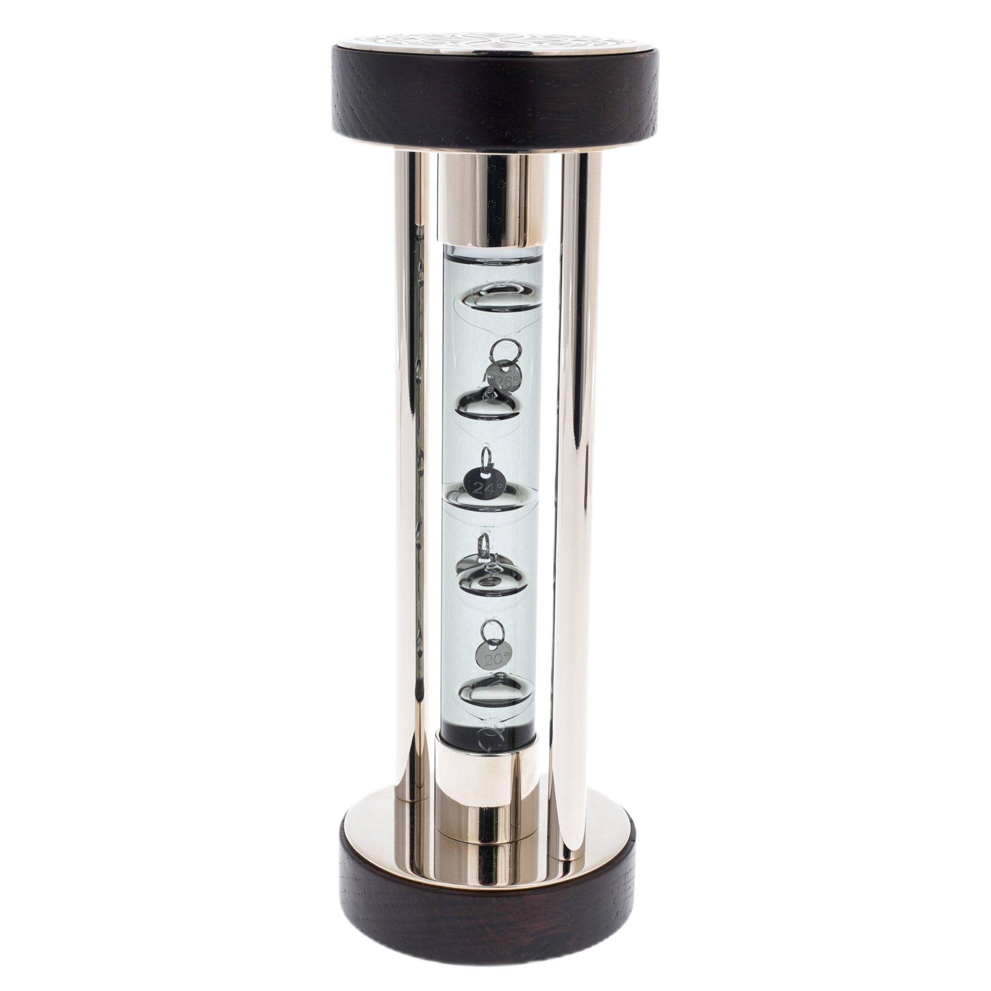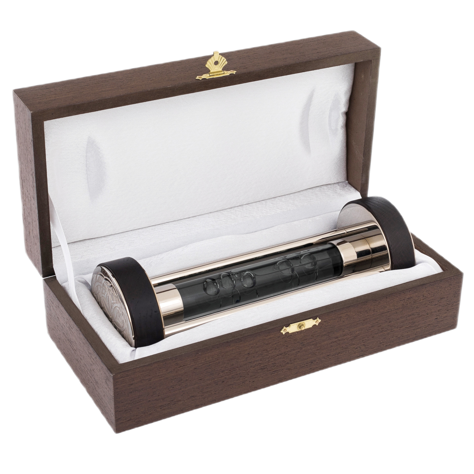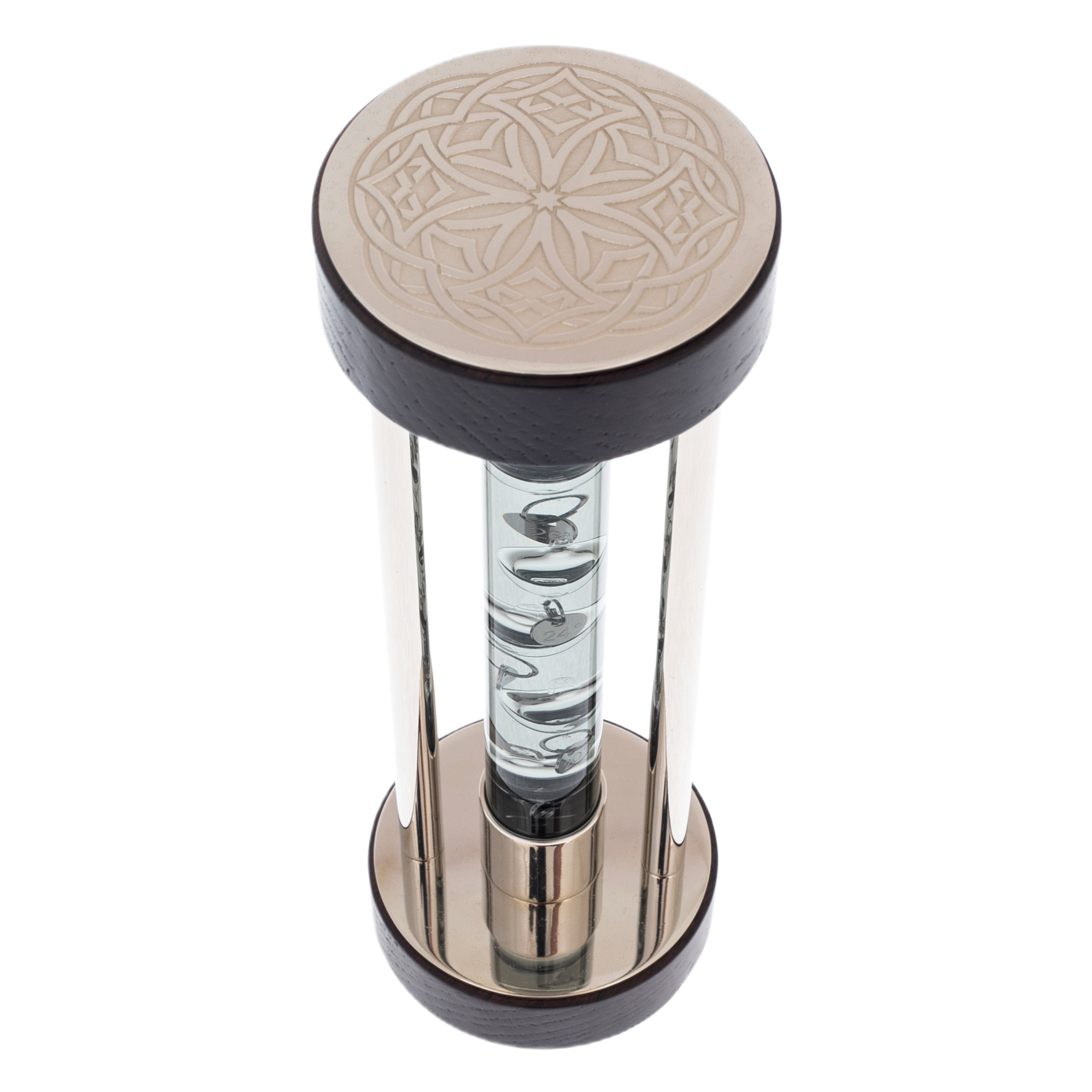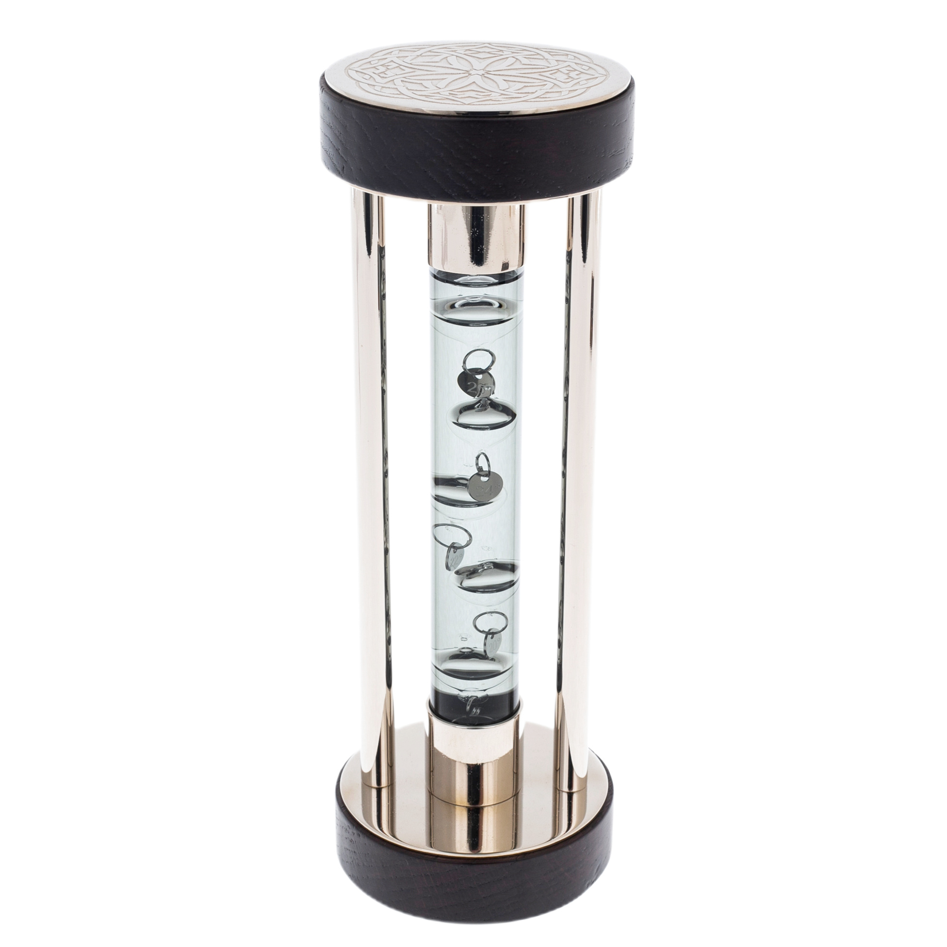 Термометр «Нефть» из Златоуста — это изысканный предмет интерьера, воплощающий гармонию науки, искусства и высочайшего мастерства. Его конструкция основана на цилиндрическом стеклянном сосуде с жидкостью, внутри которого плавно движутся стеклянные капсулы с металлическими жетонами, обозначающими температуру. Основание и верхняя часть выполнены из дерева глубокого оттенка, украшенного никелированными вставками, а строгие вертикальные опоры придают всей композиции монументальность и лаконичность. Верхняя плоскость термометра дополнена художественным орнаментом, что подчеркивает внимание мастеров к эстетике даже в деталях.