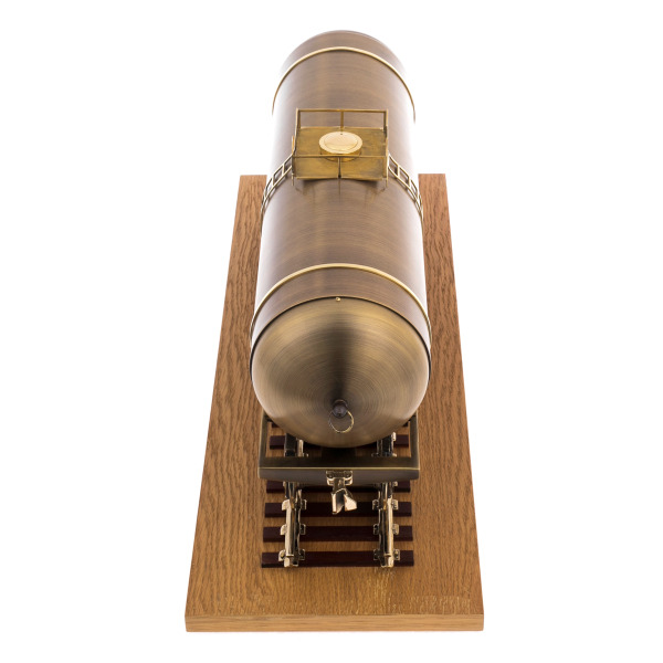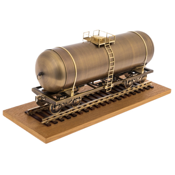 Цистерна на рельсах, выполненная с филигранной точностью, отражает эстетику промышленных эпох, когда каждый элемент техники нес отпечаток инженерной гениальности. Ее бронзовая поверхность, выполненная с изысканным матовым блеском, будто хранит в себе тепло тех далеких лет, когда металл был символом силы и величия.