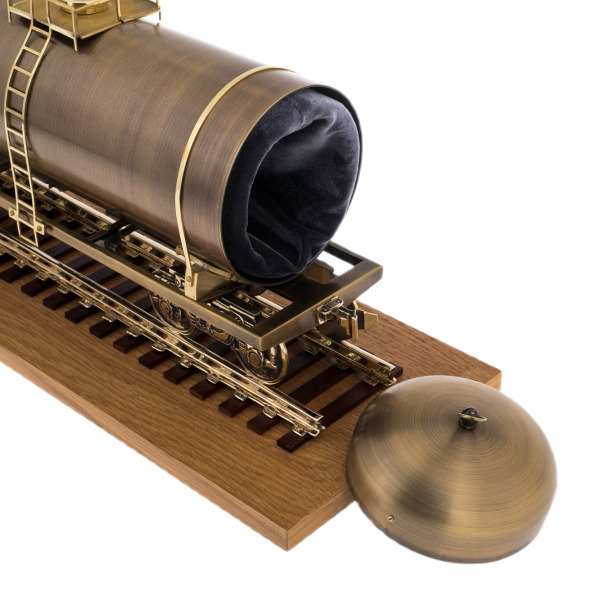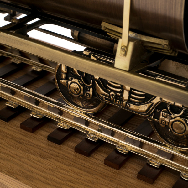 Тончайшие детали, такие как миниатюрная лестница, ведущая к платформе, или проработанные колесные пары, придают изделию глубину и объем, превращая его в произведение искусства. Каждая рельса, аккуратно уложенная на массивное деревянное основание, говорит о стабильности и надежности — тех самых качествах, которые ценят сильные мира сего.