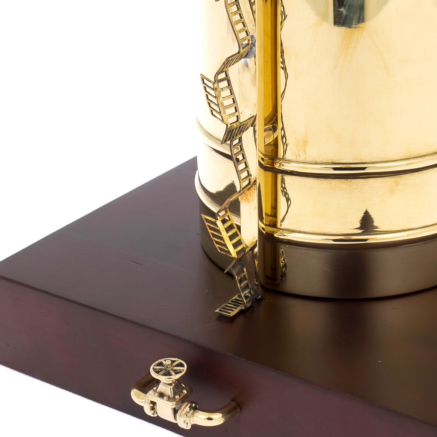 Каждый элемент этой уникальной упаковки словно олицетворяет могучую энергетику нефти, превращая предмет утилитарного назначения в произведение искусства. Выполненная из латунного сплава, "Нефтяная бочка" сверкает благородным золотым блеском, который как будто напоминает о солнечных лучах, погребённых миллионы лет назад глубоко под землёй. Этот аксессуар, предназначенный для хранения элитных напитков, превращает процесс дарения в ритуал, исполненный уважения к ценностям и символам.