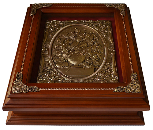 Элегантная строгая композиция, выполненная методом гальванопластики, напоминает классическое панно. Однако на деле представляет собой весьма функциональную вещь – ключницу – ящичек для хранения ключей. Декоративная часть композиции выполнена из меди (объёмный рельеф) с различными покрытиями серебрение, золочение, латунировании, применяются ювелирные эмали, кристаллы Swarovski. Внутри ключницы одиннадцать крючков, отделка бархат, магнит на крышке, крышка крепится к основанию при помощи двух латунных петель, на задней стороне подвесы для крепления на стену. Корпус ключницы изготовлен из натурального дерева дуб с различными цветами тонировки.