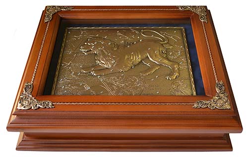 Элегантная строгая композиция, выполненная методом гальванопластики, напоминает классическое панно. Однако на деле представляет собой весьма функциональную вещь – ключницу – ящичек для хранения ключей. Декоративная часть композиции выполнена из меди (объёмный рельеф), украшена кристаллами Сваровски (Swarovski). Внутри ключницы одиннадцать крючков, отделка бархат, магнит на крышке, крышка крепится к основанию при помощи двух латунных петель, на задней стороне подвесы для крепления на стену. Корпус ключницы изготовлен из натурального дерева дуб с различными цветами тонировки.