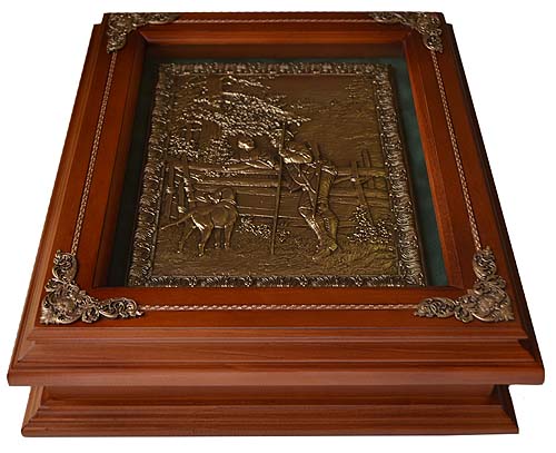 Элегантная строгая композиция, выполненная методом гальванопластики, напоминает классическое панно. Однако на деле представляет собой весьма функциональную вещь – ключницу – ящичек для хранения ключей. Декоративная часть композиции выполнена из меди (объёмный рельеф) . Внутри ключницы одиннадцать крючков, отделка бархат, магнит на крышке, крышка крепится к основанию при помощи двух латунных петель, на задней стороне подвесы для крепления на стену. Корпус ключницы изготовлен из натурального дерева дуб с различными цветами тонировки.