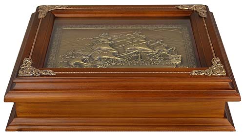 Элегантная строгая композиция, выполненная методом гальванопластики, напоминает классическое панно. Однако на деле представляет собой весьма функциональную вещь – ключницу – ящичек для хранения ключей. Декоративная часть композиции выполнена из меди (объёмный рельеф) с различными покрытиями серебрение, золочение, латунировании, применяются ювелирные эмали, кристаллы Swarovski. Внутри ключницы одиннадцать крючков, отделка бархат, магнит на крышке, крышка крепится к основанию при помощи двух латунных петель, на задней стороне подвесы для крепления на стену. Корпус ключницы изготовлен из натурального дерева дуб с различными цветами тонировки.