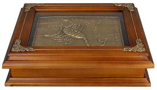 Элегантная строгая композиция, выполненная методом гальванопластики, напоминает классическое панно. Однако на деле представляет собой весьма функциональную вещь – ключницу – ящичек для хранения ключей. Декоративная часть композиции выполнена из меди (объёмный рельеф), украшена кристаллами Сваровски (Swarovski). Внутри ключницы одиннадцать крючков, отделка бархат, магнит на крышке, крышка крепится к основанию при помощи двух латунных петель, на задней стороне подвесы для крепления на стену. Корпус ключницы изготовлен из натурального дерева дуб с различными цветами тонировки.