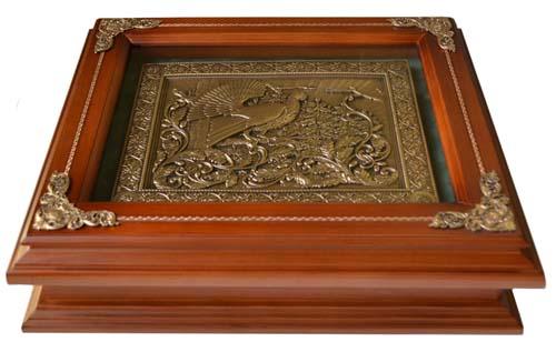 Элегантная строгая композиция, выполненная методом гальванопластики, напоминает классическое панно. Однако на деле представляет собой весьма функциональную вещь – ключницу – ящичек для хранения ключей. Декоративная часть композиции выполнена из меди (объёмный рельеф) с различными покрытиями серебрение, золочение, латунировании, применяются ювелирные эмали, кристаллы Swarovski. Внутри ключницы одиннадцать крючков, отделка бархат, магнит на крышке, крышка крепится к основанию при помощи двух латунных петель, на задней стороне подвесы для крепления на стену. Корпус ключницы изготовлен из натурального дерева дуб с различными цветами тонировки.