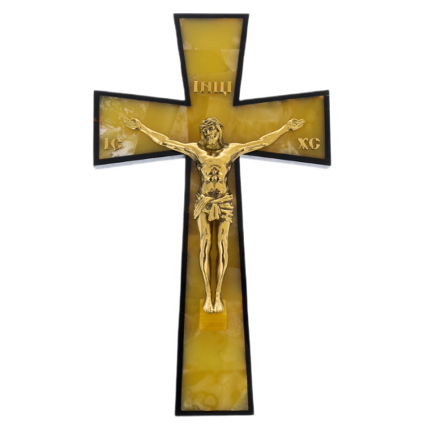 Крест выполнен в классическом стиле и имеет форму распятия. Он выглядит очень изящно и привлекательно благодаря уникальной комбинации материалов. Янтарь, который является основным украшением креста, придает ему особый шарм и теплоту. Каждый камень янтаря имеет свою неповторимую текстуру и оттенок, что делает каждый крест уникальным.