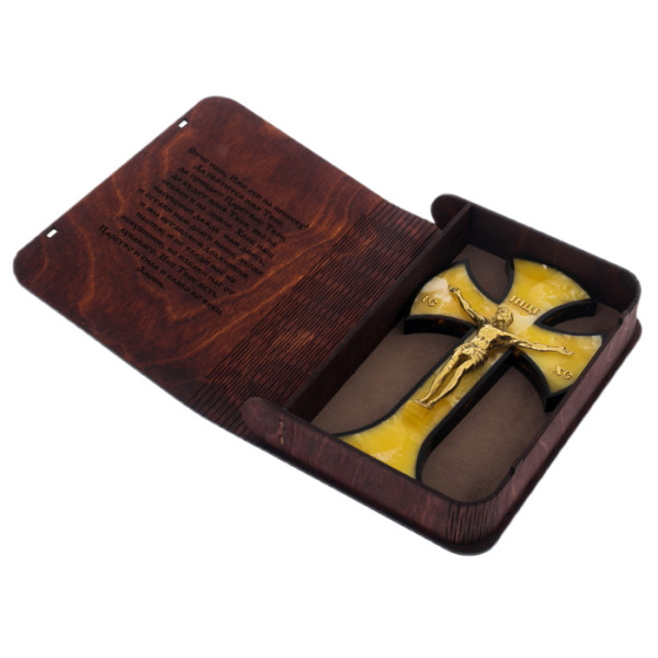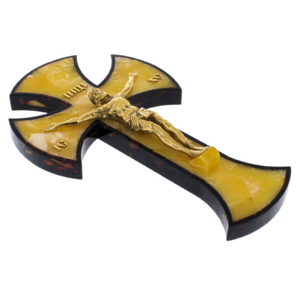 Крест выполнен в классическом стиле и имеет форму распятия. Он выглядит очень изящно и привлекательно благодаря уникальной комбинации материалов. Янтарь, который является основным украшением креста, придает ему особый шарм и теплоту. Каждый камень янтаря имеет свою неповторимую текстуру и оттенок, что делает каждый крест уникальным.